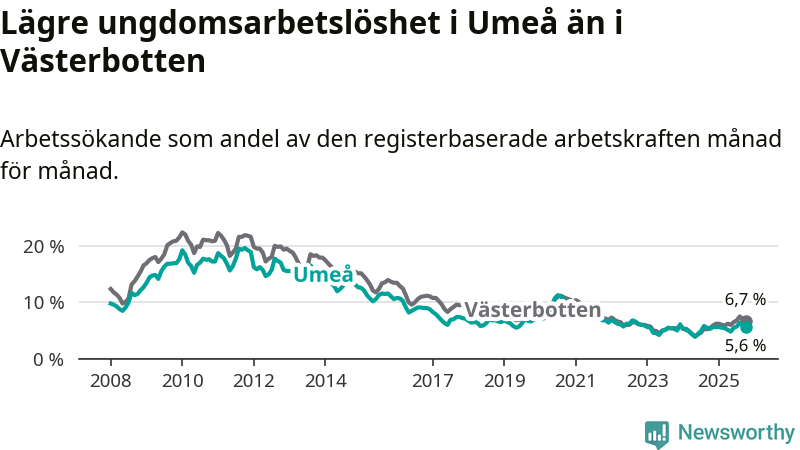 Precis som den totala arbetslösheten ligger ungdomsarbetslösheten i Umeå lägre än i Västerbotten som helhet. Skillnaden mellan kommunen och länet är 1,1 procentenheter.