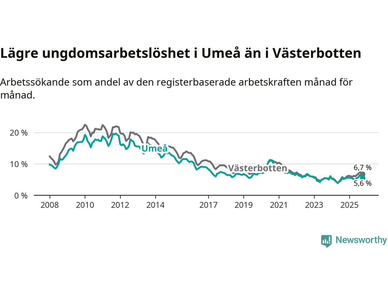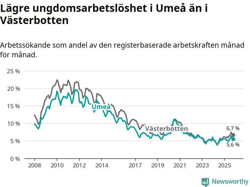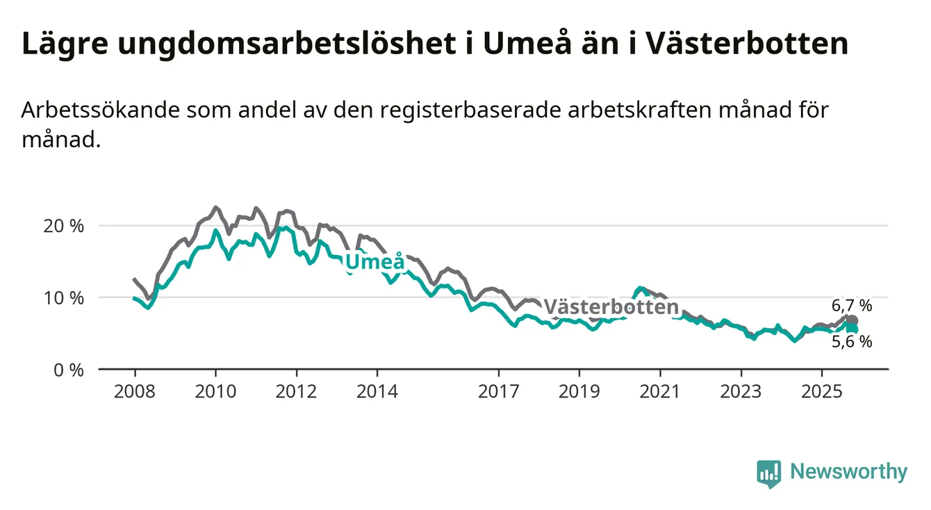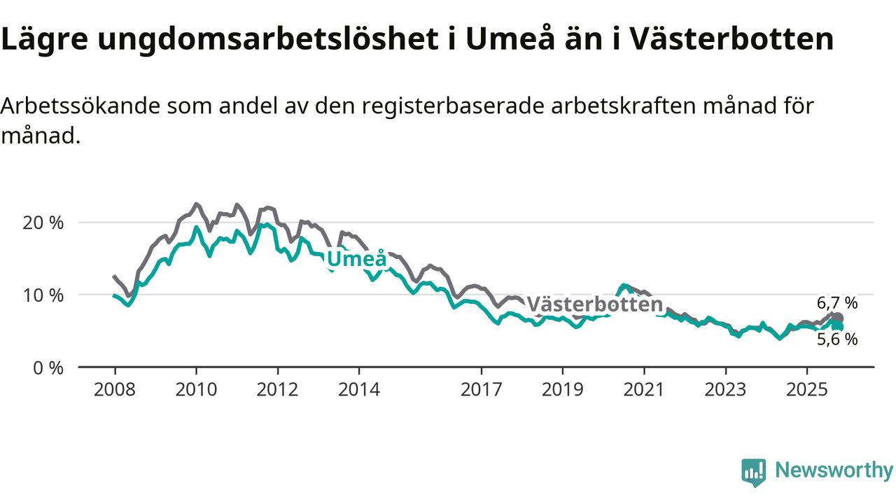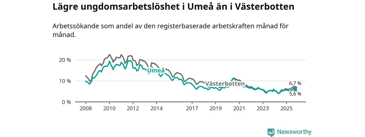 Graf: Arbetslöshet bland unga i Umeå kommun och Västerbottens län