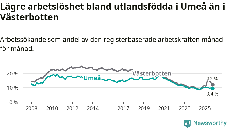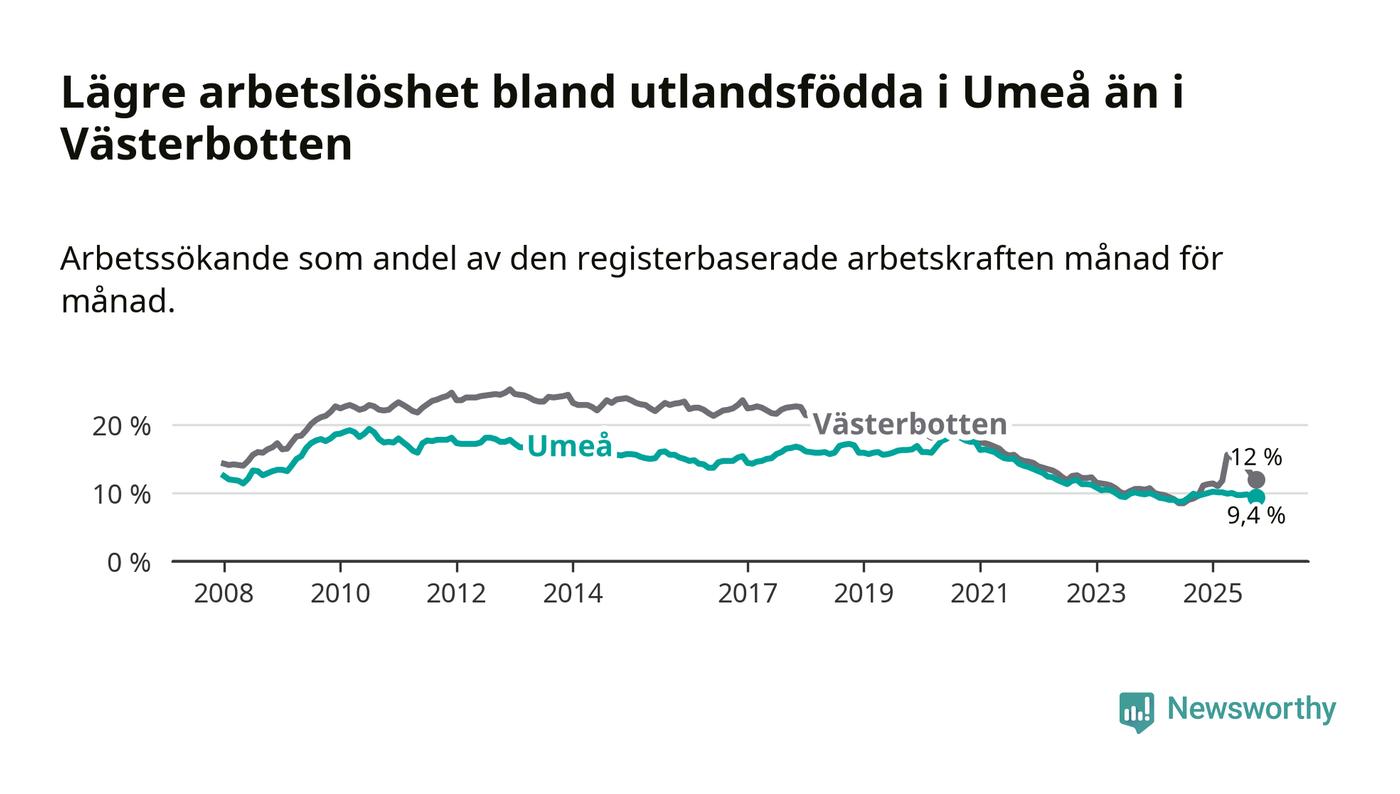 Medan arbetslösheten bland utlandsfödda alltså minskar i Umeå så ökar den i Västerbotten. Jämfört med oktober förra året har andelen arbetslösa utlandsfödda i länet ökat med 2,4 procentenheter (till 12,0 procent).