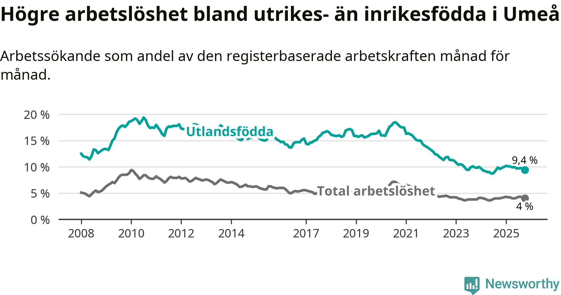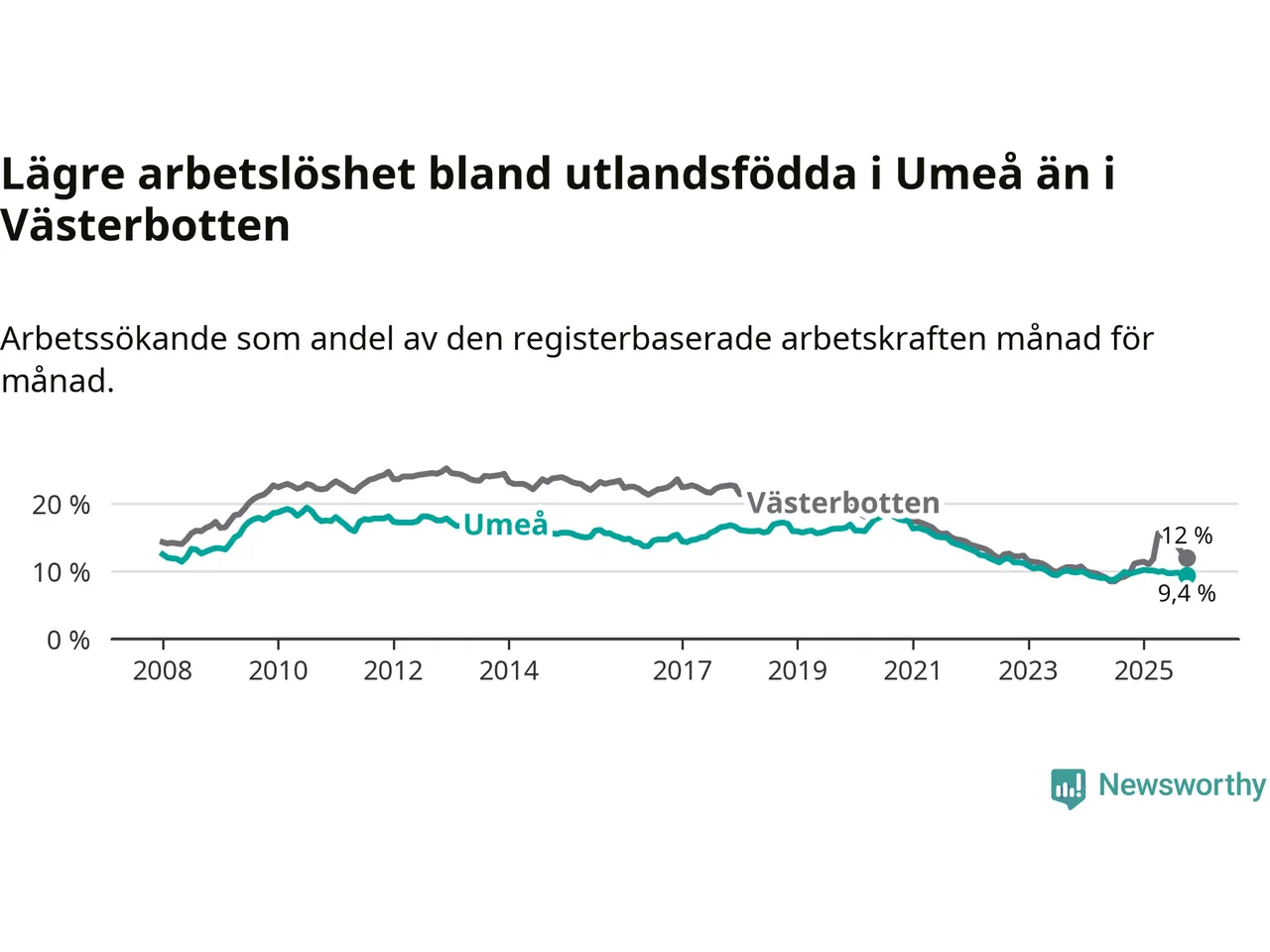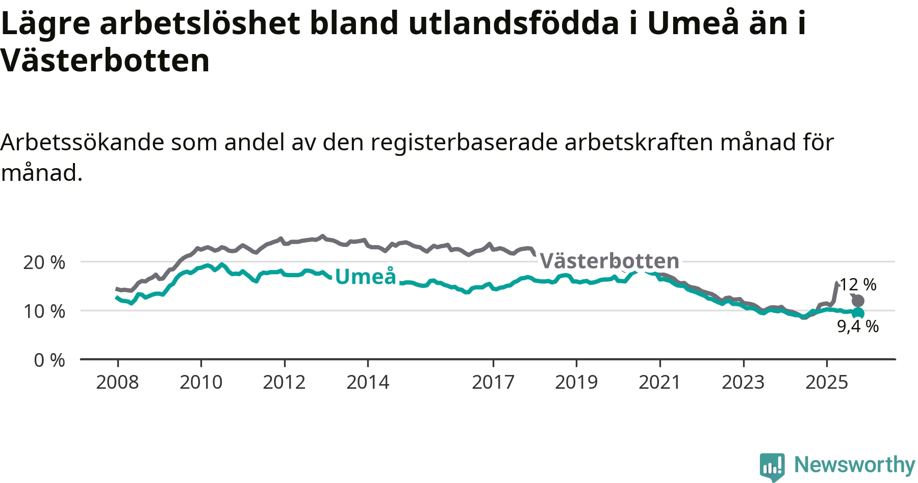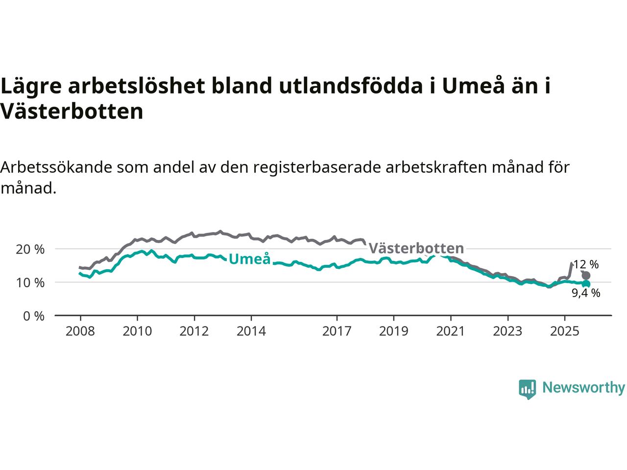 Graf: Arbetslöshet bland utrikesfödda i Umeå kommun och Västerbottens län
