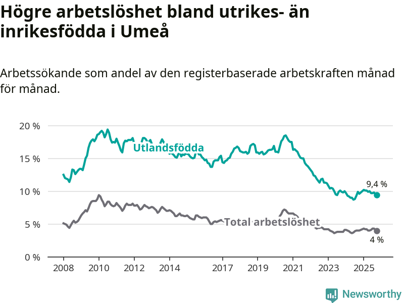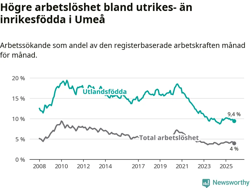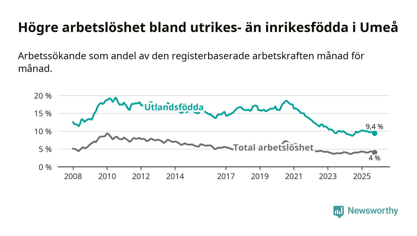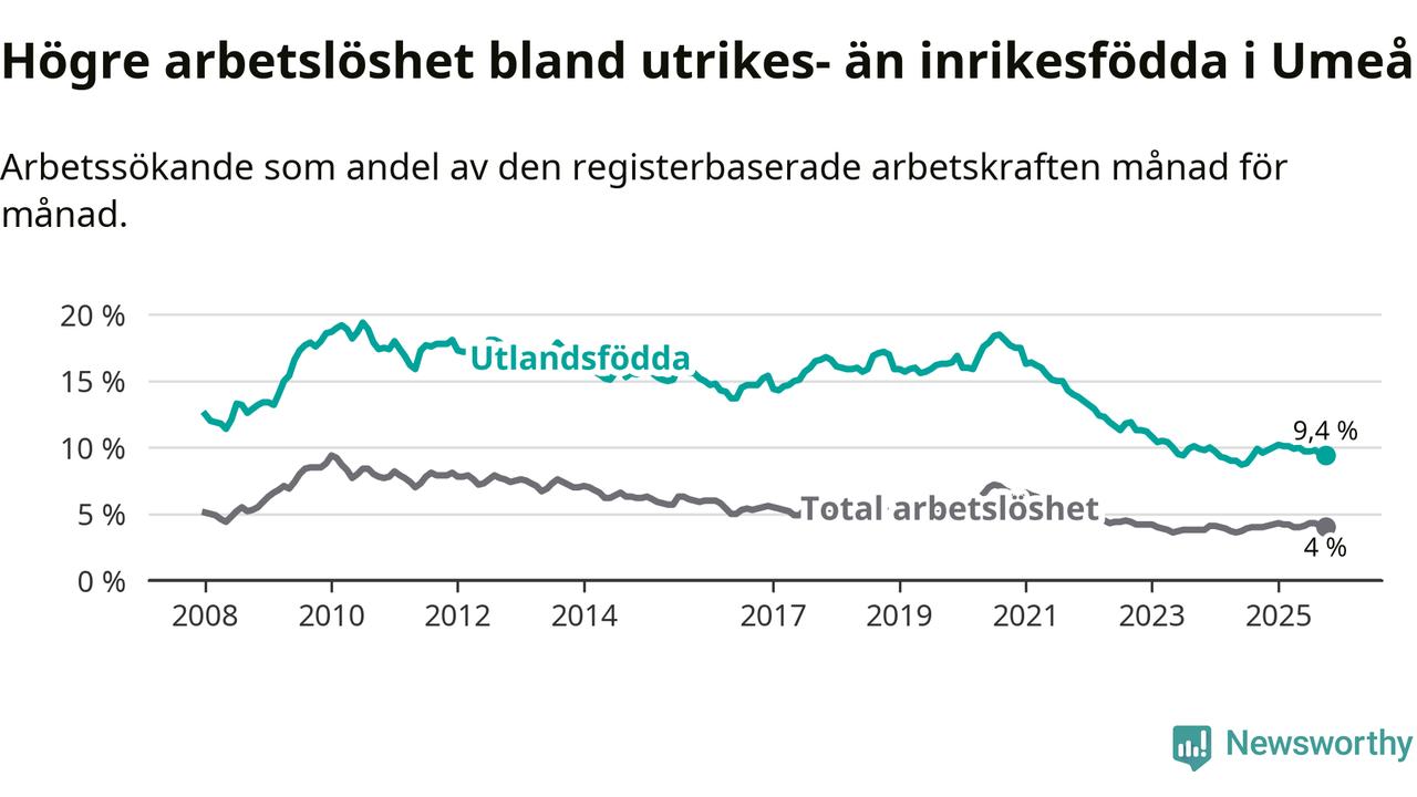 Arbetslösheten bland utlandsfödda var 9,4 procent i Umeå under oktober månad, motsvarande 1 051 av 11 181 personer. Det är 0,2 procentenheter färre än vid samma tidpunkt i fjol (+7 om man räknar personer).