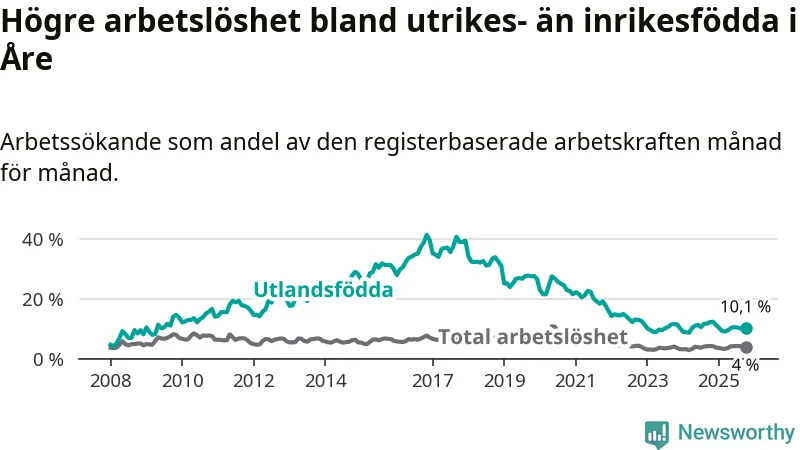 Arbetslösheten bland utlandsfödda var 10,1 procent i Åre under oktober månad, motsvarande 89 av 881 personer. Det är 2,1 procentenheter färre än vid samma tidpunkt i fjol (−18 om man räknar personer). Därmed är de utlandsföddas arbetslöshet lägre än vid samma tidpunkt i fjol för sjunde månaden i följd. Sedan mars har arbetslösheten bland utlandsfödda minskat från 9,0 till 10,1 procent.