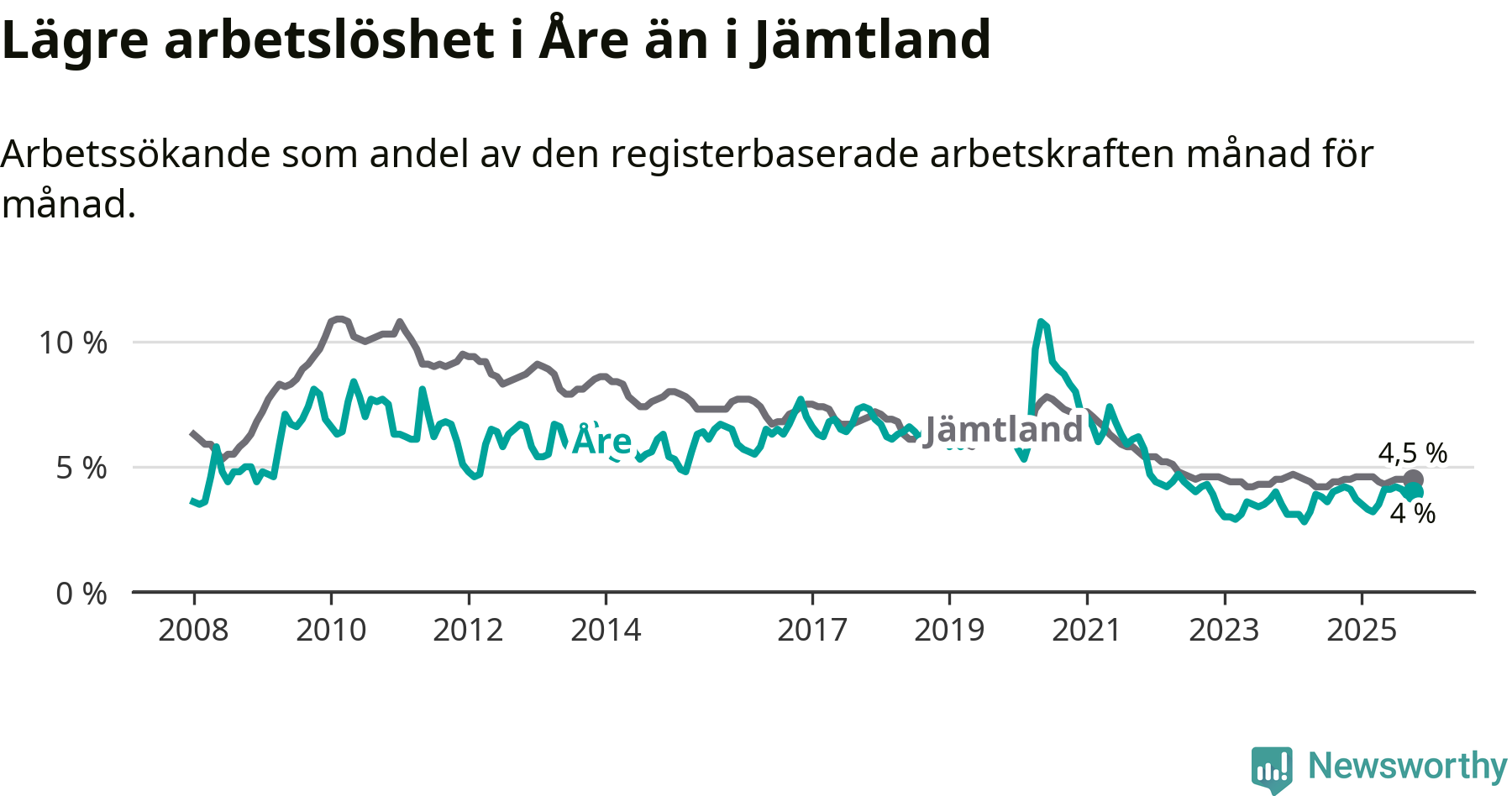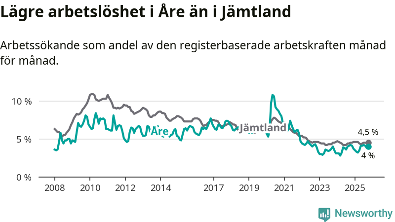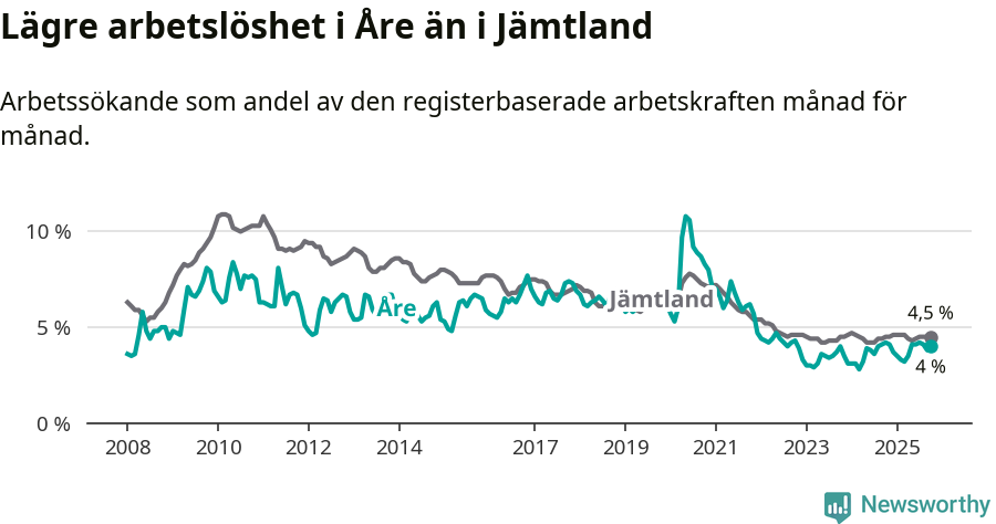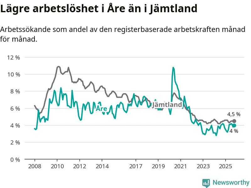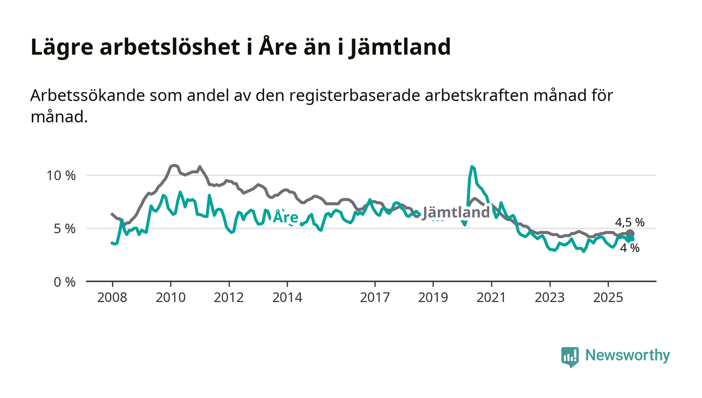 Åre hade redan tidigare lägre arbetslöshet än snittet i hela Jämtlands län och nu växer klyftan (4,0 procent i kommunen, jämfört med 4,5 procent i hela länet). Krokom har den lägsta arbetslösheten i länet (2,9 procent), medan Strömsund har den högsta (6,0 procent). För att Åre skulle komma ner i samma arbetslöshetsnivå som Krokom skulle 76 personer behöva sysselsättas.