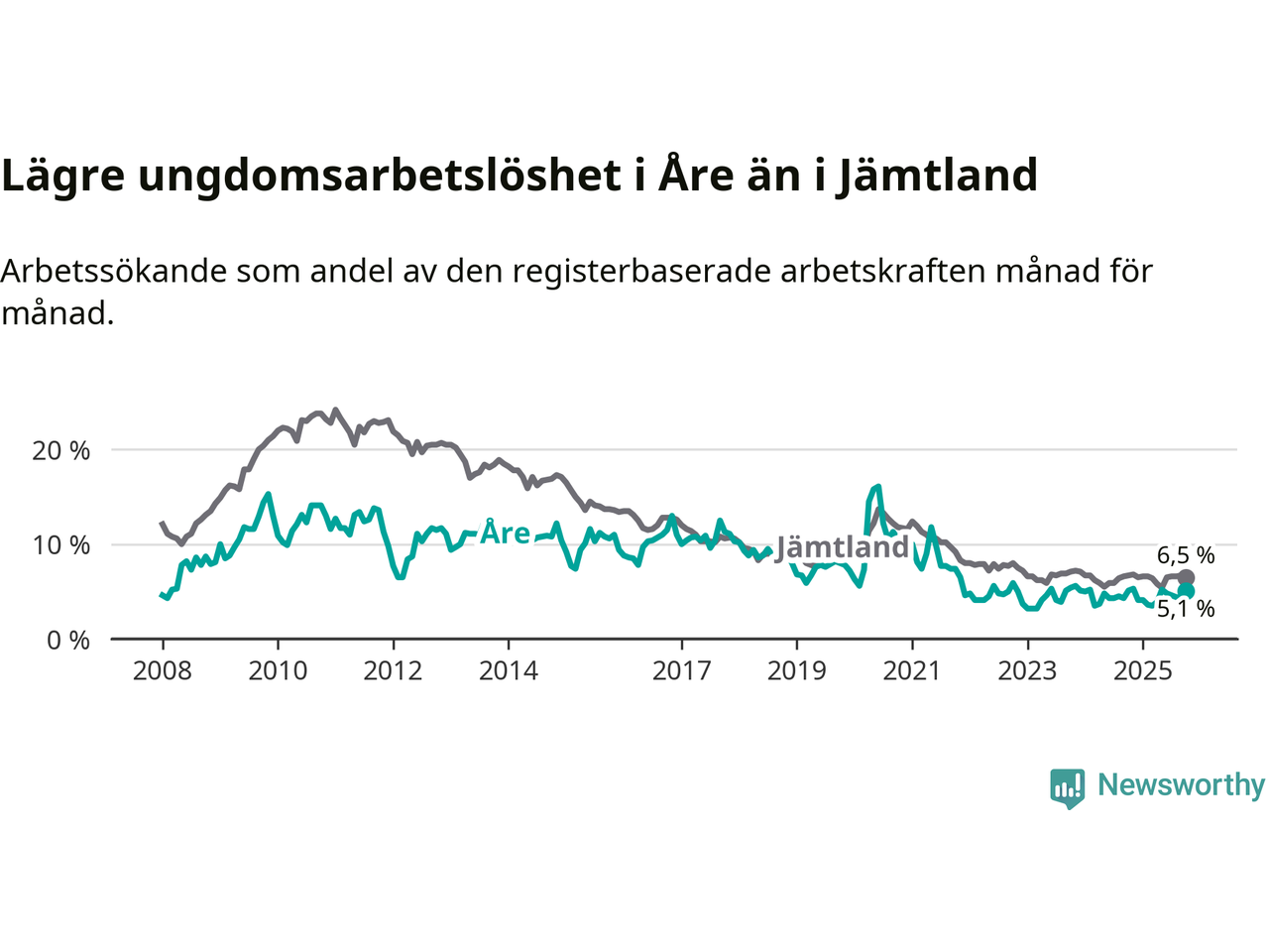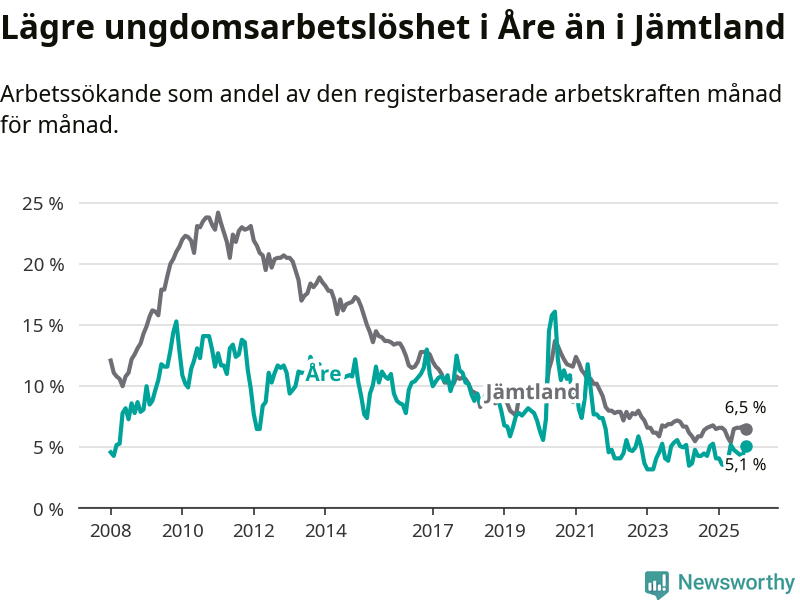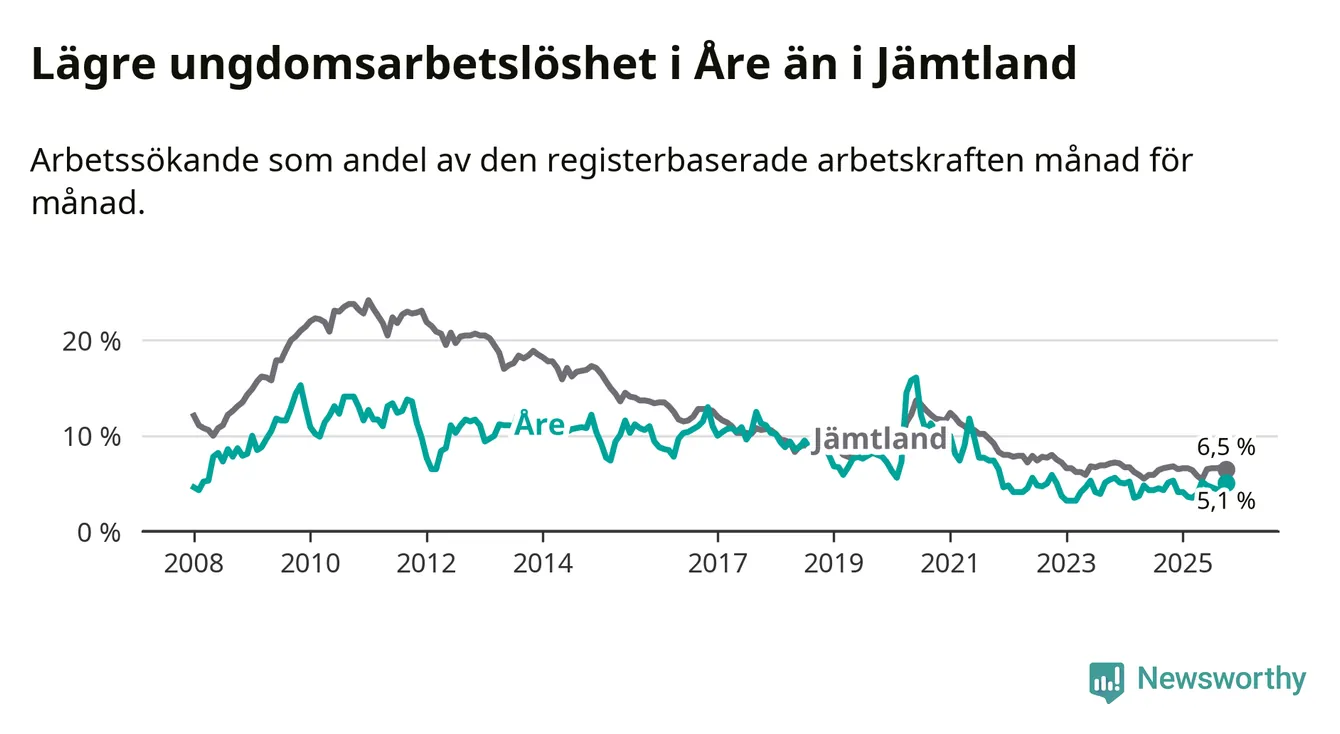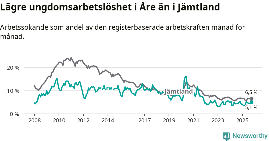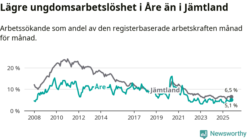 Precis som den totala arbetslösheten ligger ungdomsarbetslösheten i Åre lägre än i Jämtland som helhet. Skillnaden mellan kommunen och länet är 1,4 procentenheter.