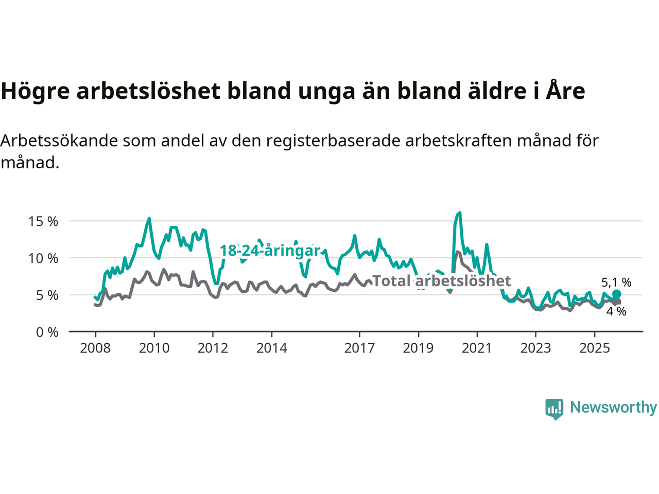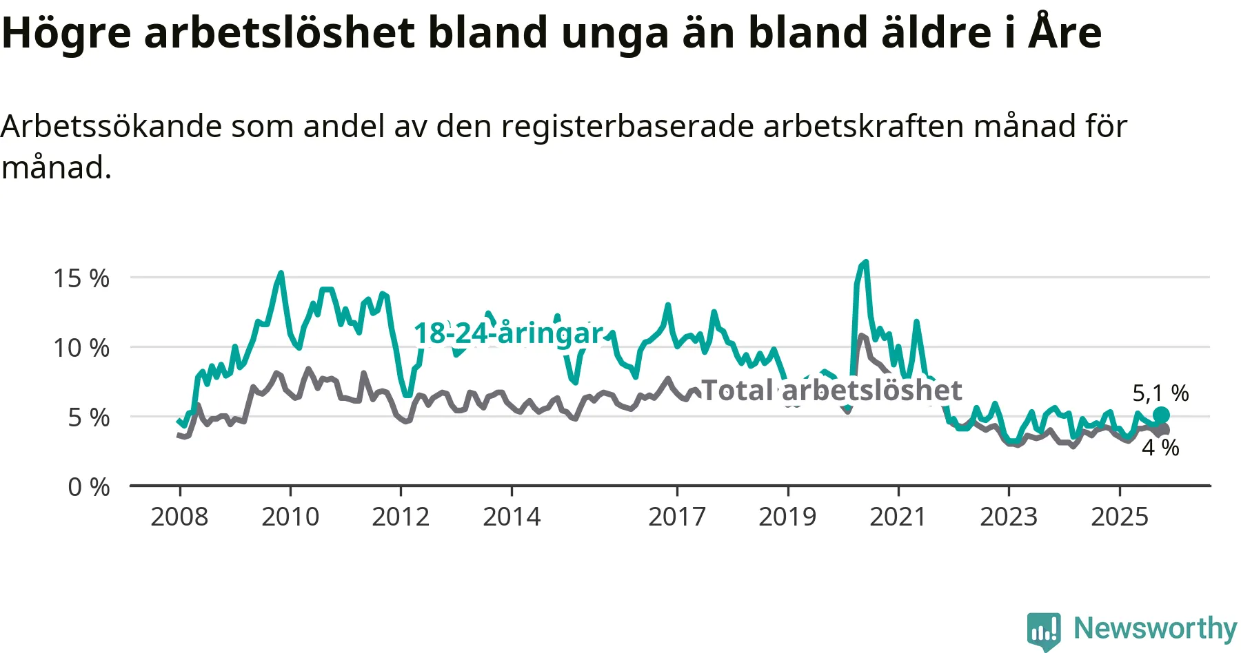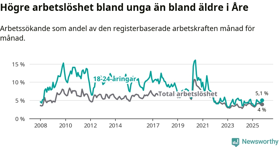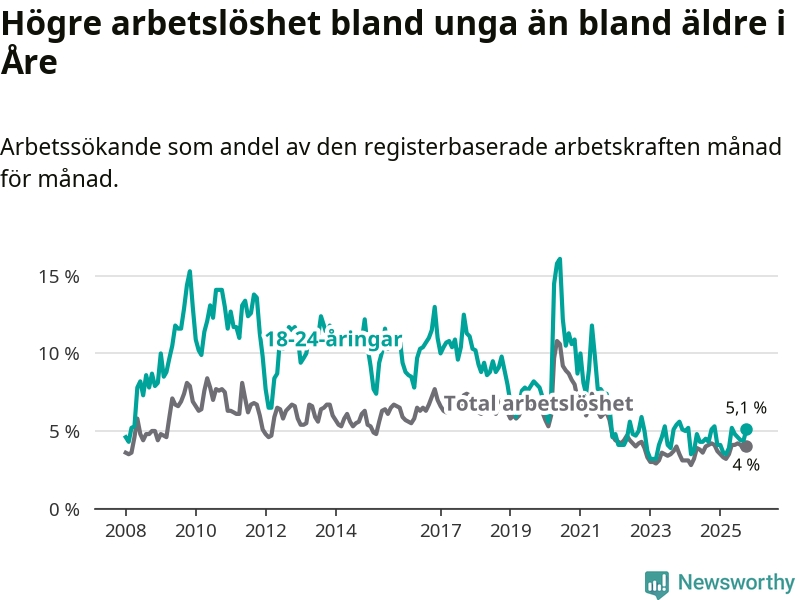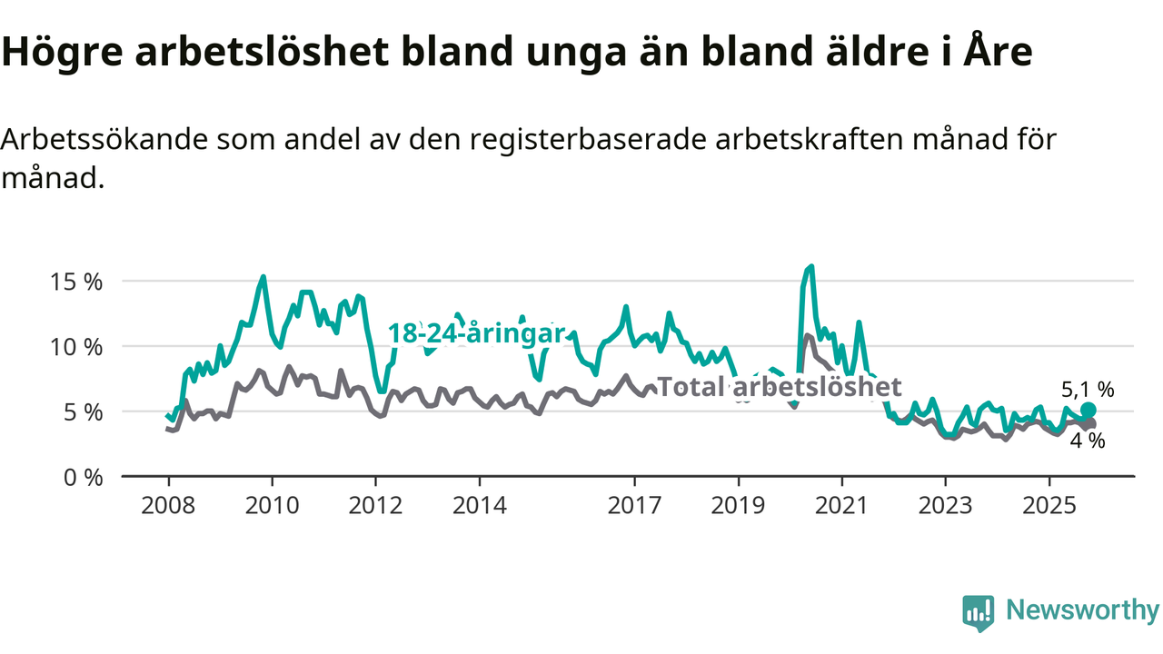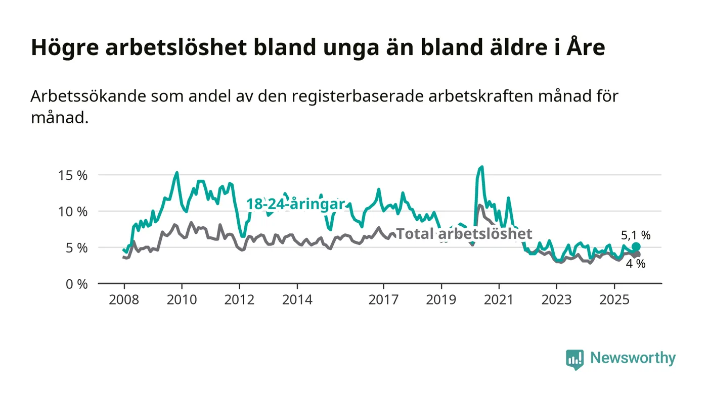 I oktober var 5,1 procent av 18–24-åringarna inskrivna som arbetssökande (motsvarande 31 personer).