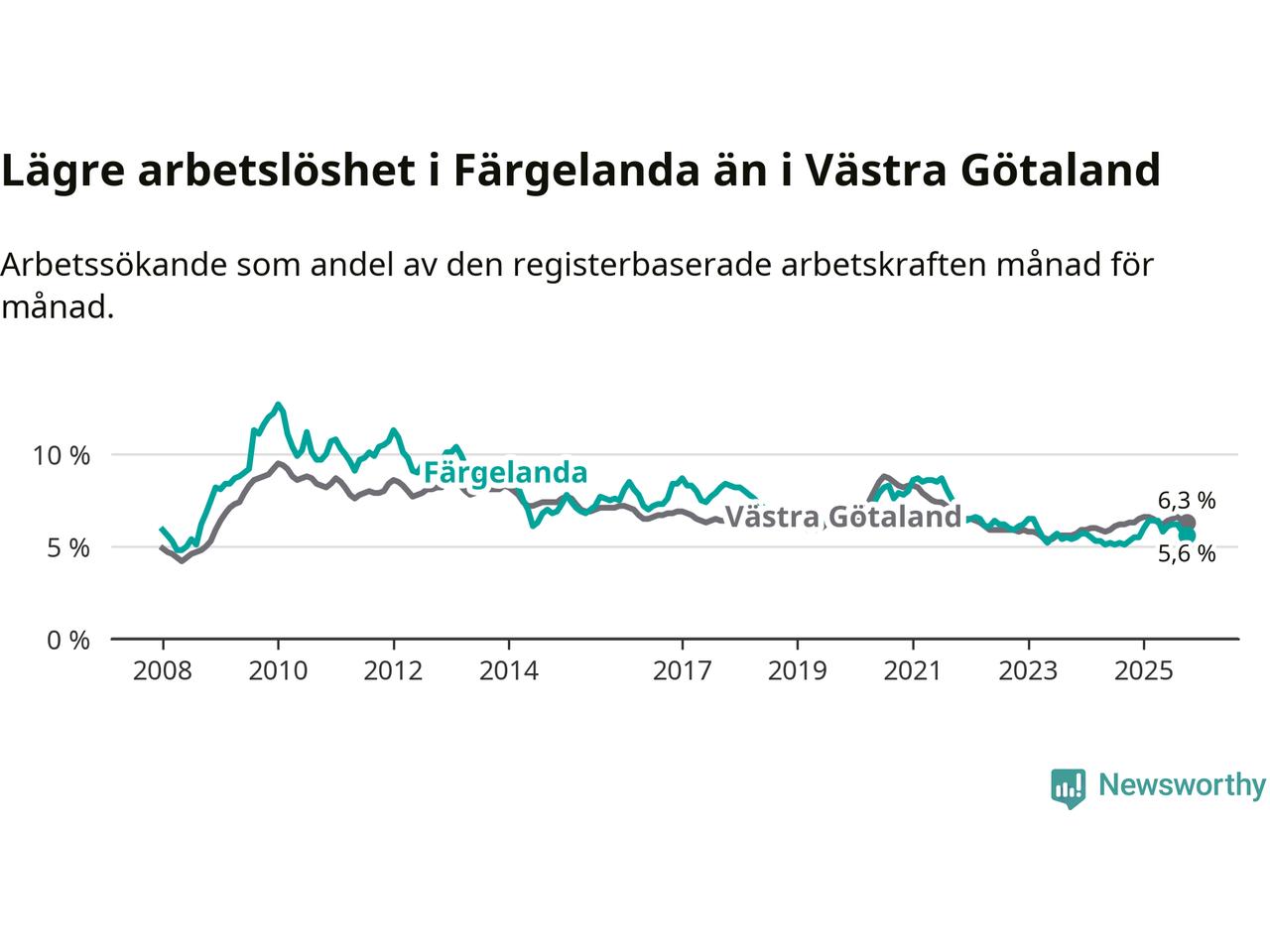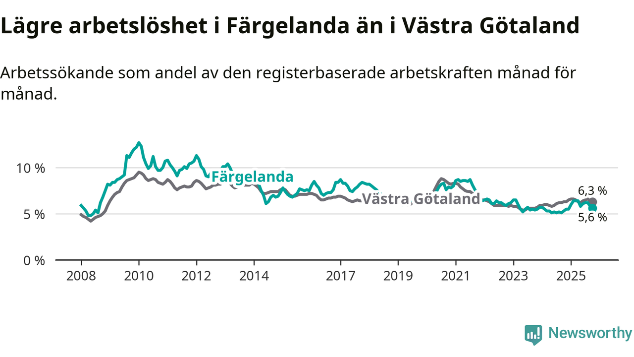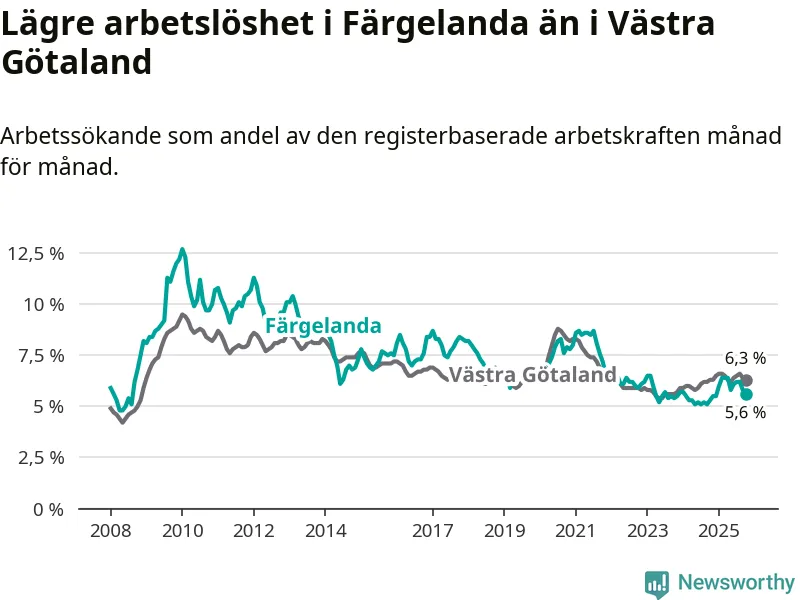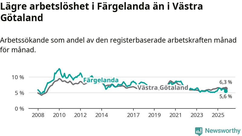 Under oktober månad rapporterade Färgelanda kommun en total arbetslöshet på 5,6 procent. Det är en ökning jämfört med samma tidpunkt i fjol (+0,3 procentenheter). I Västra Götalands län däremot står arbetslösheten stilla.