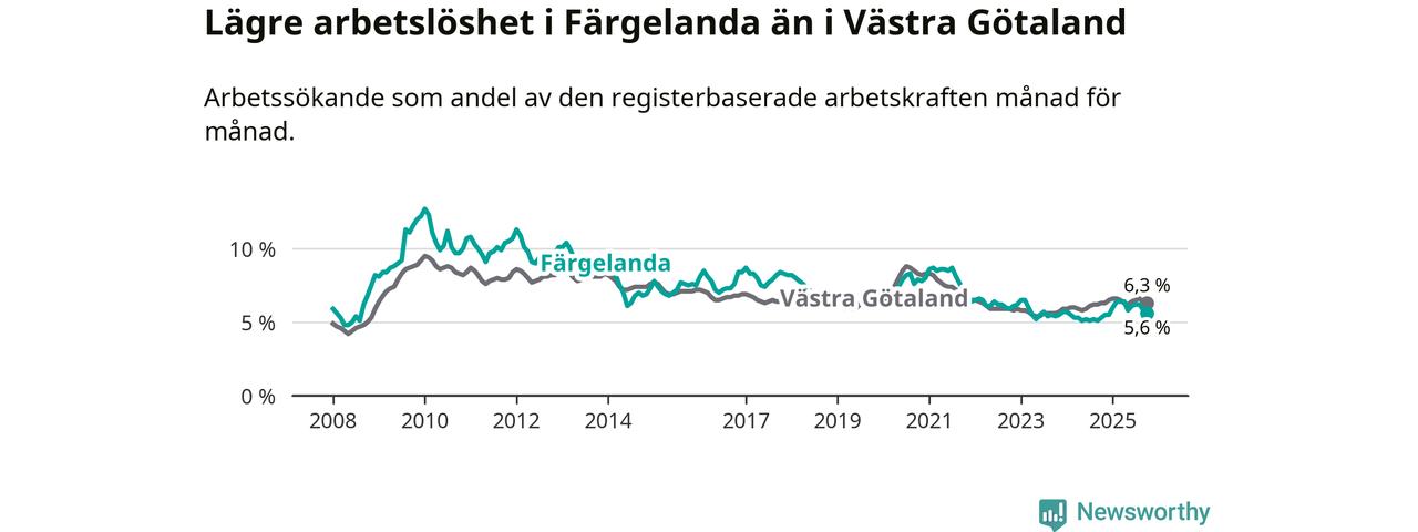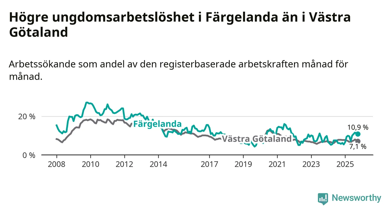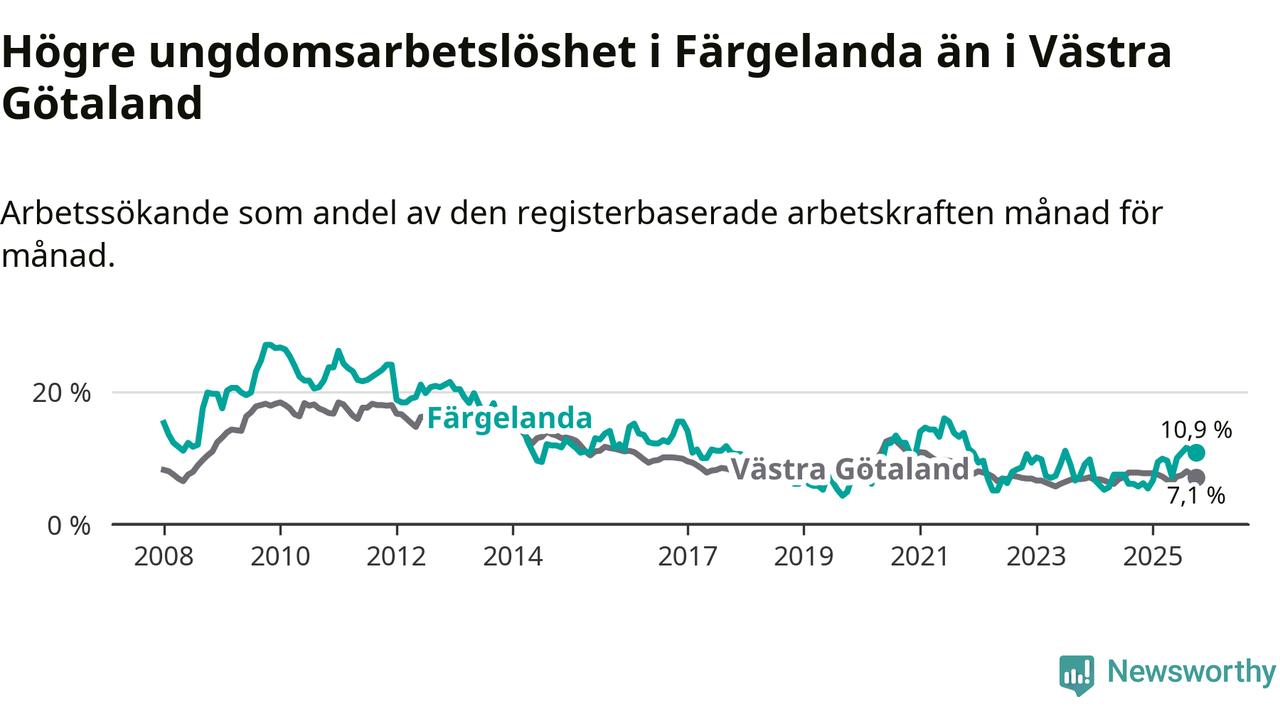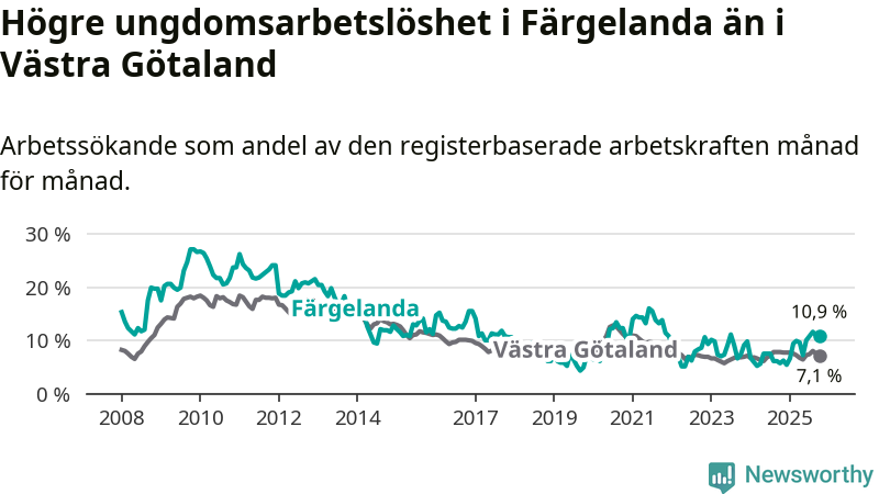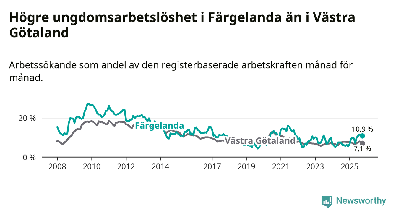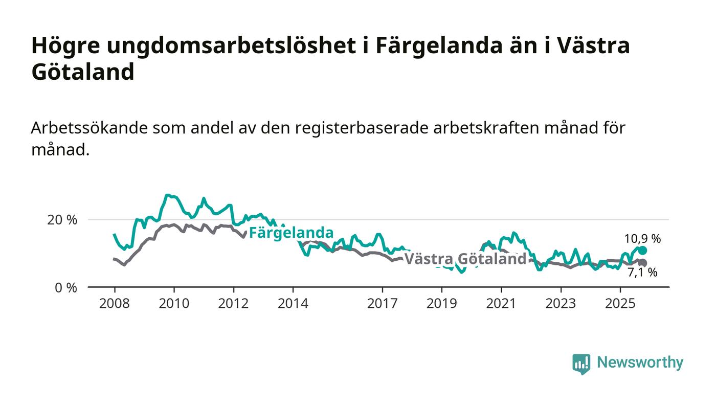 Färgelanda kommun såg under oktober en svagare utveckling på arbetsmarknaden för unga än länet. Kommunen har passerat Västra Götalands län och har nu högre ungdomsarbetslöshet.