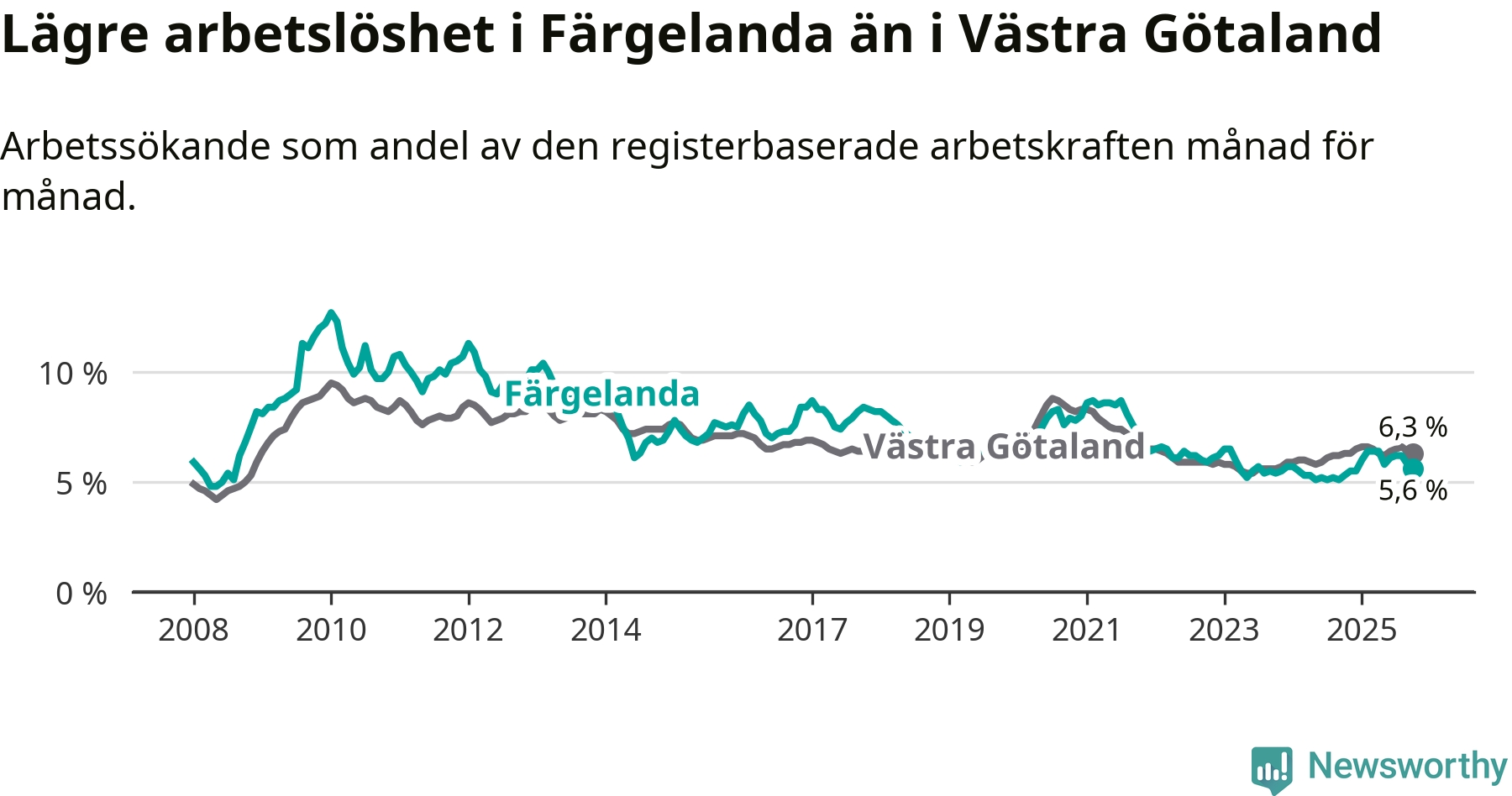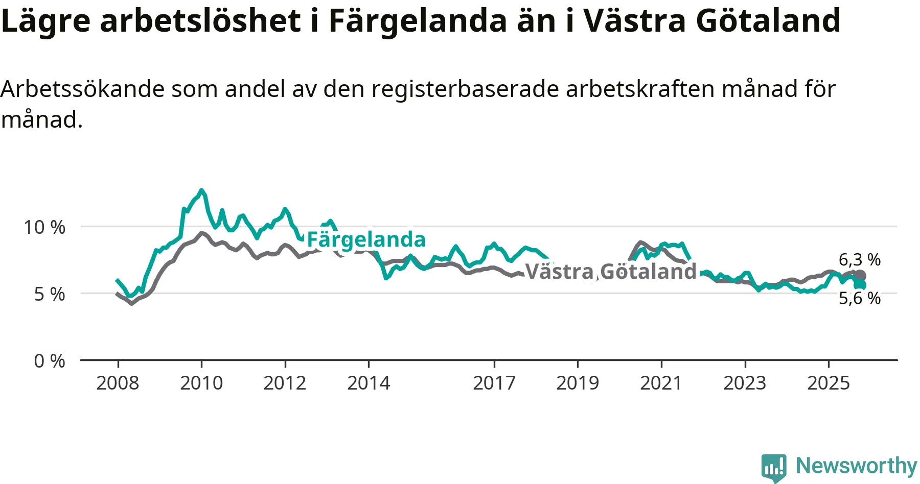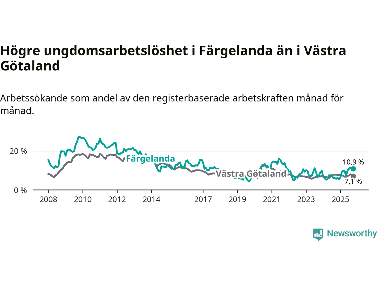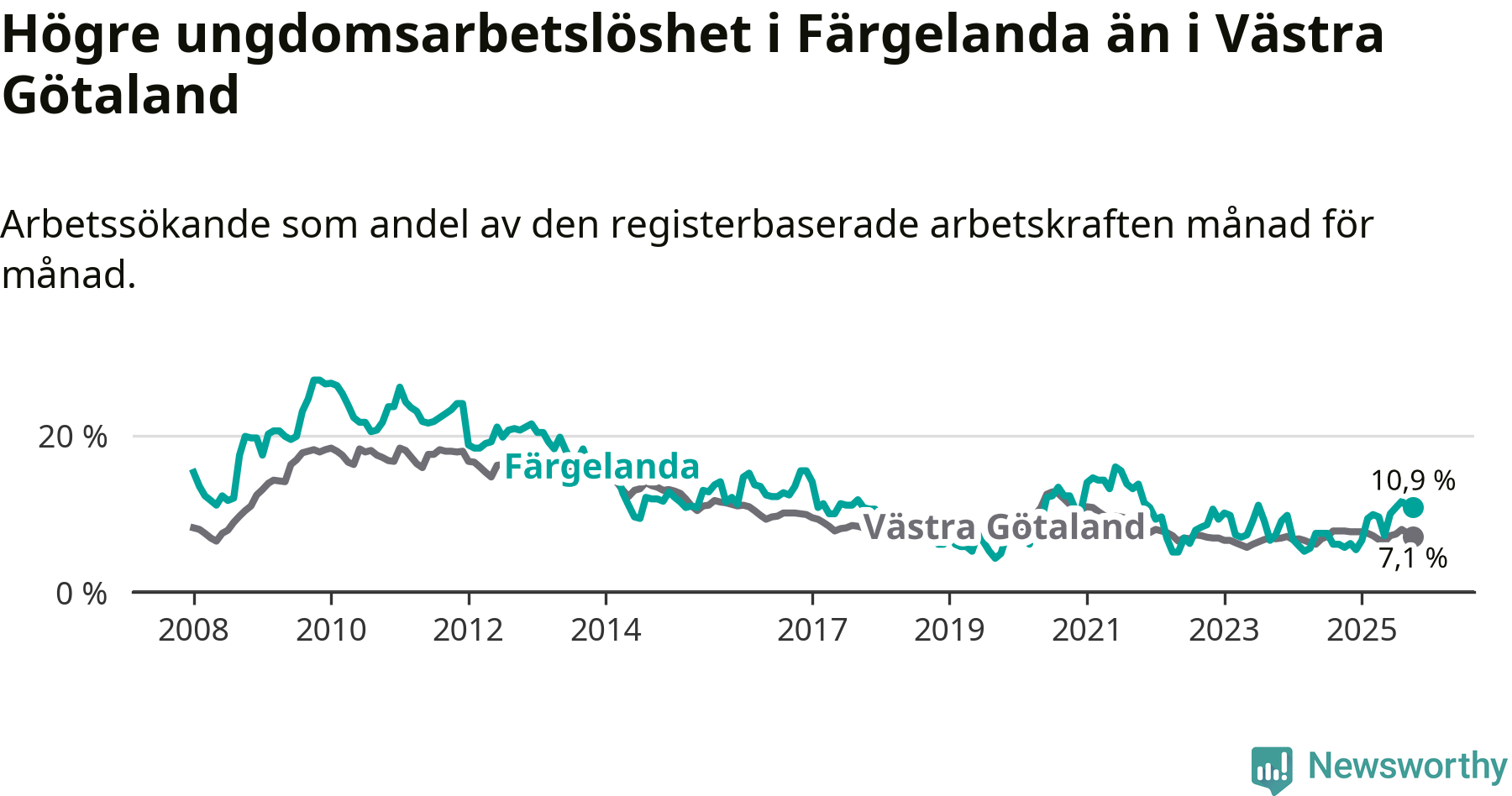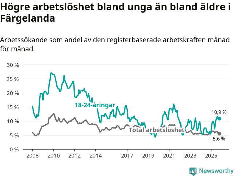Färgelanda kommun såg under oktober en svagare utveckling på arbetsmarknaden för unga än länet. Kommunen har passerat Västra Götalands län och har nu högre ungdomsarbetslöshet.
