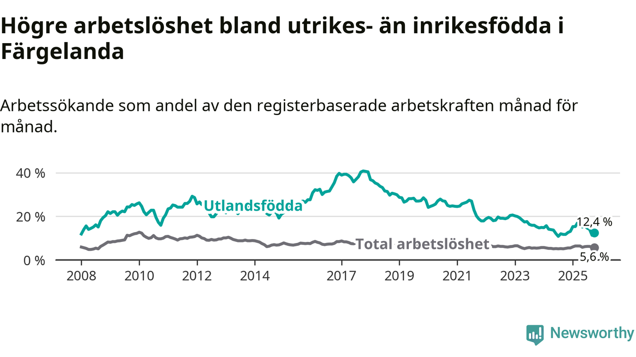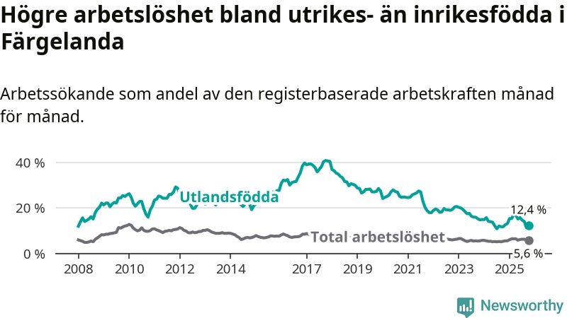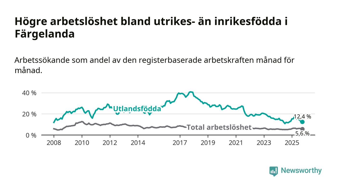 Arbetslösheten bland utlandsfödda var 12,4 procent i Färgelanda under oktober månad, motsvarande 45 av 363 personer. Det är 0,7 procentenheter fler än vid samma tidpunkt i fjol (+2 om man räknar personer). Den senaste månadens uppgång innebär ett trendbrott. Under de ett föregående månaderna hade arbetslösheten bland utlandsfödda varit lägre än motsvarande tidpunkt året innan.