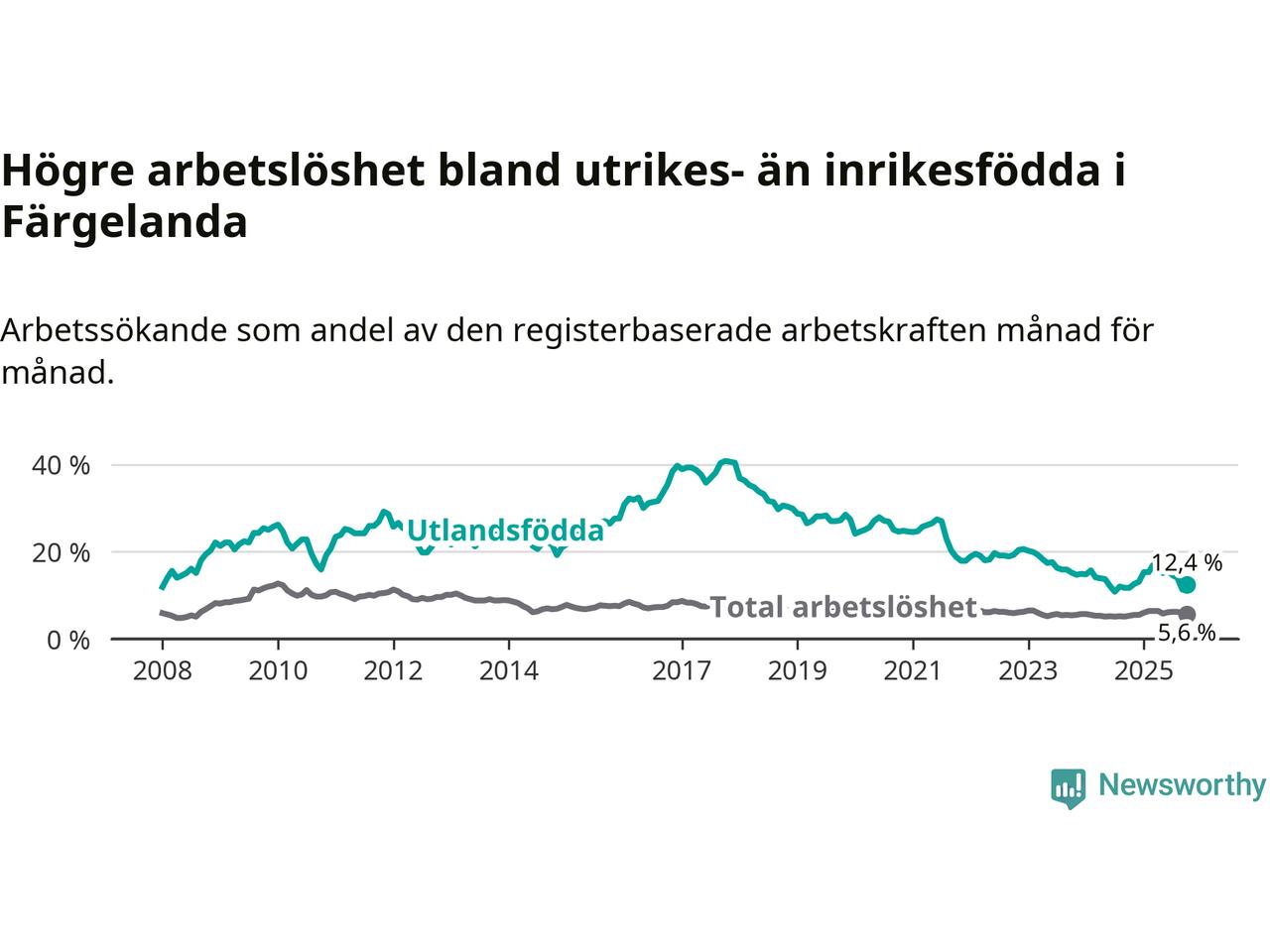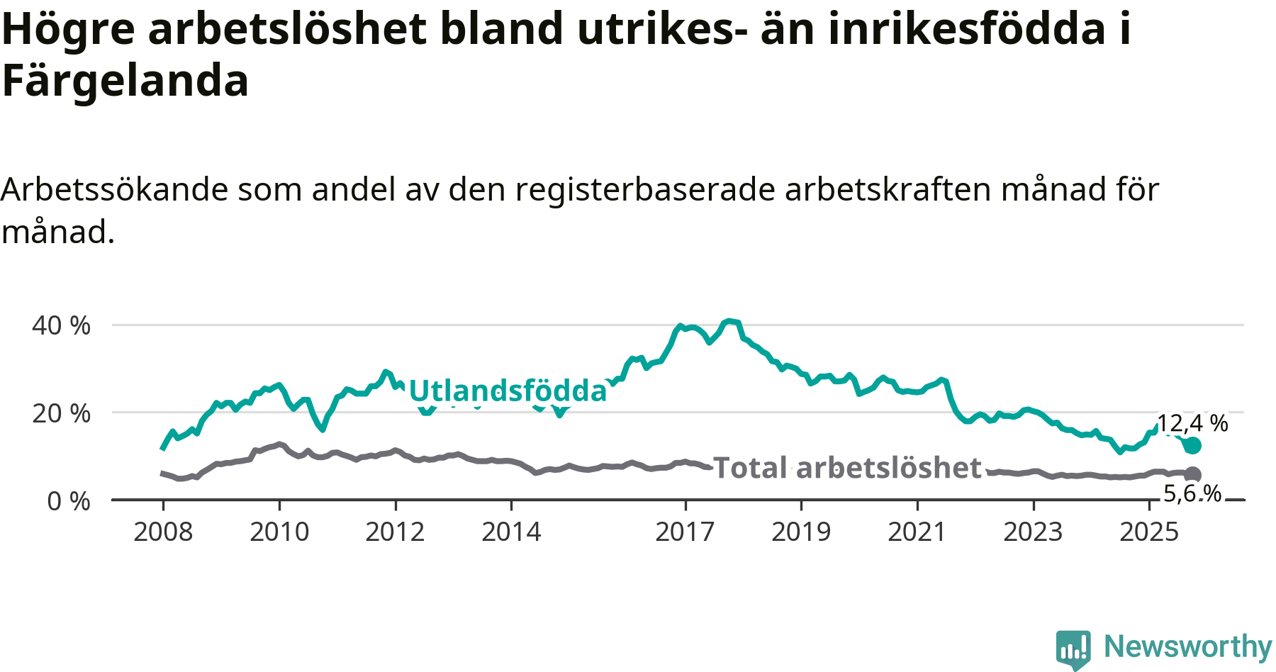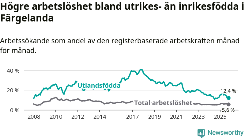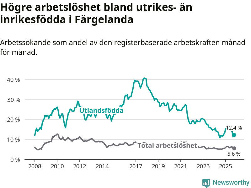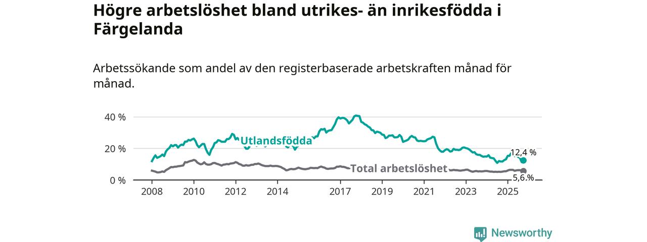 | Bland utlandsfödda | 12,4 % | +0,7 % ▲ | 13,5 % | −0,5 % ▼ | 14,5 % | −0,8 % ▼ |