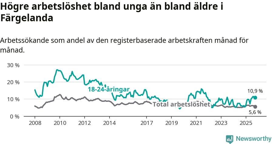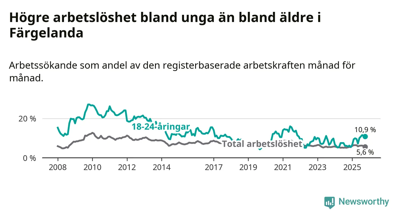 Den senaste månadsstatistiken från Arbetsförmedlingen visar på en uppgång i ungdomsarbetslöshet i Färgelanda kommun med 5,2 procentenheter. Arbetslösheten bland personer i åldern 18–24 år låg i oktober på 10,9 procent.