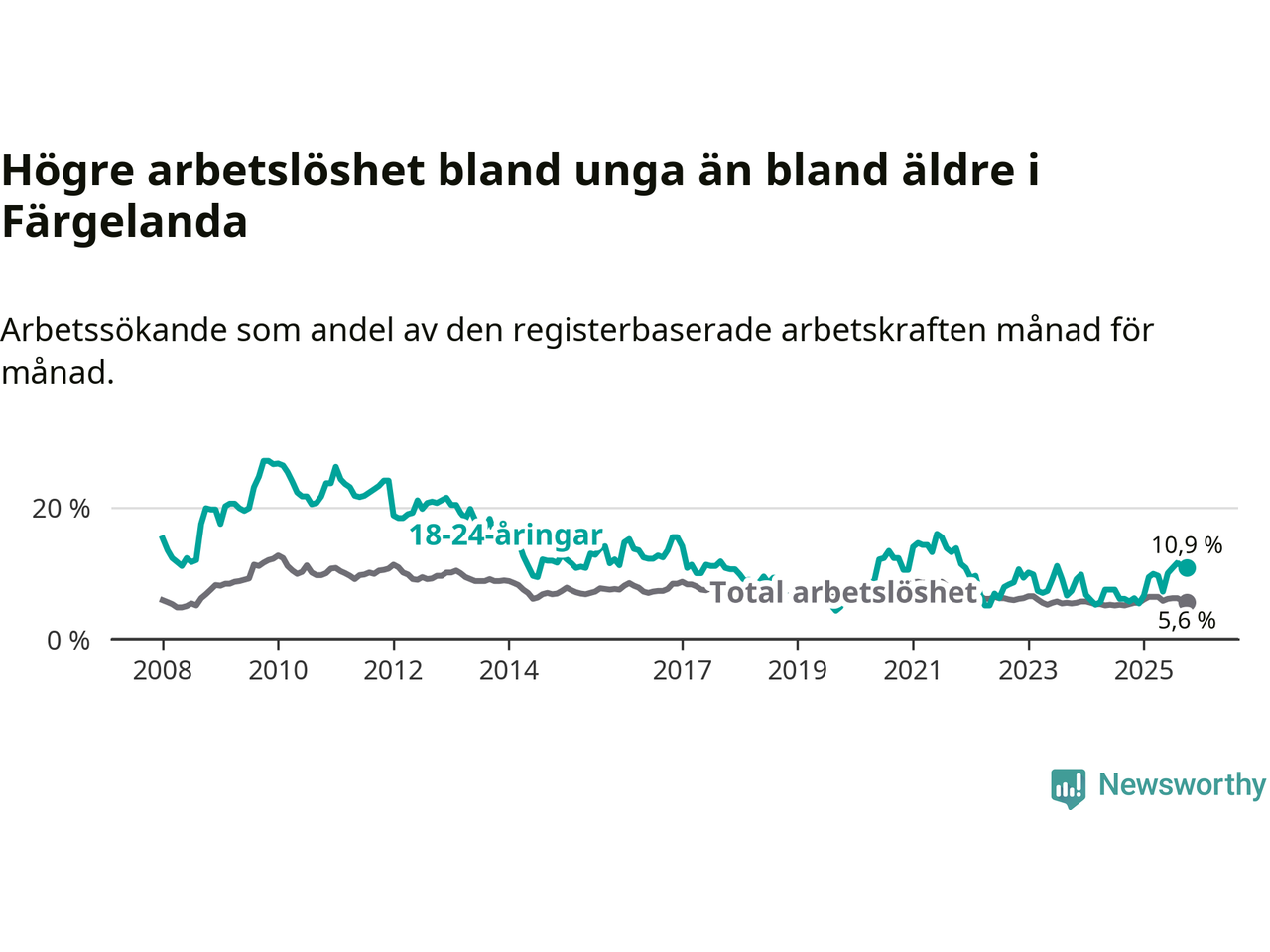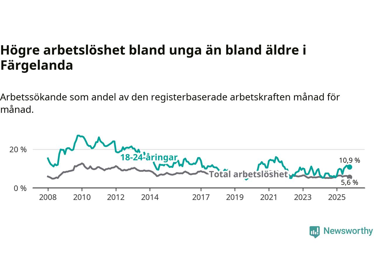 Precis som den totala arbetslösheten stiger arbetslösheten bland unga (+5,2 procentenheter). I oktober var 10,9 procent av 18–24-åringarna inskrivna som arbetssökande (motsvarande 27 personer). Mäter vi antalet inskrivna ser vi en ökning med tolv personer på ett års sikt.