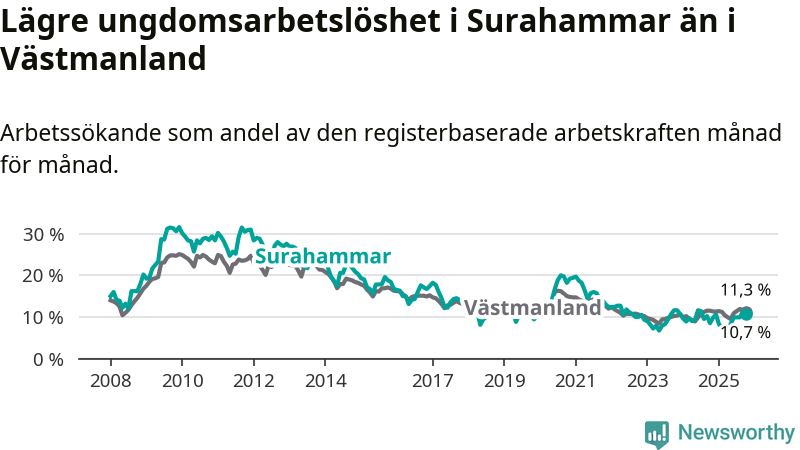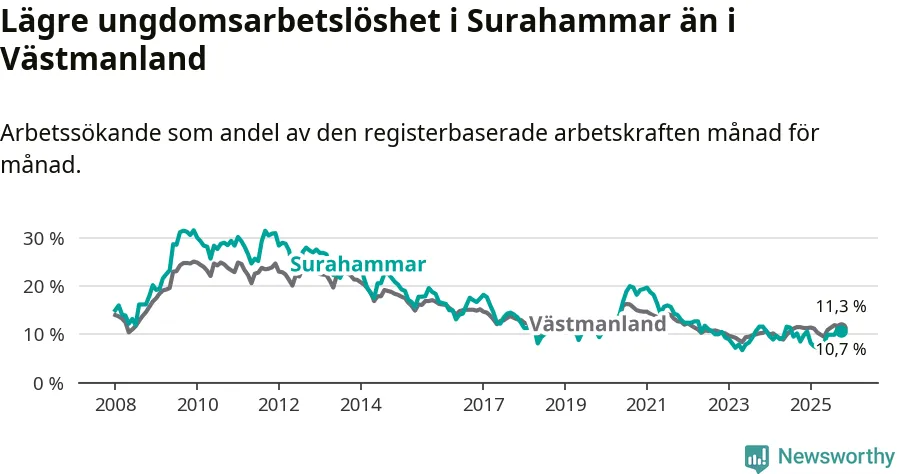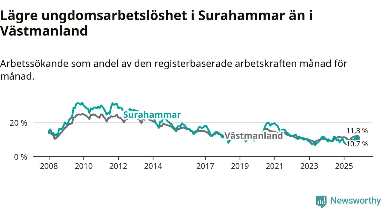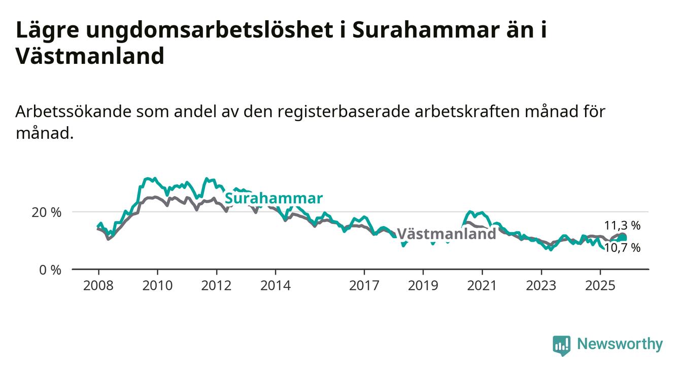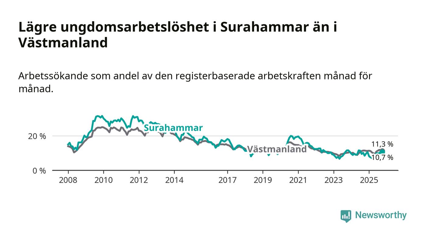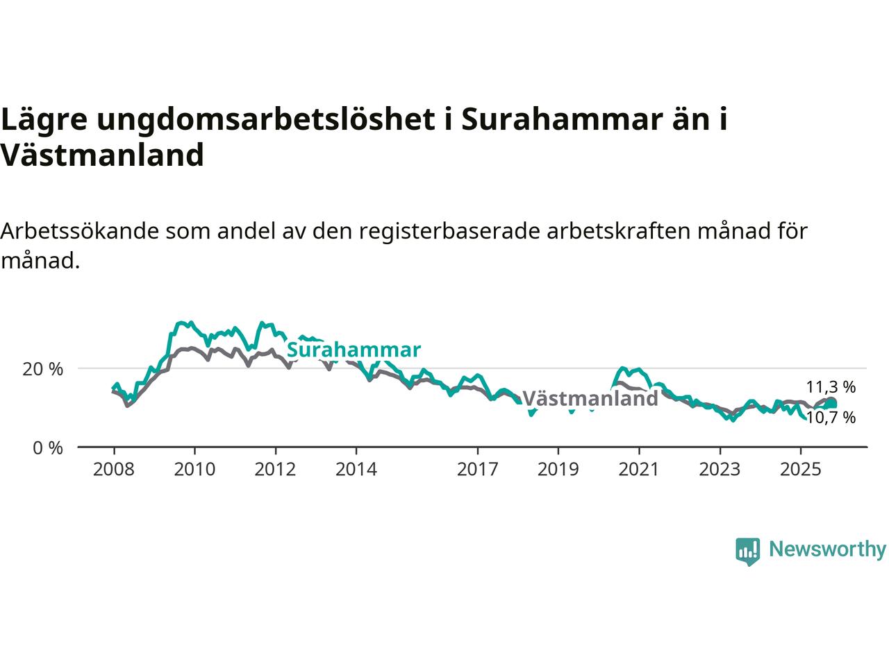 Precis som den totala arbetslösheten ligger ungdomsarbetslösheten i Surahammar lägre än i Västmanland som helhet. Skillnaden mellan kommunen och länet är 0,6 procentenheter.