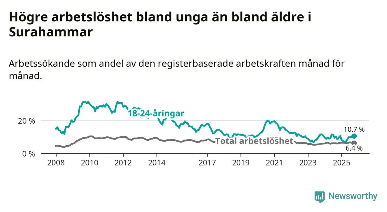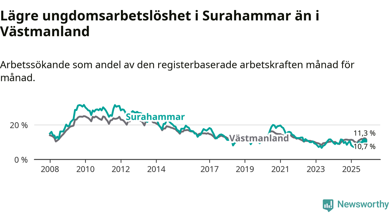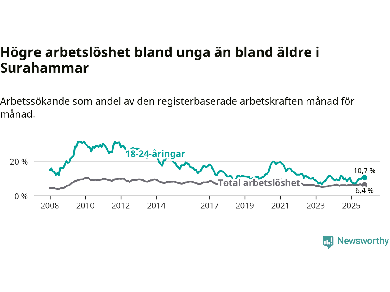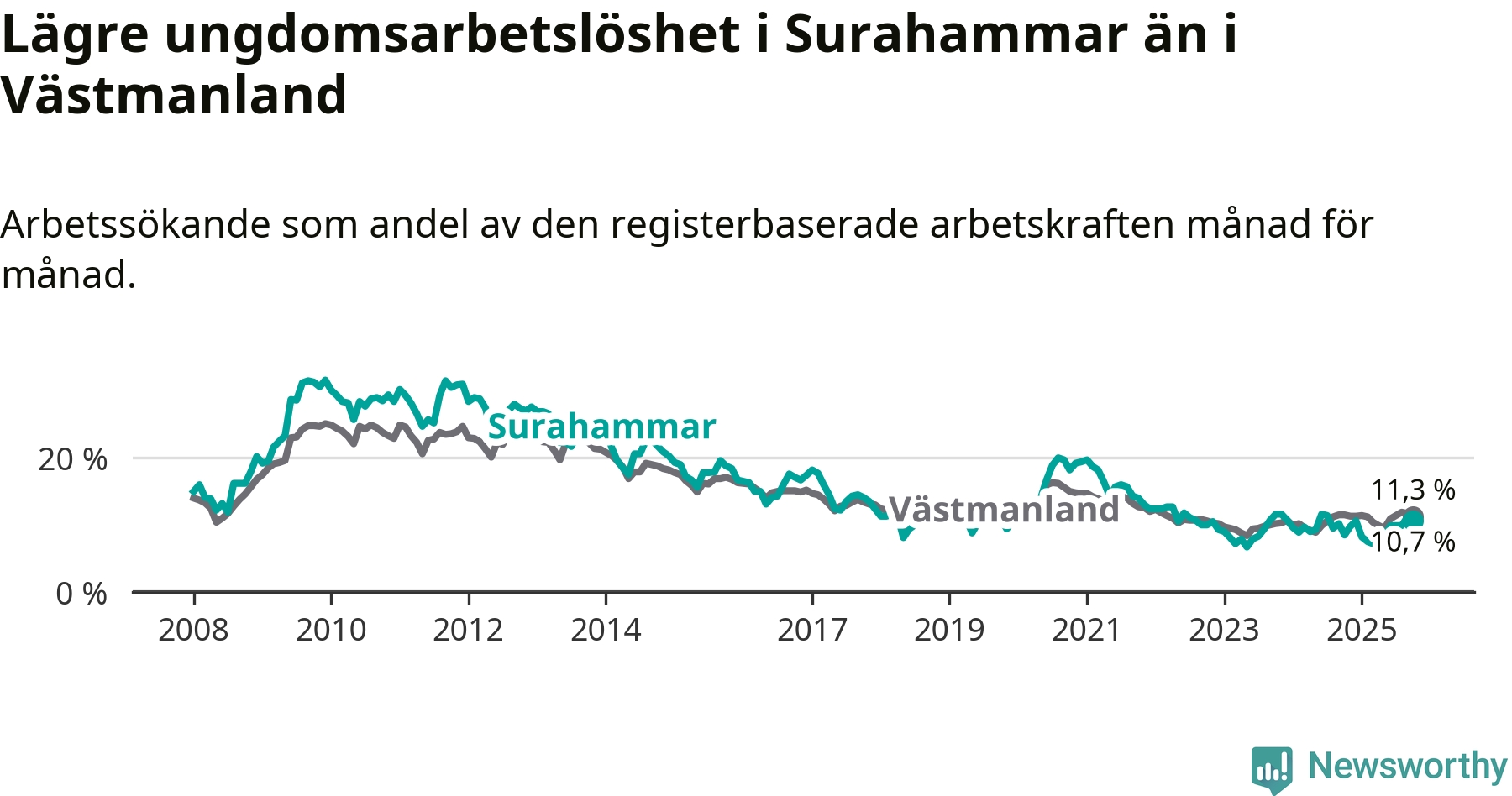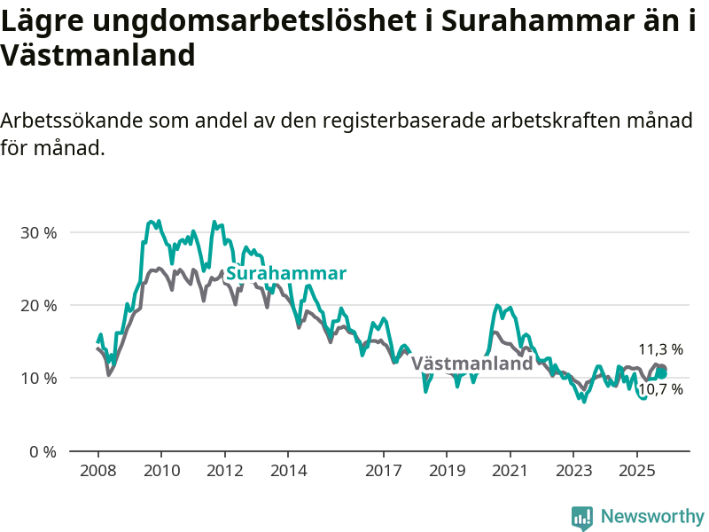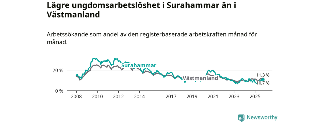 Precis som den totala arbetslösheten ligger ungdomsarbetslösheten i Surahammar lägre än i Västmanland som helhet. Skillnaden mellan kommunen och länet är 0,6 procentenheter.