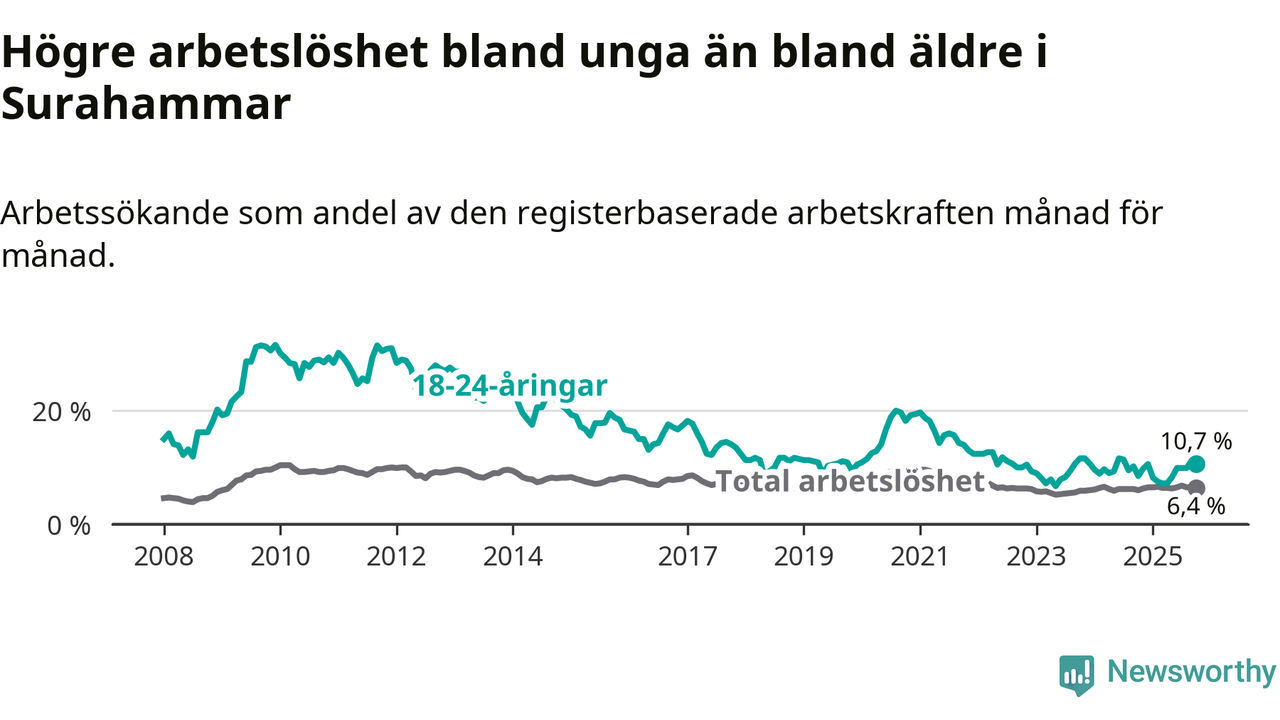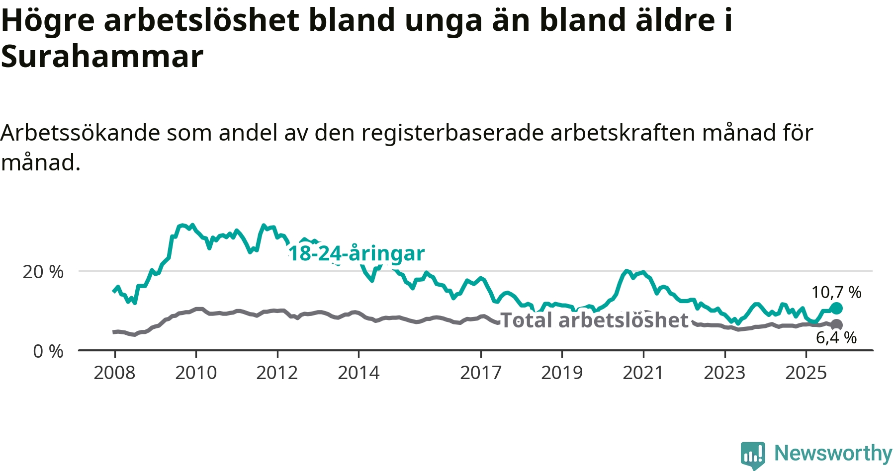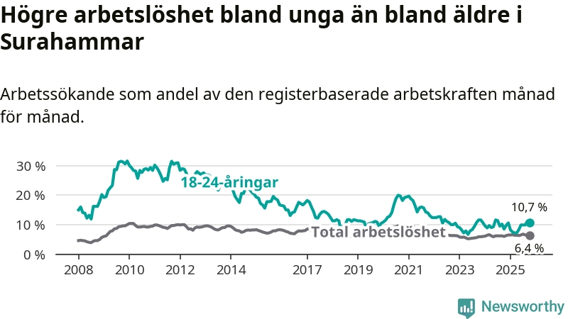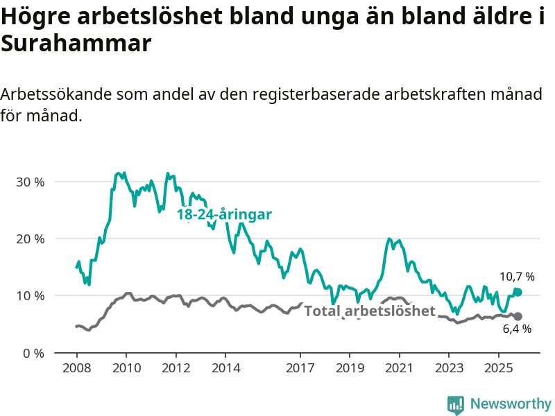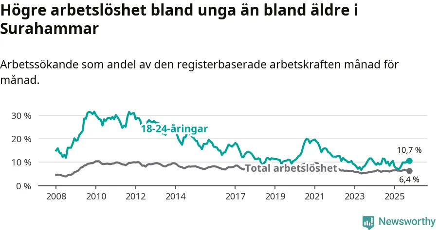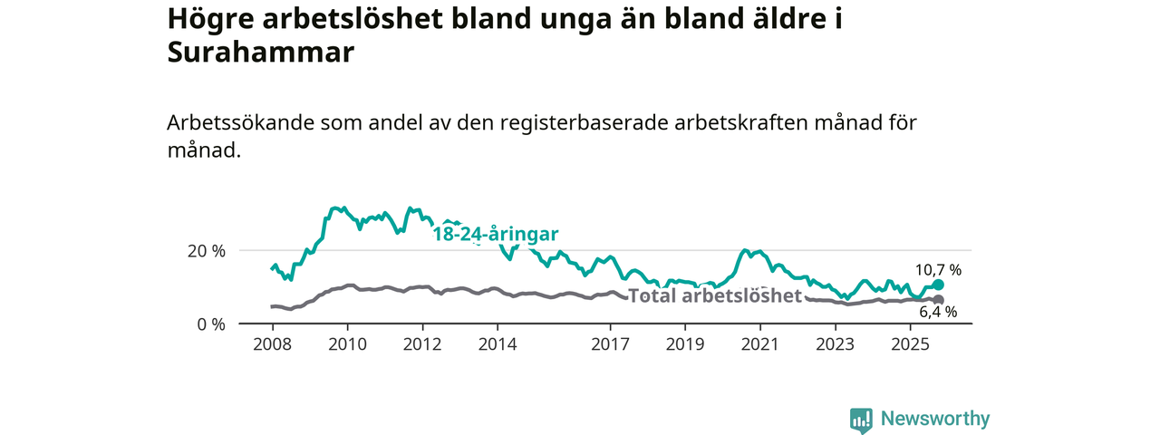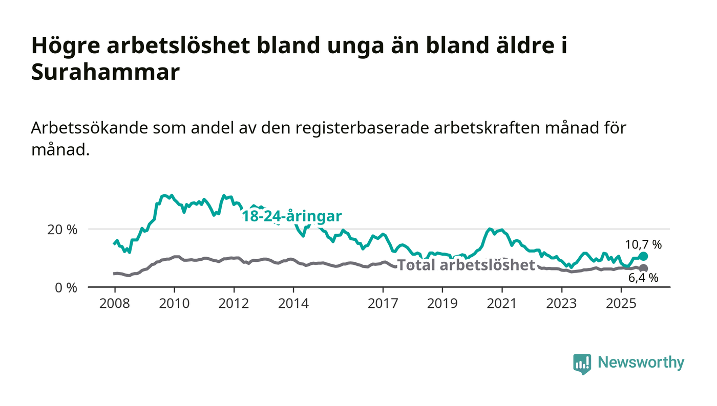 Precis som den totala arbetslösheten ligger ungdomsarbetslösheten i Surahammar lägre än i Västmanland som helhet. Skillnaden mellan kommunen och länet är 0,6 procentenheter.