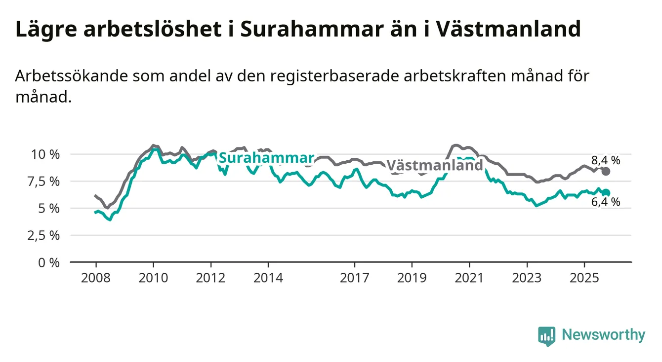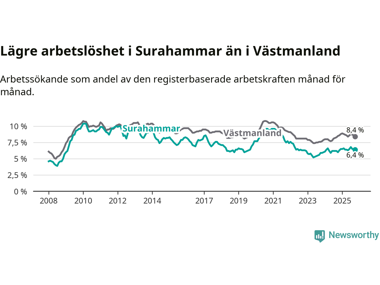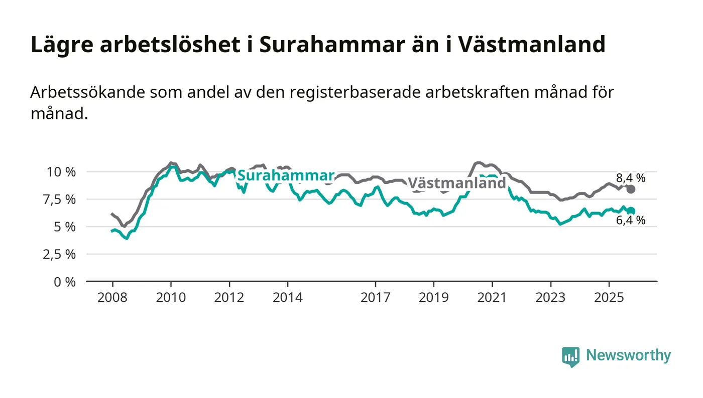 Under oktober månad rapporterade Surahammars kommun en total arbetslöshet på 6,4 procent. Det är en ökning jämfört med samma tidpunkt i fjol (+0,4 procentenheter). I Västmanlands län däremot sjunker arbetslösheten något.