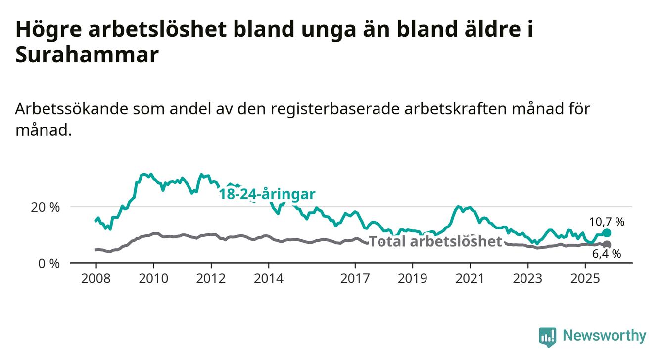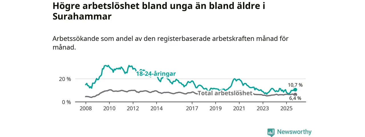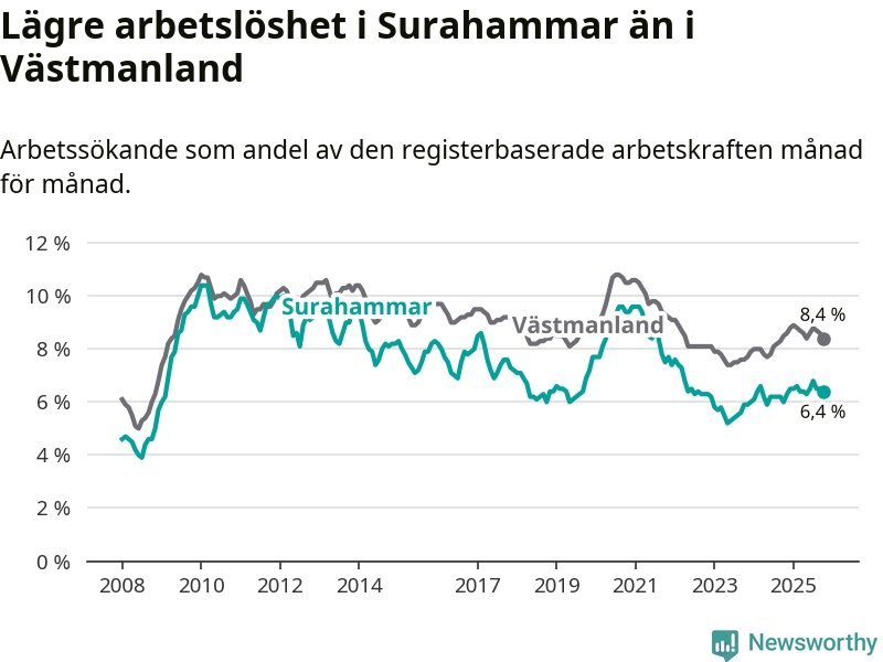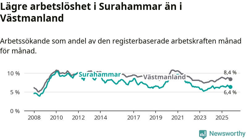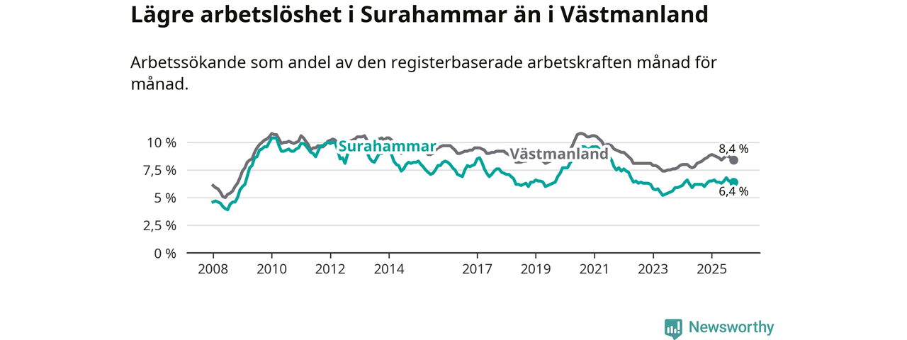 Under oktober månad rapporterade Surahammars kommun en total arbetslöshet på 6,4 procent. Det är en ökning jämfört med samma tidpunkt i fjol (+0,4 procentenheter). I Västmanlands län däremot sjunker arbetslösheten något.