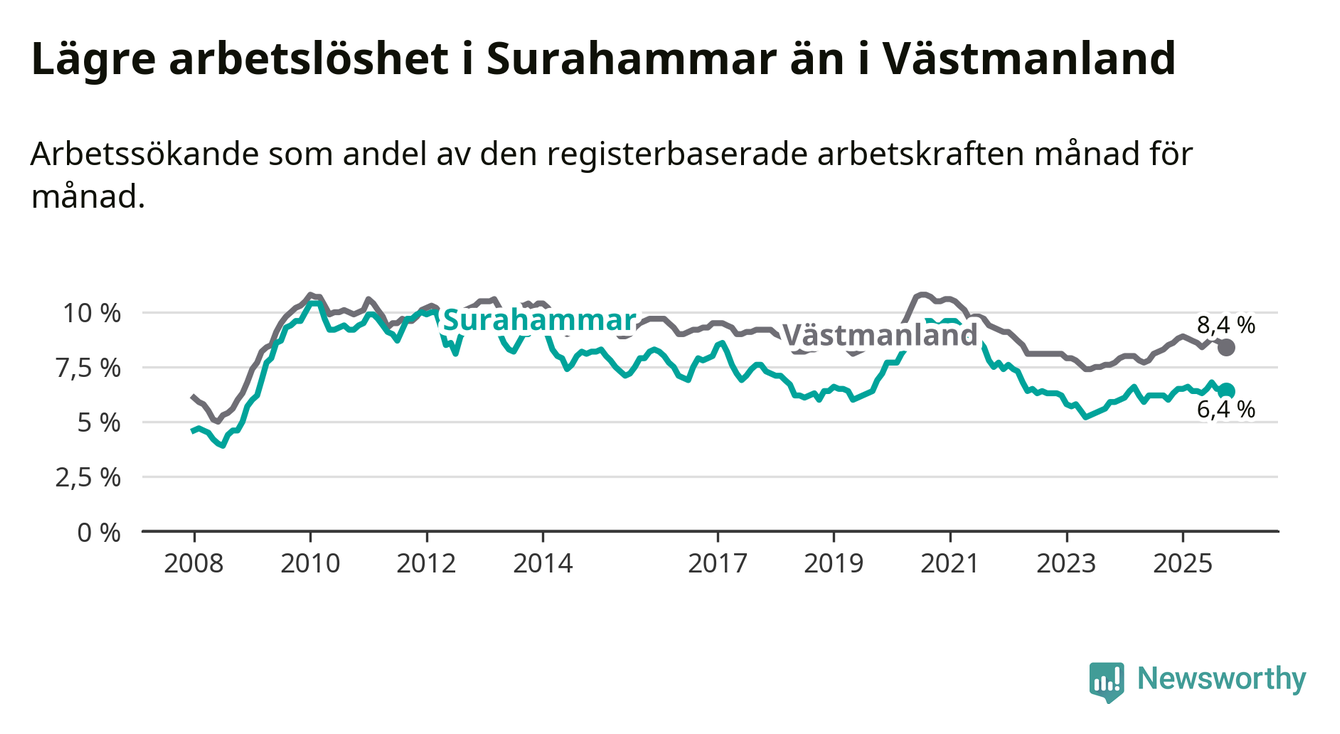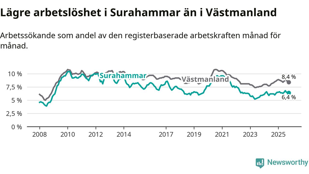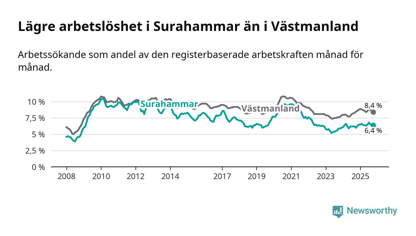Även om arbetslösheten i Surahammar alltså ökar, så ligger den fortfarande under snittet i hela Västmanlands län (6,4 procent i kommunen, jämfört med 8,4 procent i hela länet). Surahammar har därmed även den lägsta arbetslöshetsnivån i länet. Fagersta har den högsta (9,2 procent).