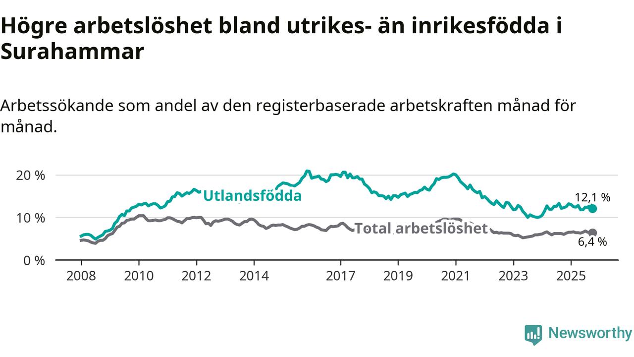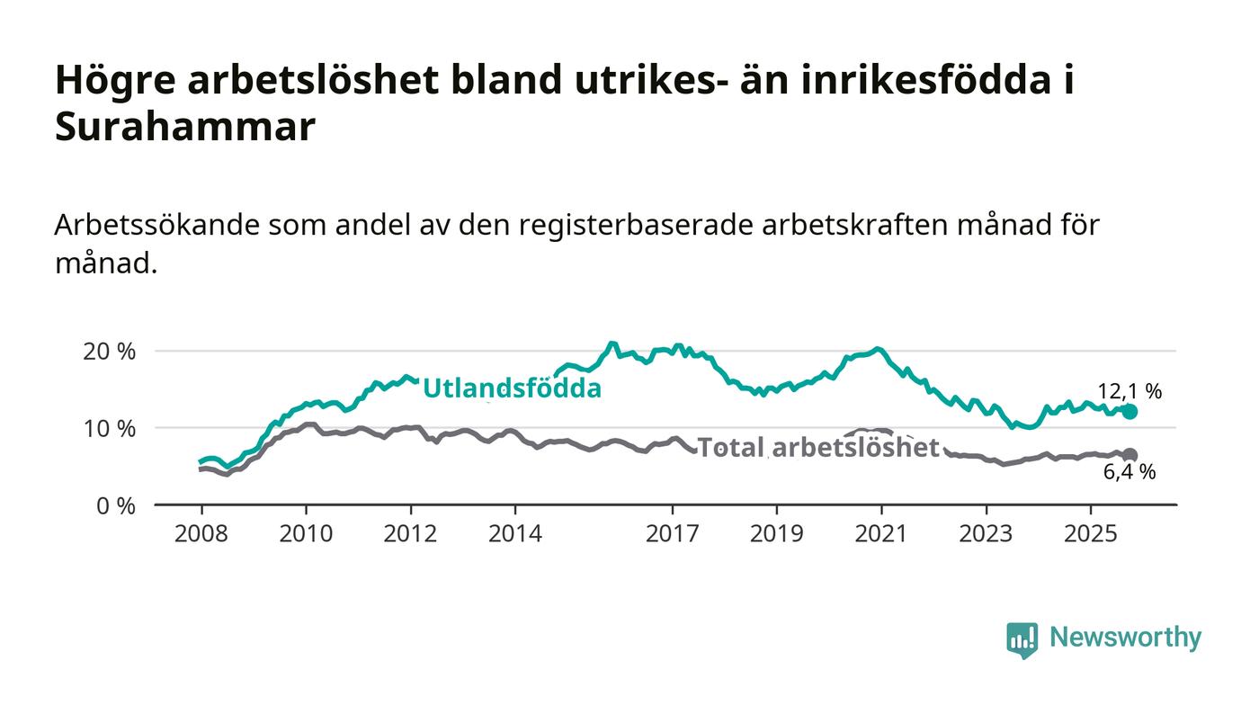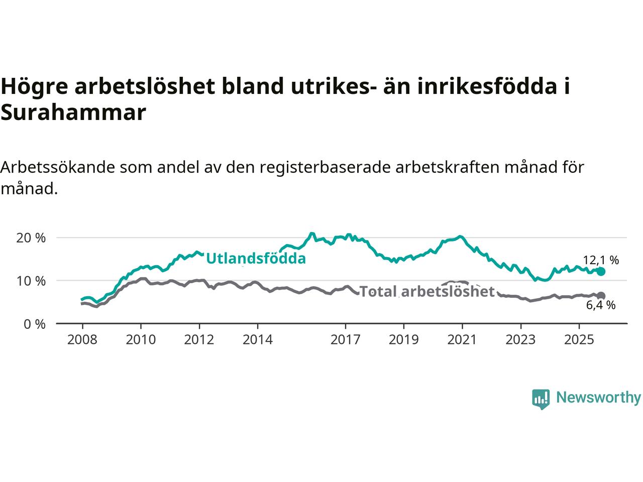 Arbetslösheten bland utlandsfödda var 12,1 procent i Surahammar under oktober månad, motsvarande 103 av 851 personer. Det är 0,2 procentenheter färre än vid samma tidpunkt i fjol (−1 om man räknar personer). Den senaste månadens nedgång innebär ett trendbrott. Under de ett föregående månaderna hade arbetslösheten bland utlandsfödda varit högre än motsvarande tidpunkt året innan.