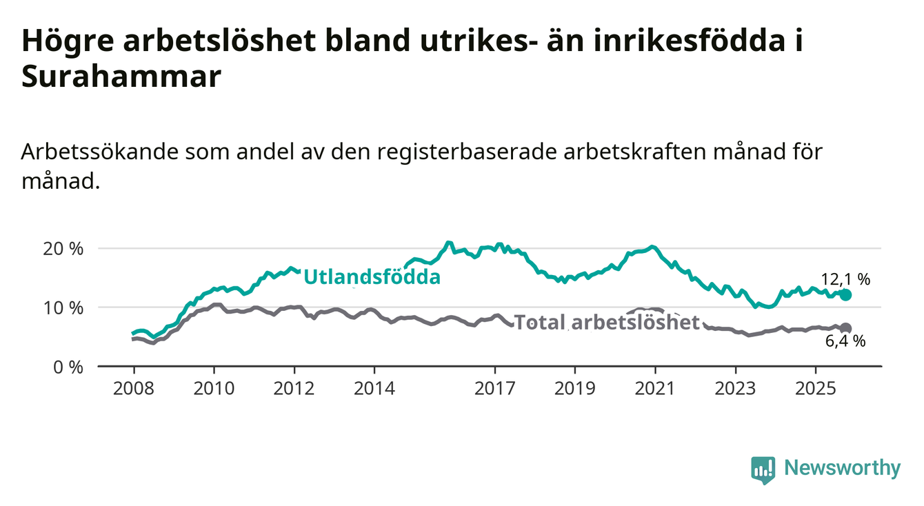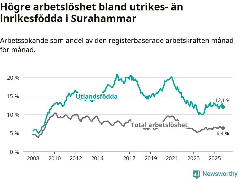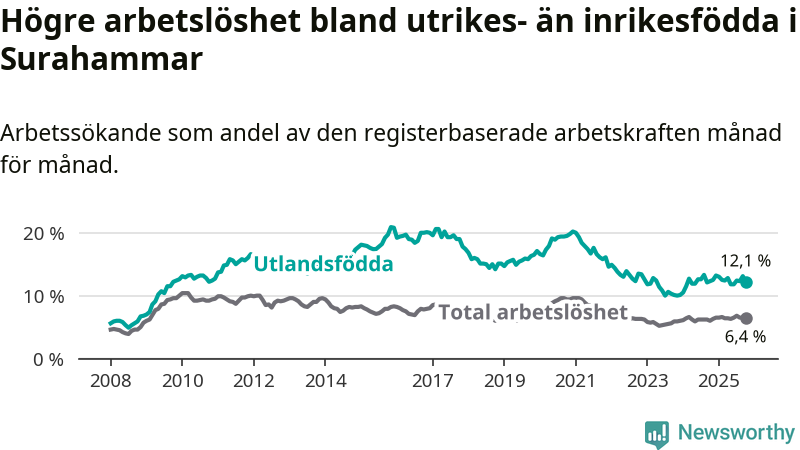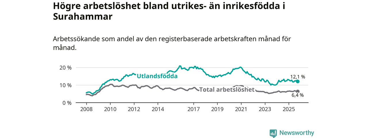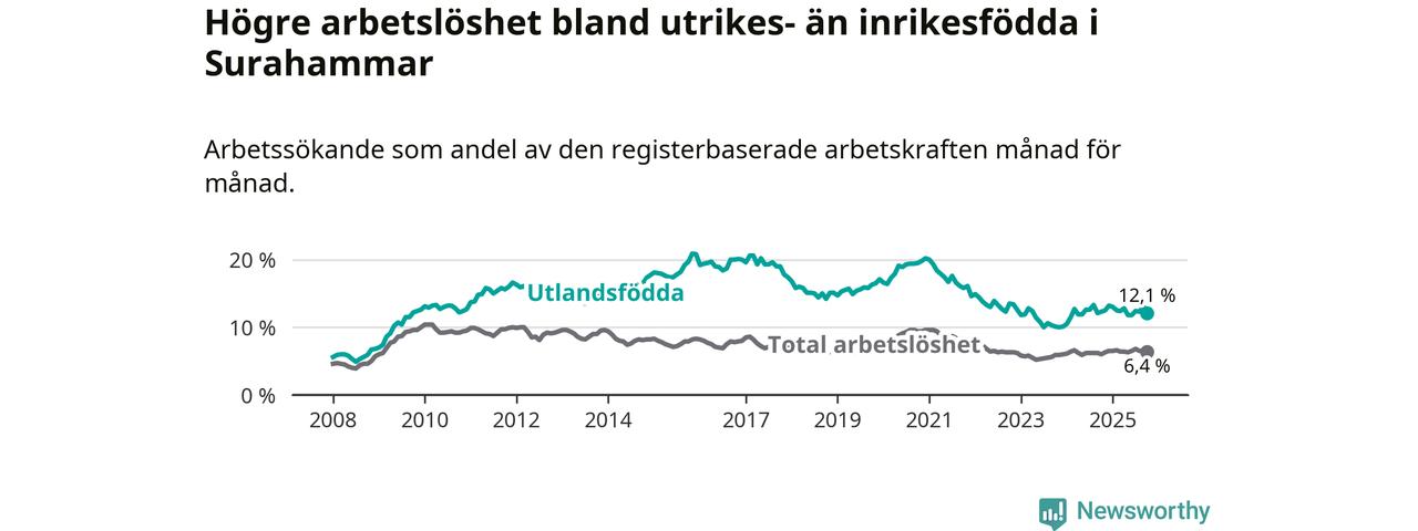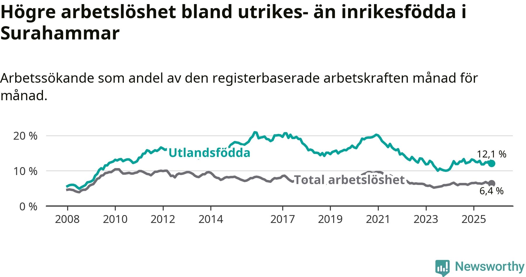 Arbetslösheten bland utlandsfödda var 12,1 procent i Surahammar under oktober månad, motsvarande 103 av 851 personer. Det är 0,2 procentenheter färre än vid samma tidpunkt i fjol (−1 om man räknar personer). Den senaste månadens nedgång innebär ett trendbrott. Under de ett föregående månaderna hade arbetslösheten bland utlandsfödda varit högre än motsvarande tidpunkt året innan.