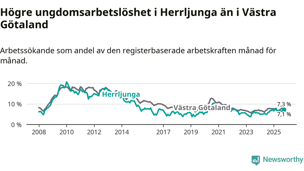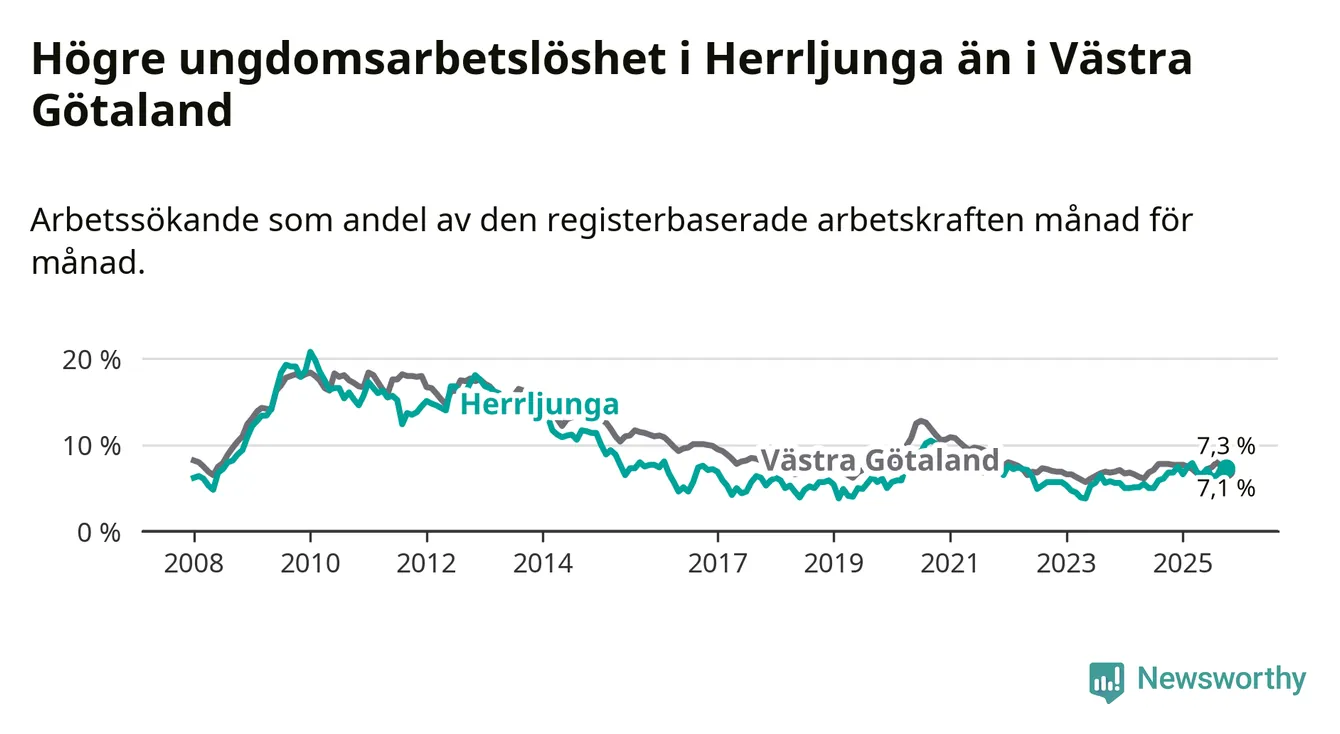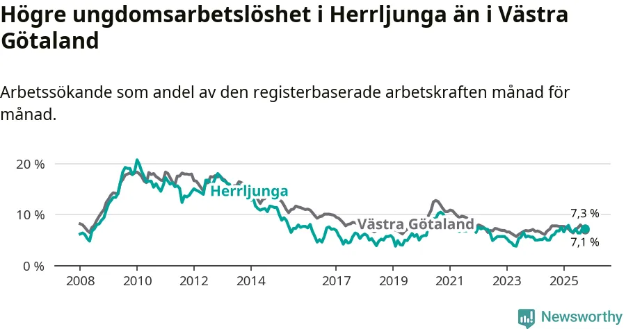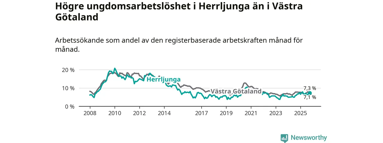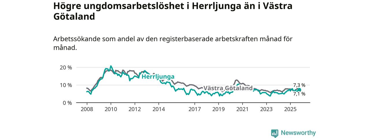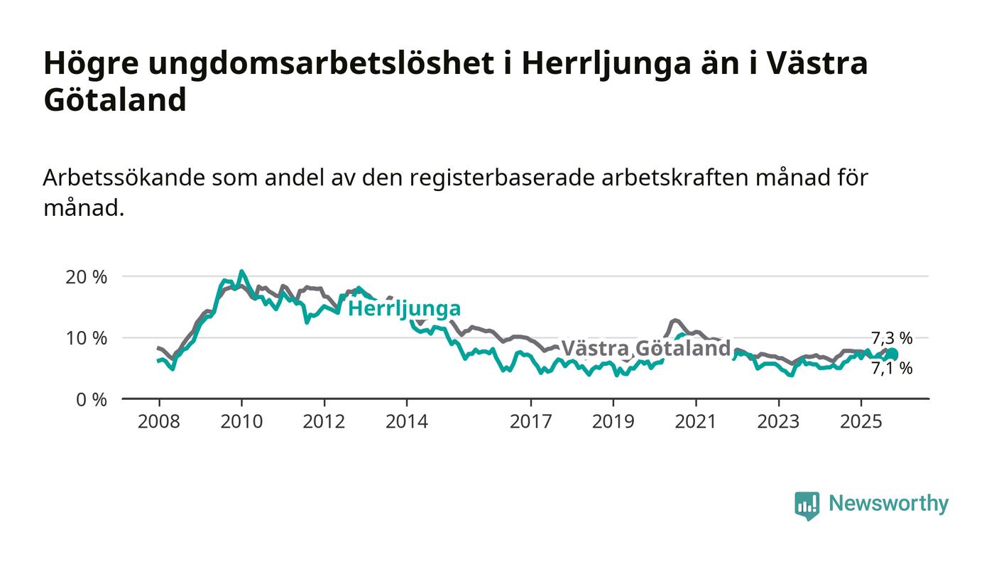 Medan Herrljunga har lägre total arbetslöshet än Västra Götaland, ligger ungdomsarbetslösheten 0,2 procentenheter högre i Herrljunga.