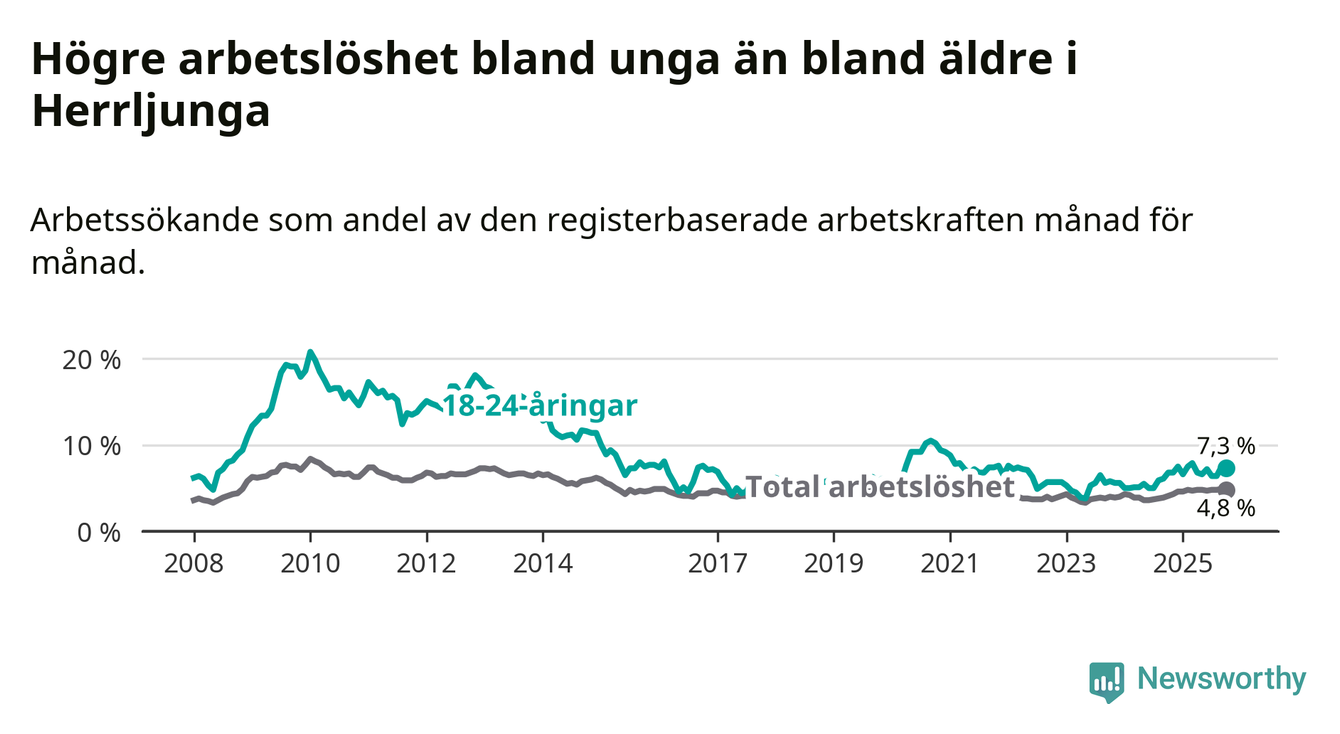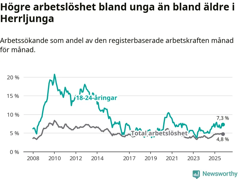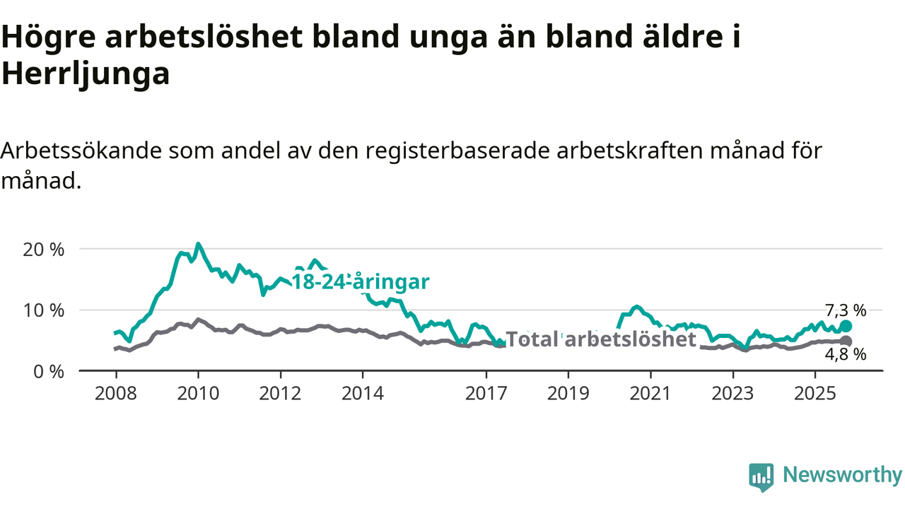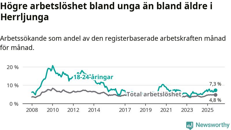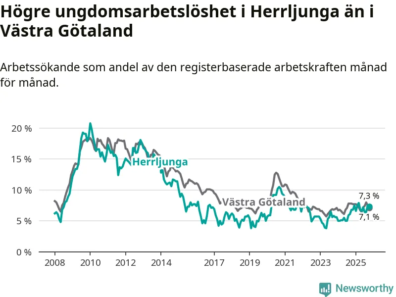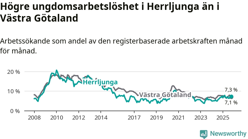 Medan Herrljunga har lägre total arbetslöshet än Västra Götaland, ligger ungdomsarbetslösheten 0,2 procentenheter högre i Herrljunga.
