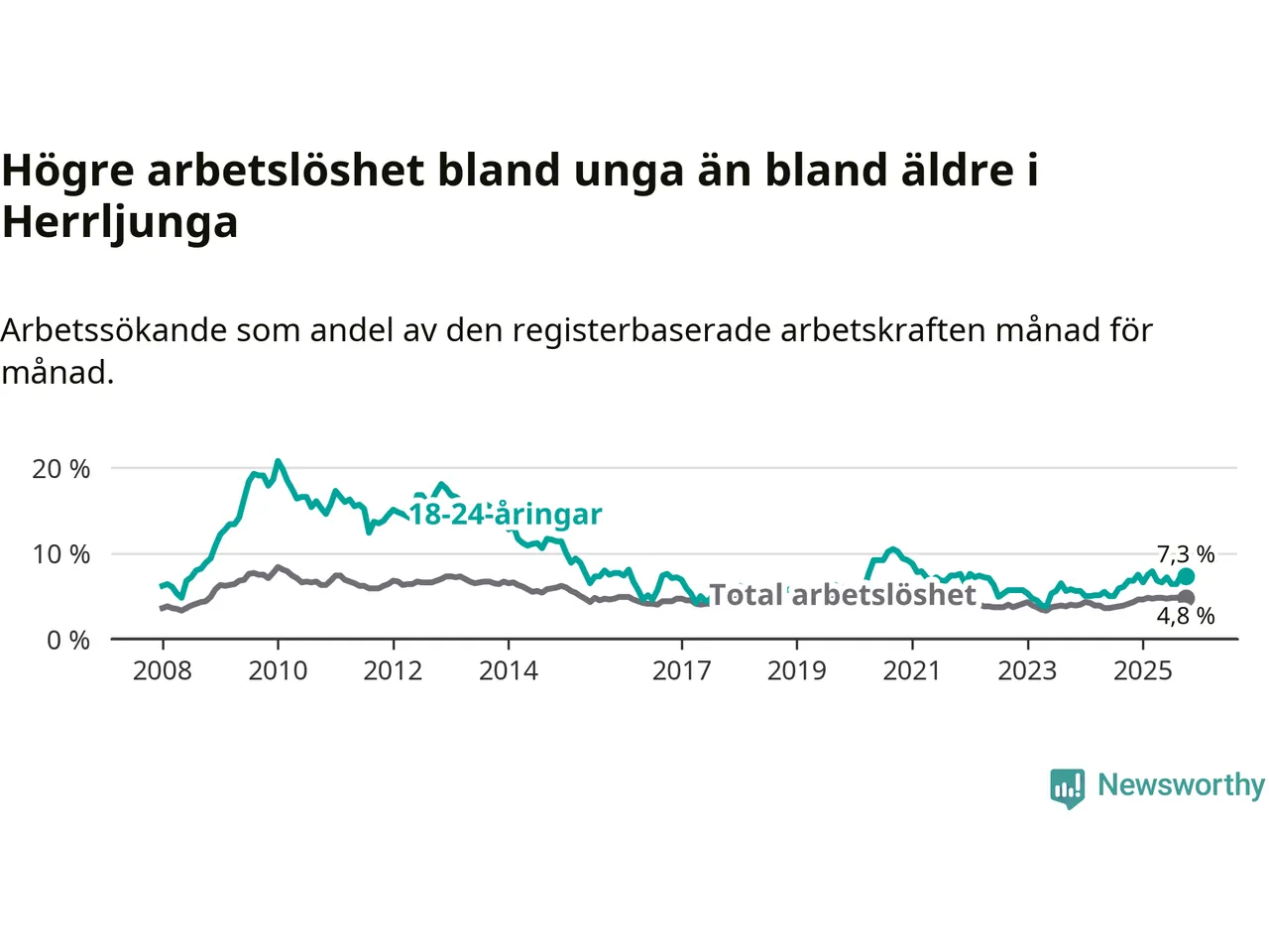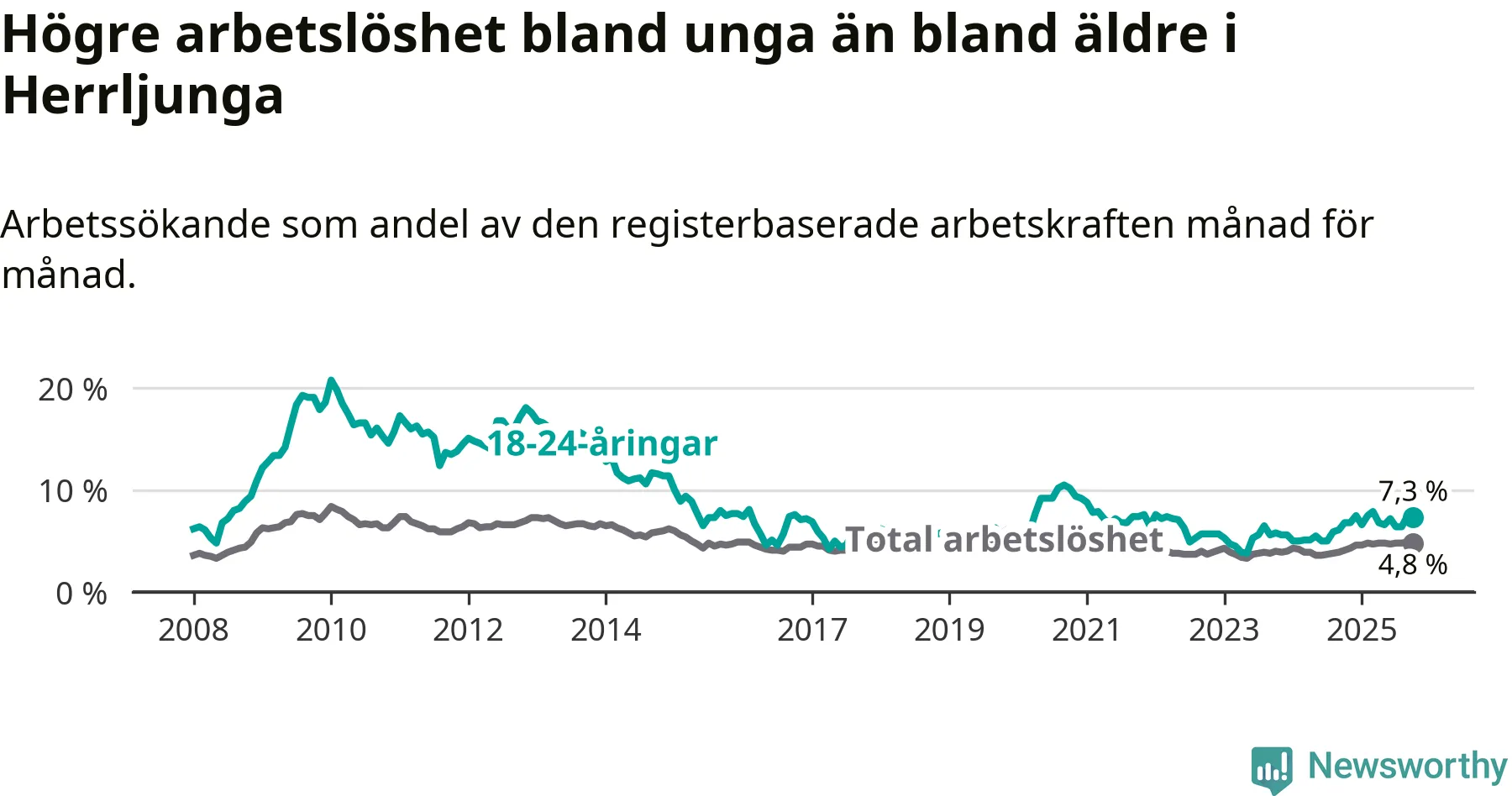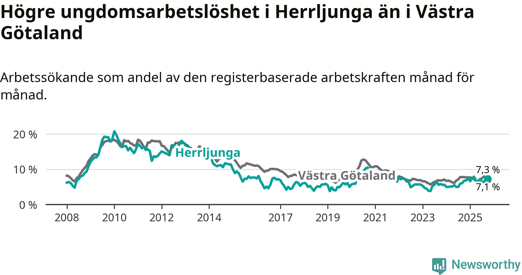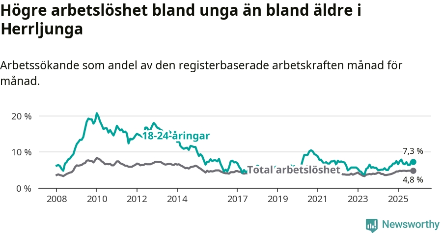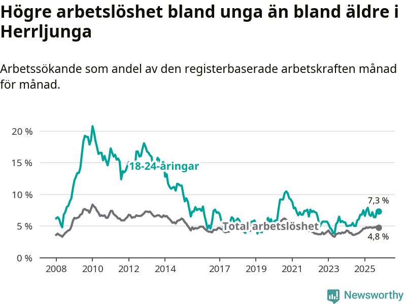 Medan Herrljunga har lägre total arbetslöshet än Västra Götaland, ligger ungdomsarbetslösheten 0,2 procentenheter högre i Herrljunga.
