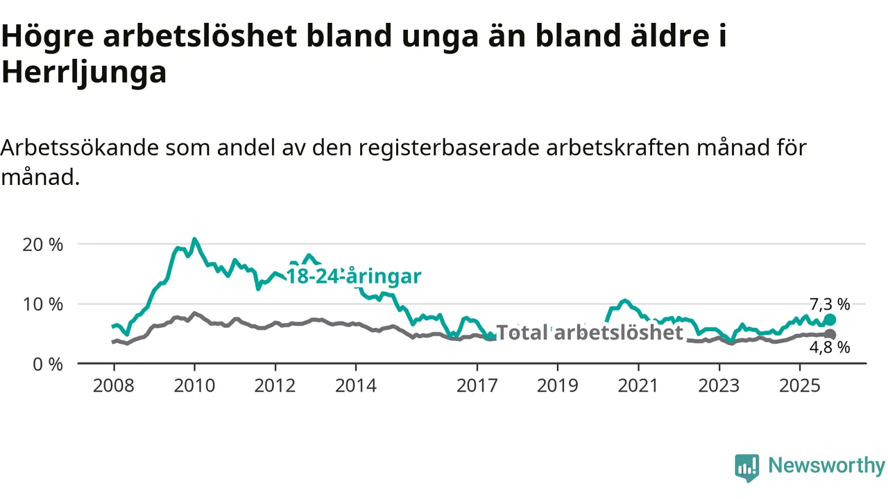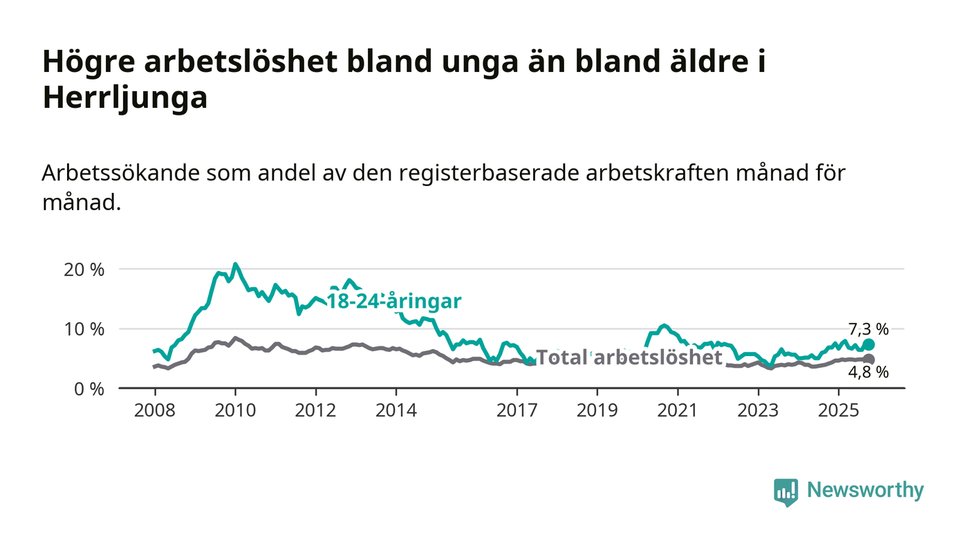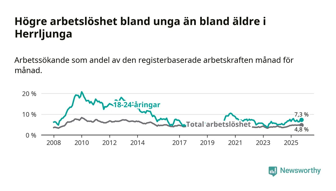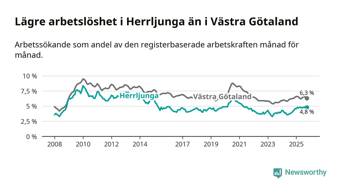 Det är 14:e månaden i följd som arbetslösheten i Herrljunga är högre än den var under samma tidpunkt året innan. Sedan augusti 2024 har arbetslösheten gått upp från 3,8 till 4,8 procent.