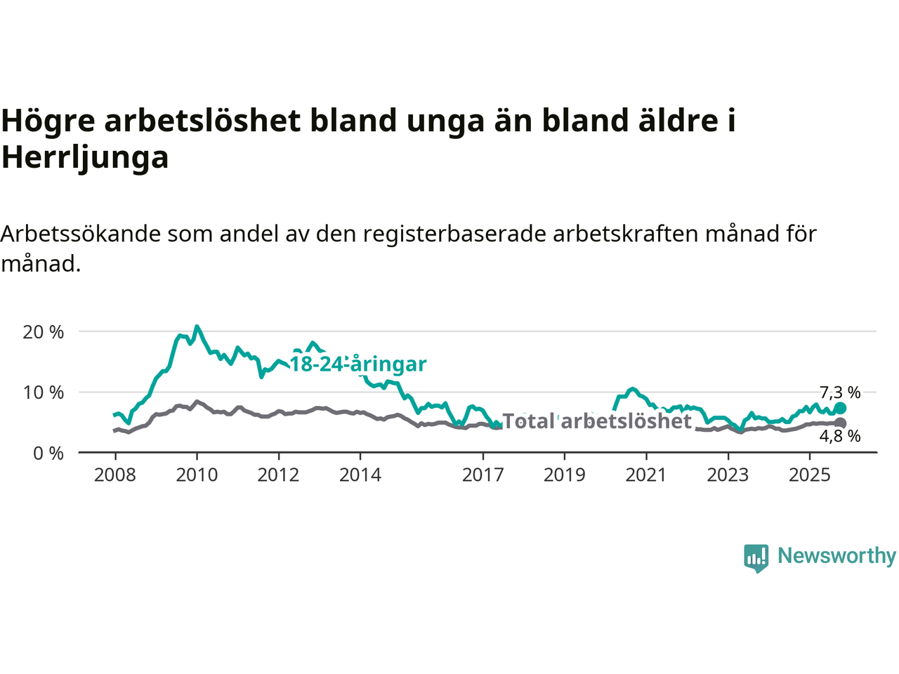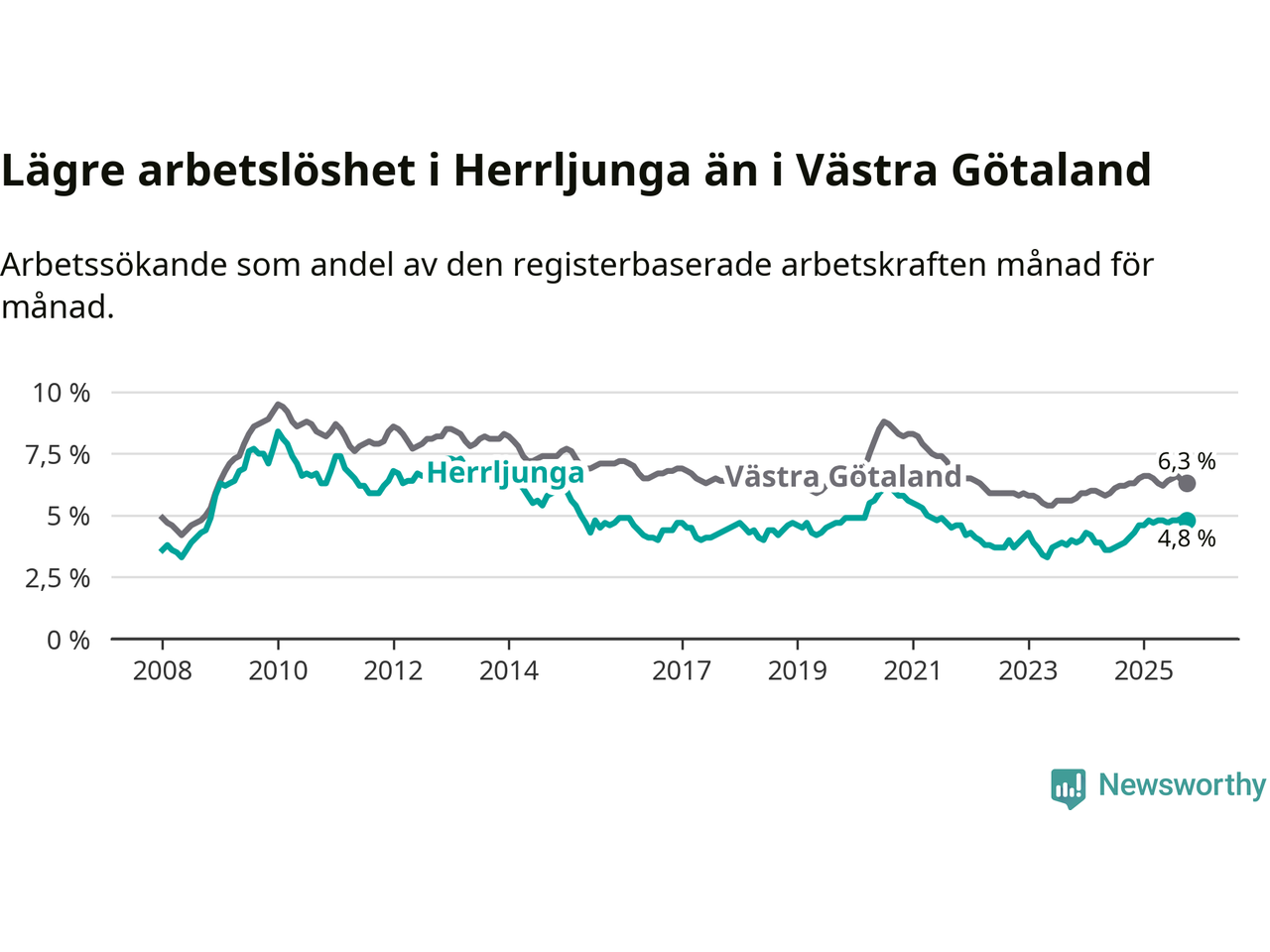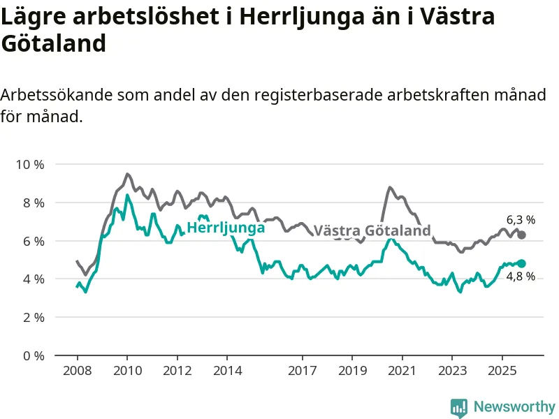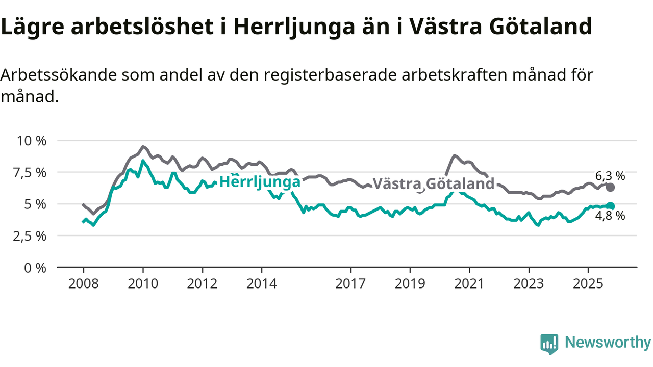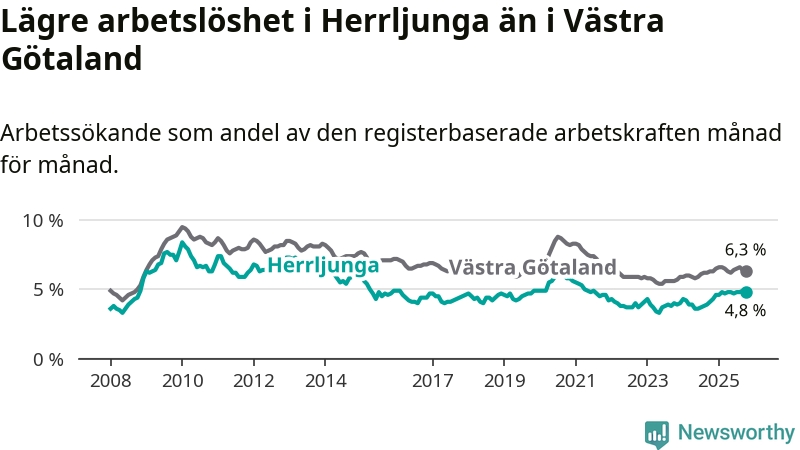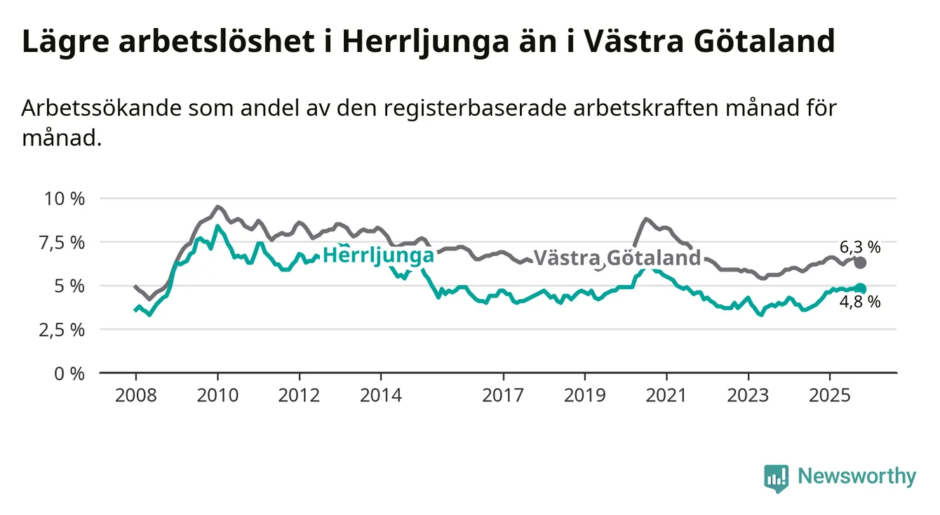 Det är 14:e månaden i följd som arbetslösheten i Herrljunga är högre än den var under samma tidpunkt året innan. Sedan augusti 2024 har arbetslösheten gått upp från 3,8 till 4,8 procent.