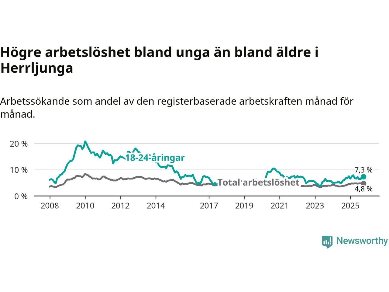 I och med den senaste månadens uppgång har de ungas arbetslöshet i Herrljunga stigit 14 månader i följd (upp från 5,9 procent i augusti 2024 till 7,3 procent nu).