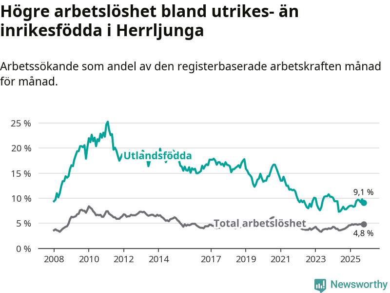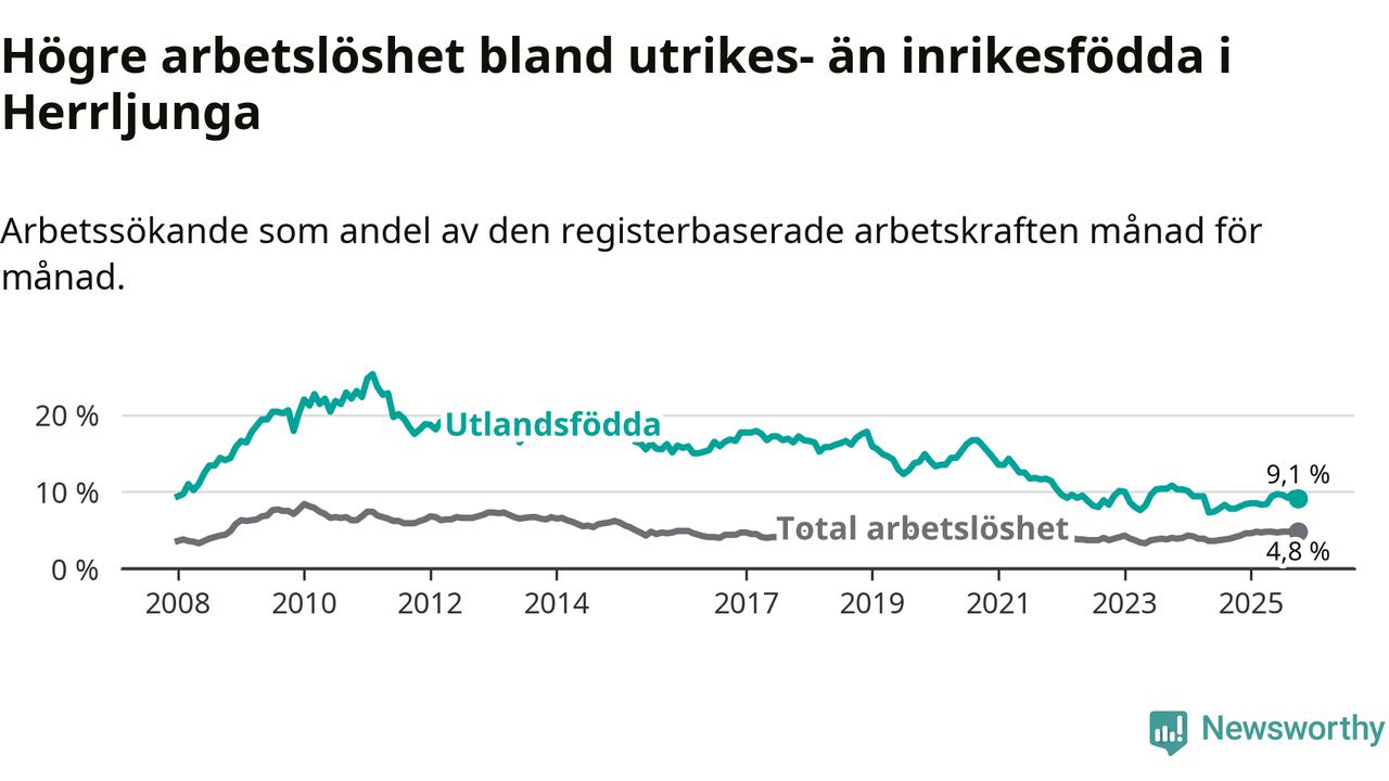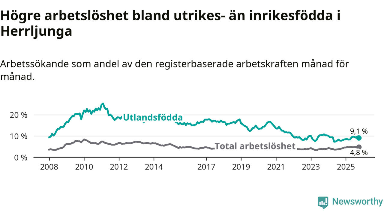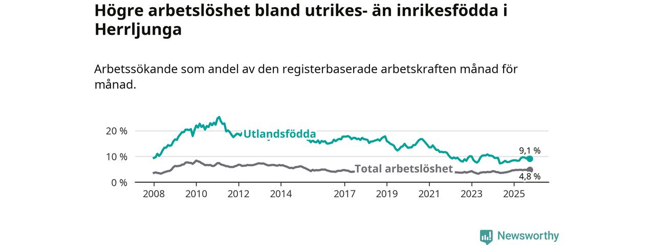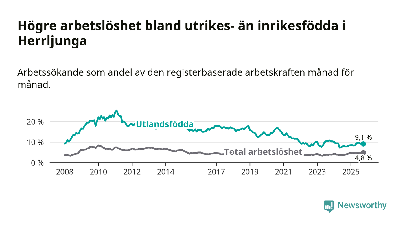 Skillnaden i arbetslöshet mellan utrikesfödda och hela befolkningen är 4,3 procentenheter i Herrljunga. Det är en större skillnad än för ett år sedan (+0,6 procentenheter).