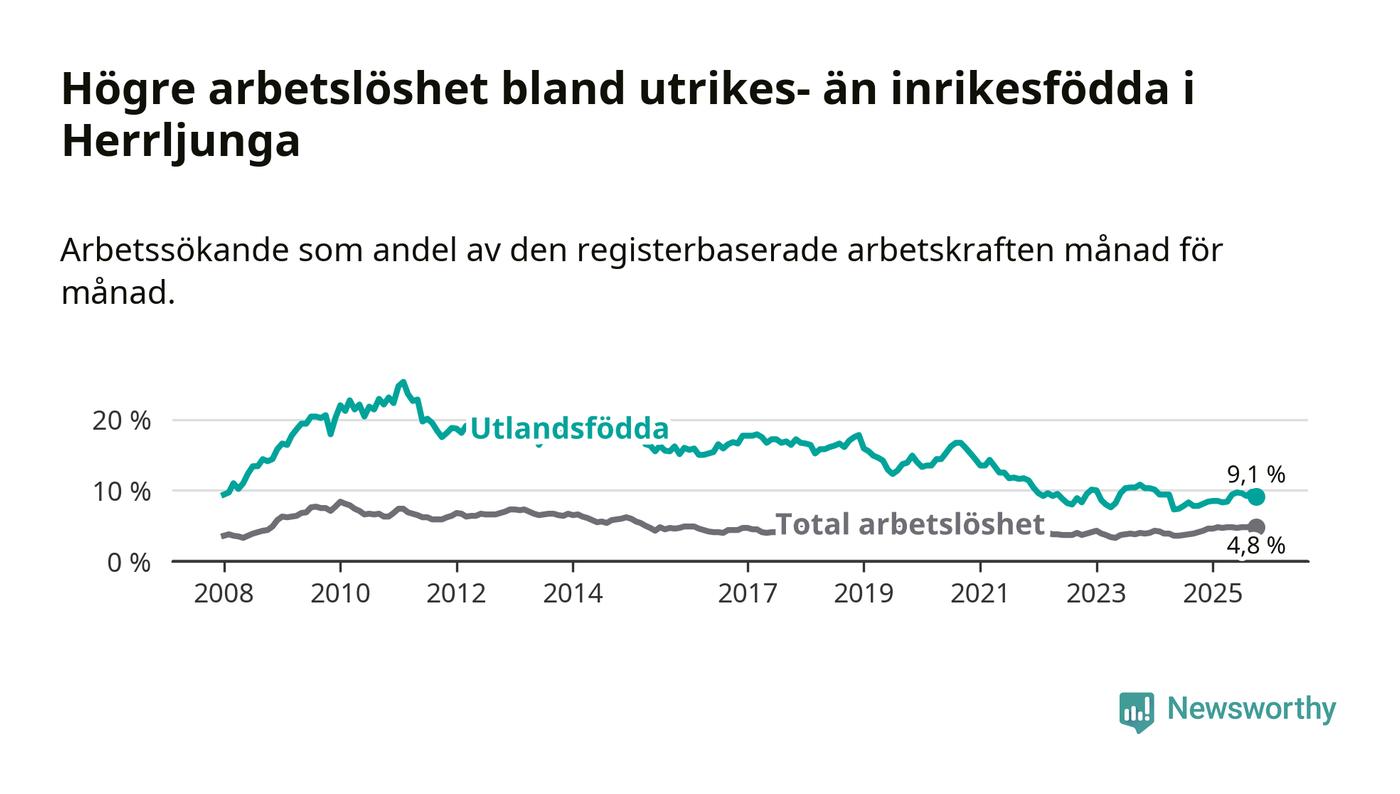 Arbetslösheten bland utlandsfödda var 9,1 procent i Herrljunga under oktober månad, motsvarande 63 av 692 personer. Det är 1,3 procentenheter fler än vid samma tidpunkt i fjol (+11 om man räknar personer). Därmed är de utlandsföddas arbetslöshet högre än vid samma tidpunkt i fjol för sjätte månaden i följd.