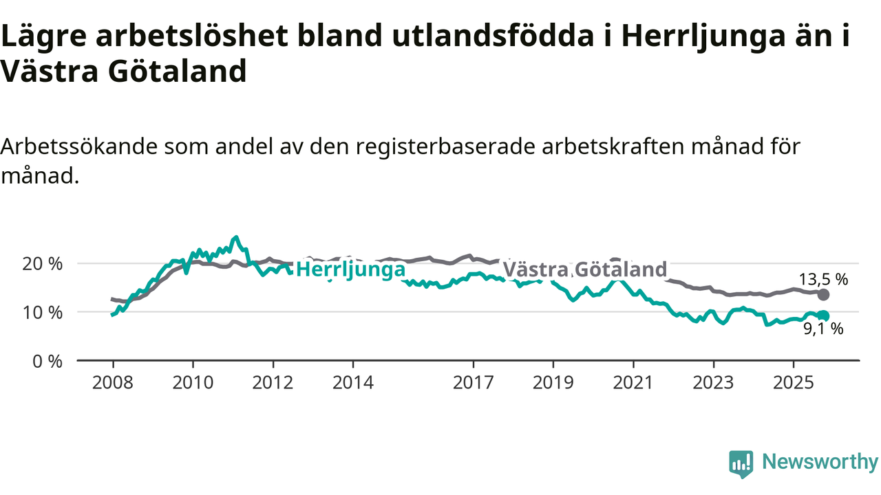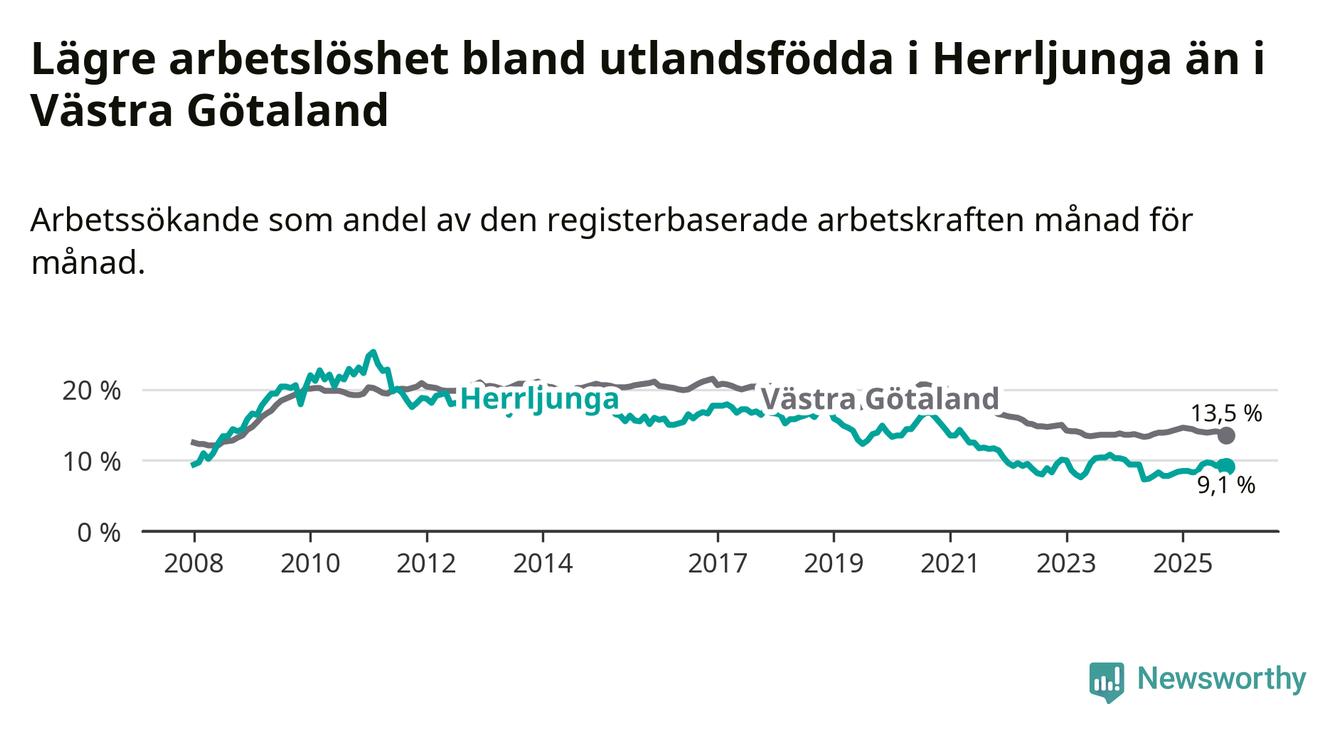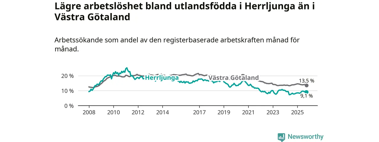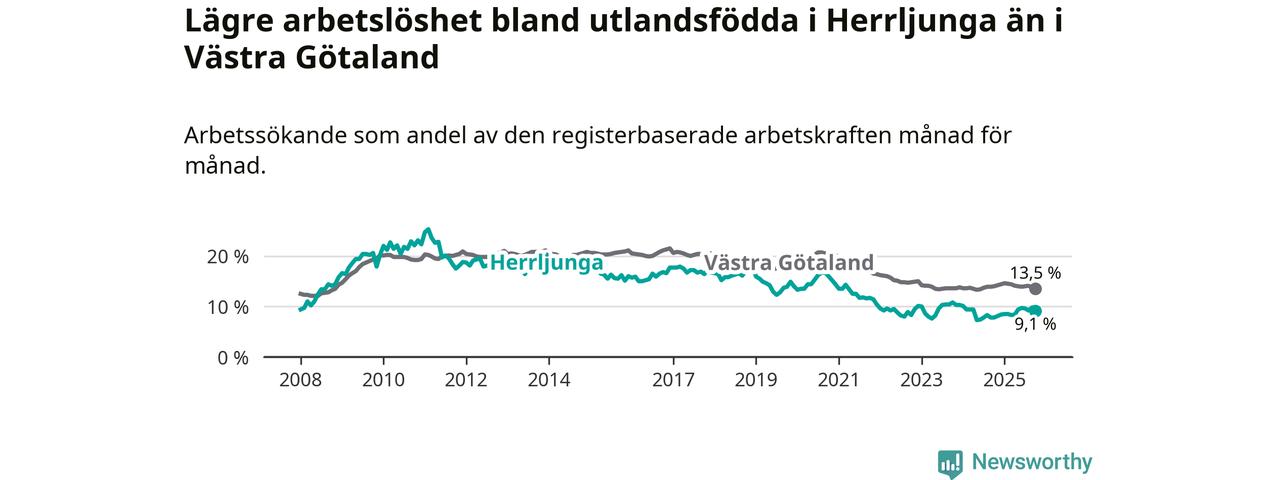 Medan arbetslösheten bland utlandsfödda alltså ökar i Herrljunga så minskar den i Västra Götaland. Jämfört med oktober förra året har andelen arbetslösa utlandsfödda i länet minskat med 0,5 procentenheter (till 13,5 procent). Trots den senaste uppgången har Herrljunga med andra ord fortfarande lägre arbetslöshet bland utlandsfödda än Västra Götaland.