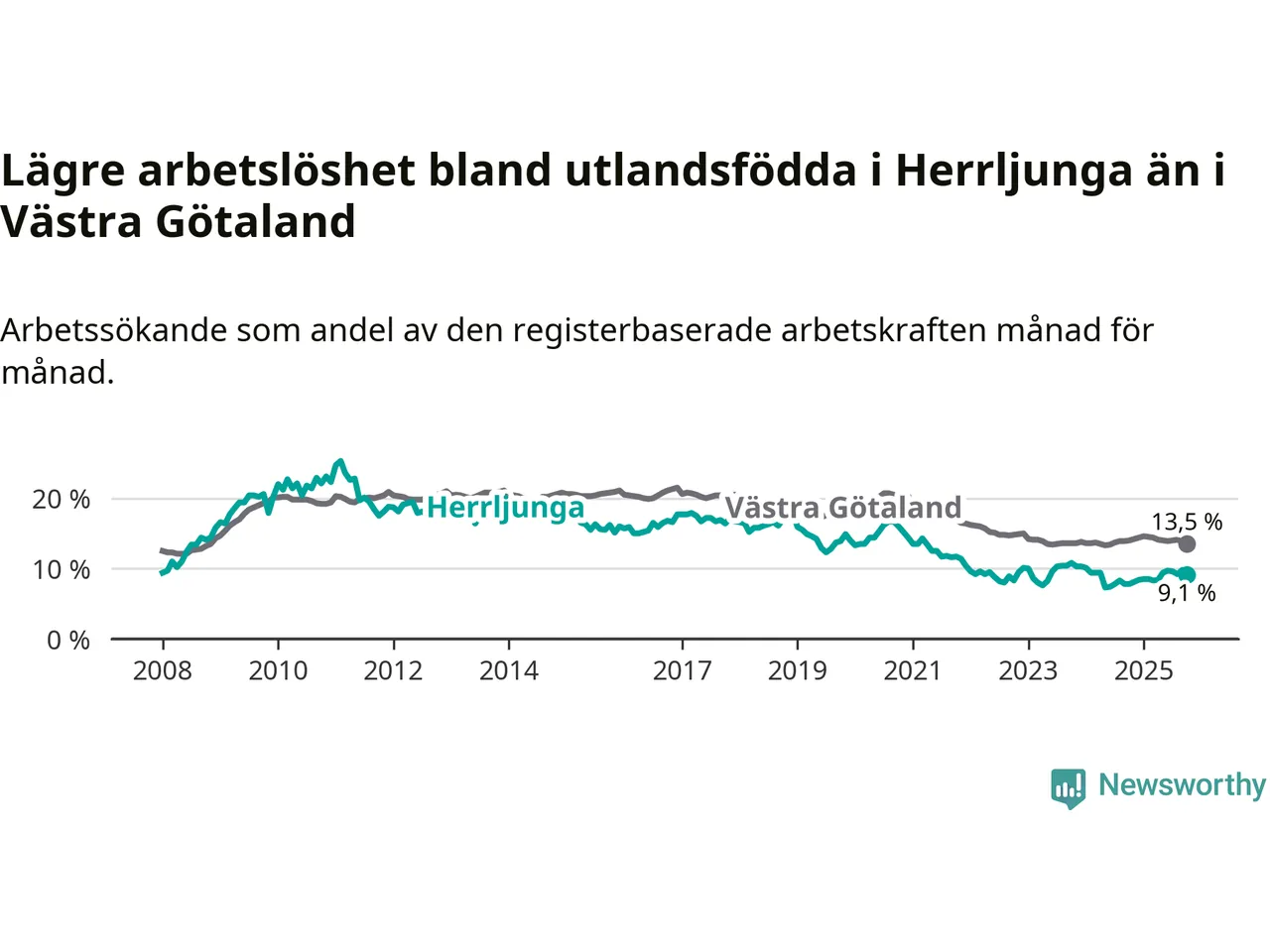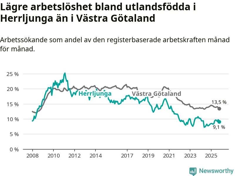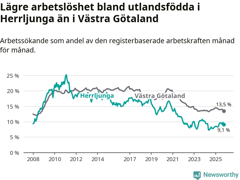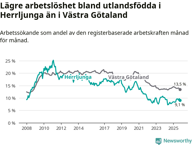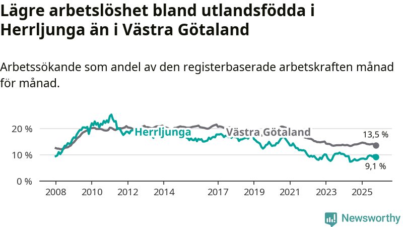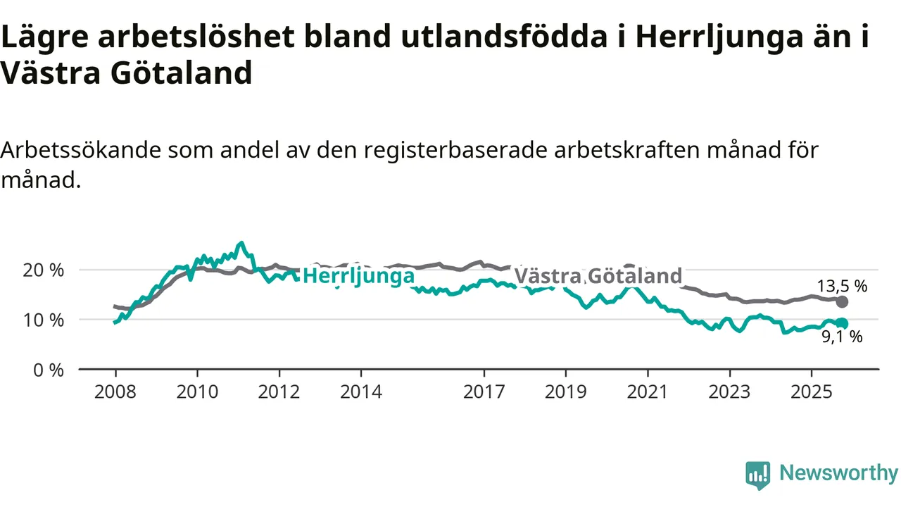 Medan arbetslösheten bland utlandsfödda alltså ökar i Herrljunga så minskar den i Västra Götaland. Jämfört med oktober förra året har andelen arbetslösa utlandsfödda i länet minskat med 0,5 procentenheter (till 13,5 procent). Trots den senaste uppgången har Herrljunga med andra ord fortfarande lägre arbetslöshet bland utlandsfödda än Västra Götaland.