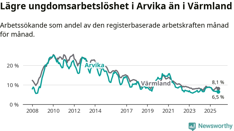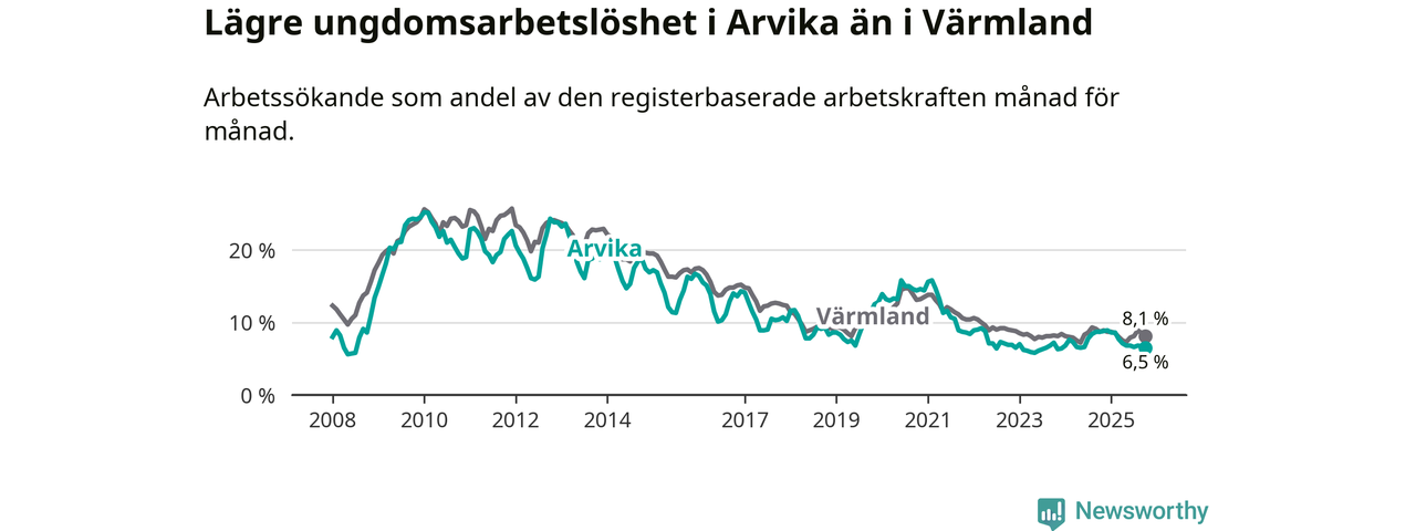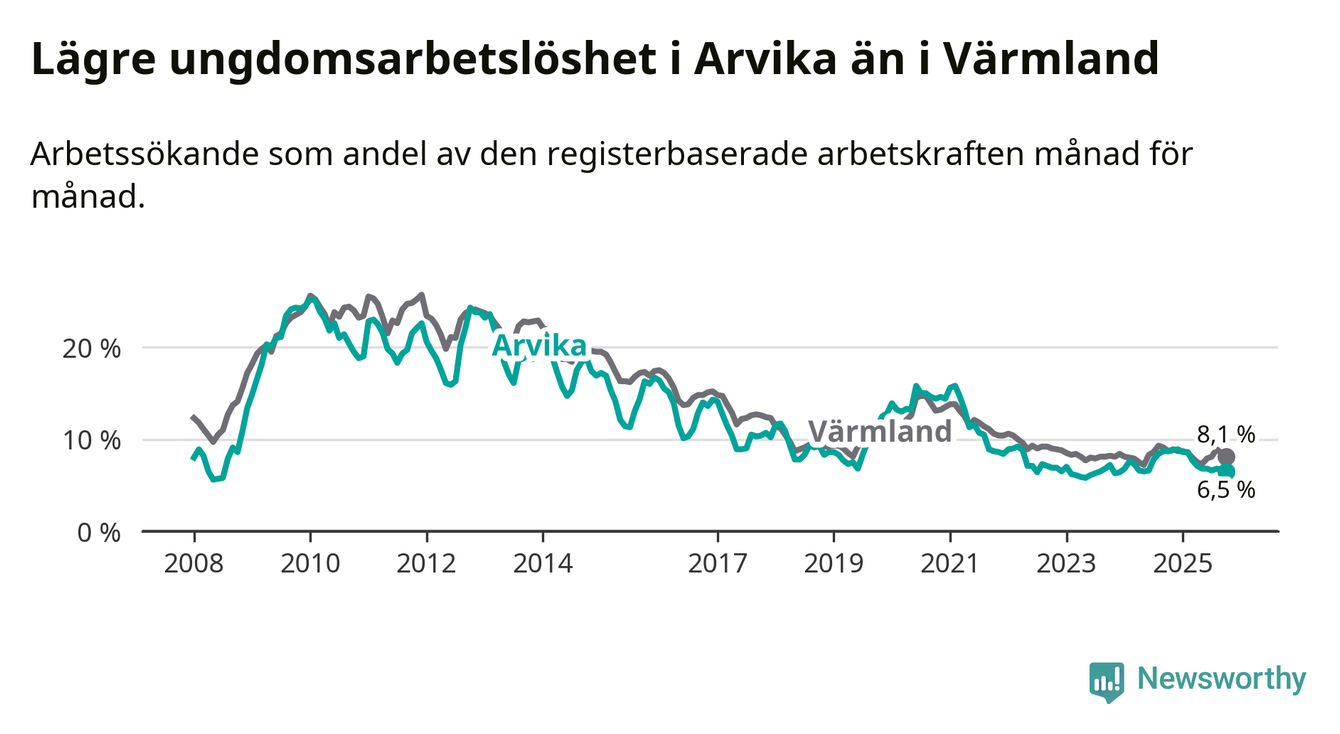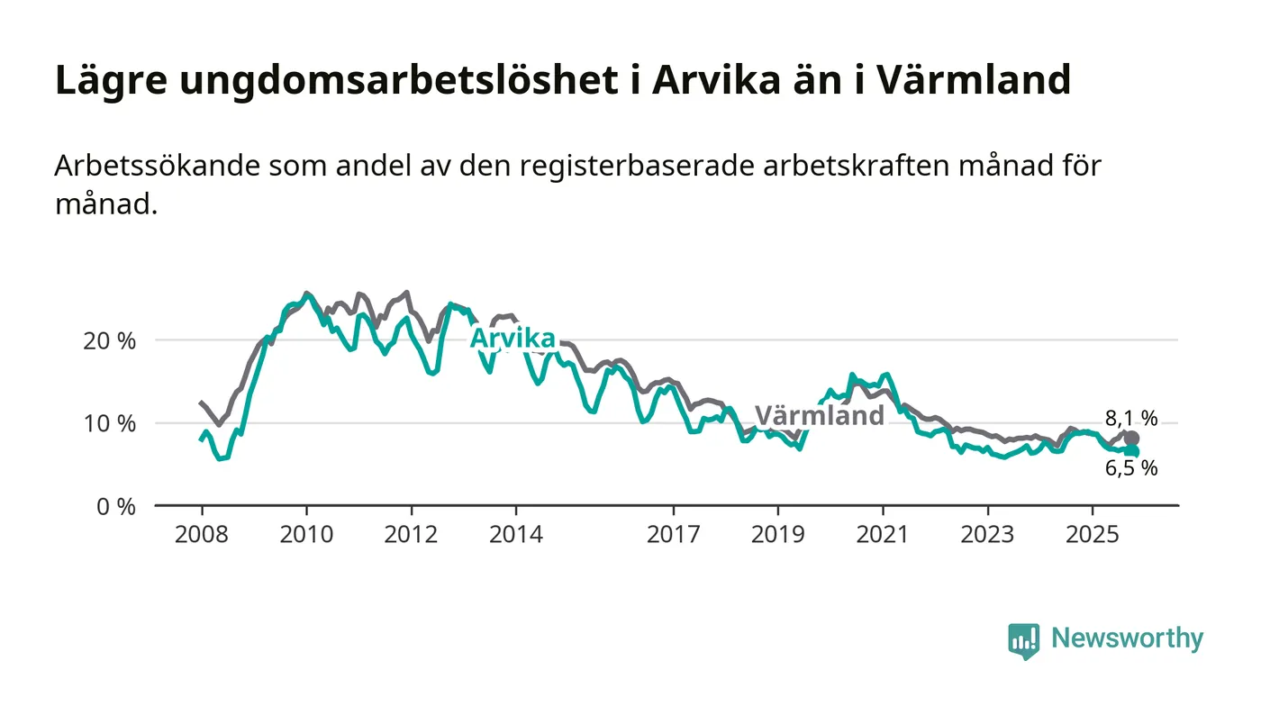 Precis som den totala arbetslösheten ligger ungdomsarbetslösheten i Arvika lägre än i Värmland som helhet. Skillnaden mellan kommunen och länet är 1,6 procentenheter.