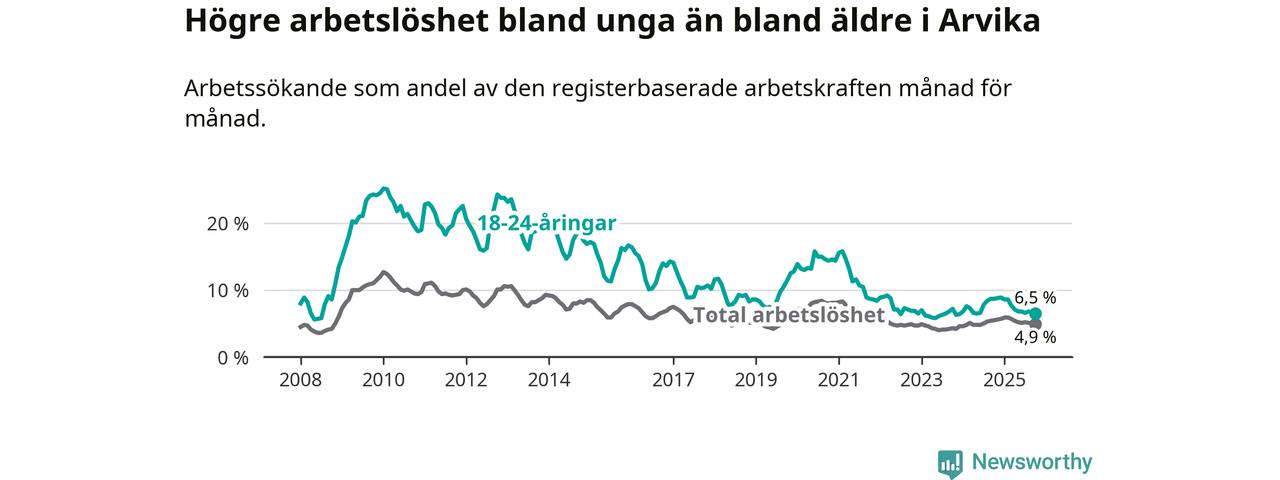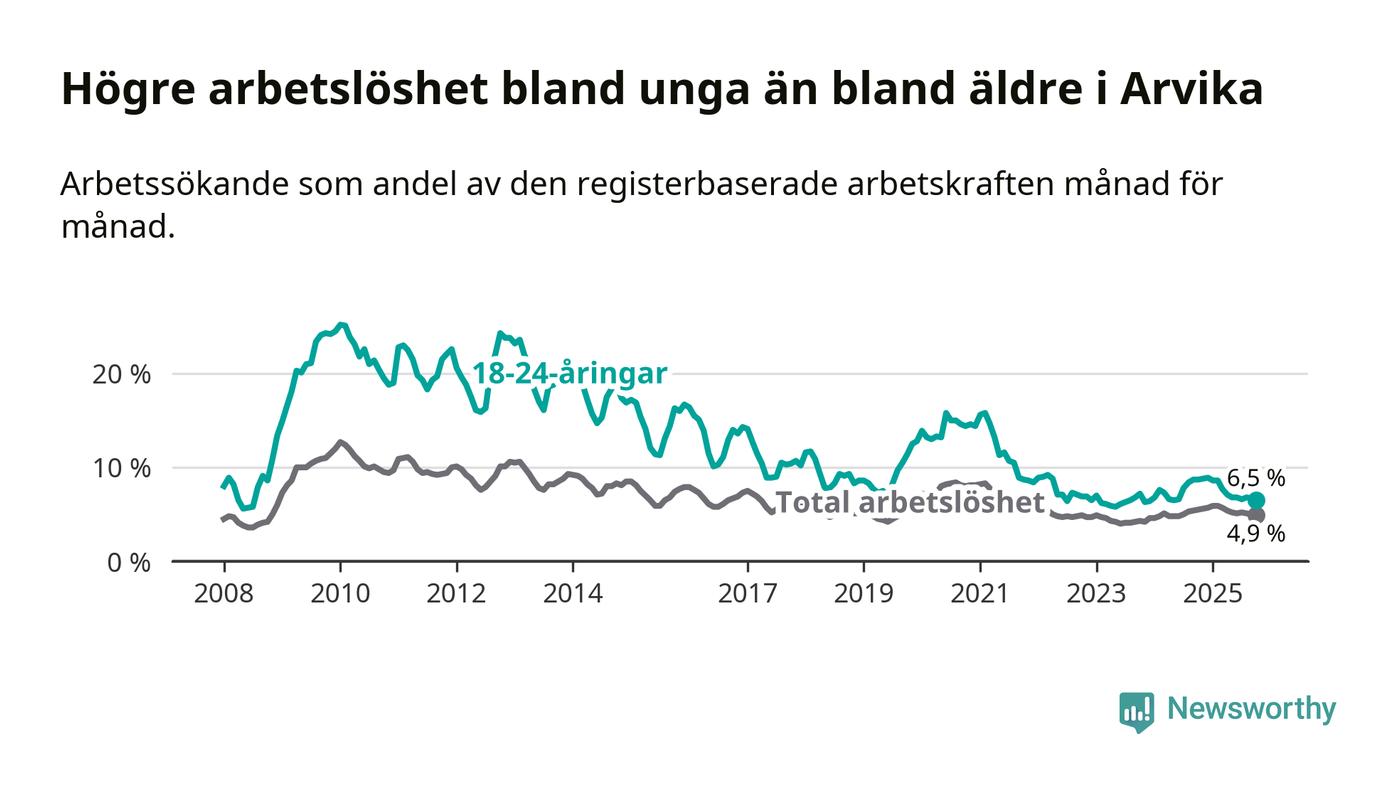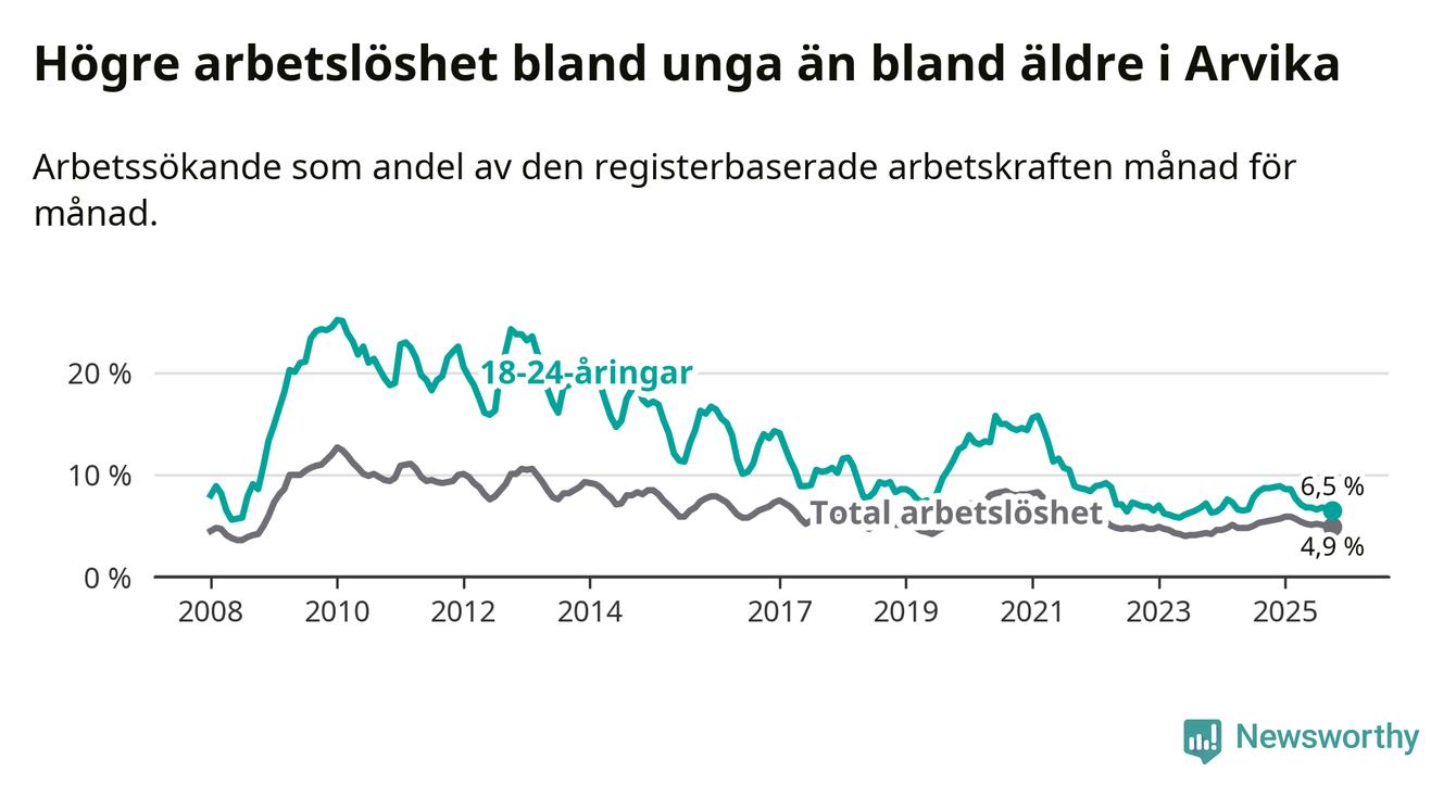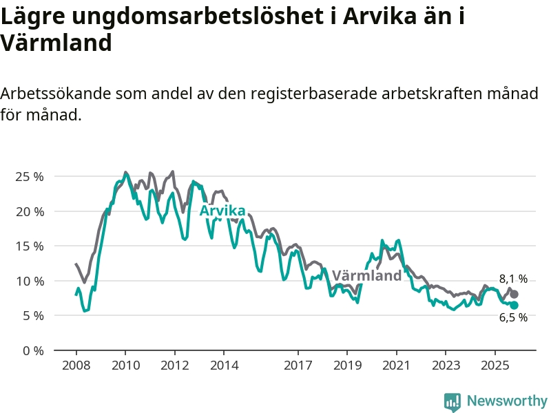 Precis som den totala arbetslösheten ligger ungdomsarbetslösheten i Arvika lägre än i Värmland som helhet. Skillnaden mellan kommunen och länet är 1,6 procentenheter.