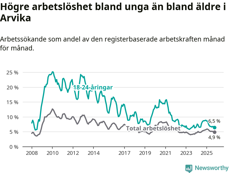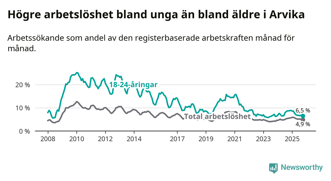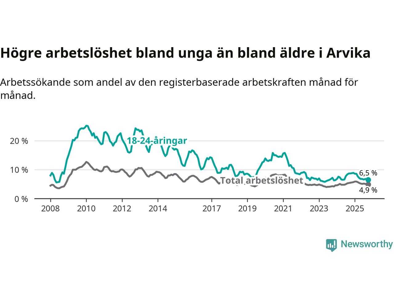 Precis som den totala arbetslösheten sjunker arbetslösheten bland unga (−2,2 procentenheter). I oktober var 6,5 procent av 18–24-åringarna inskrivna som arbetssökande (motsvarande 78 personer). Mäter vi antalet inskrivna ser vi en minskning med 31 personer på ett års sikt.