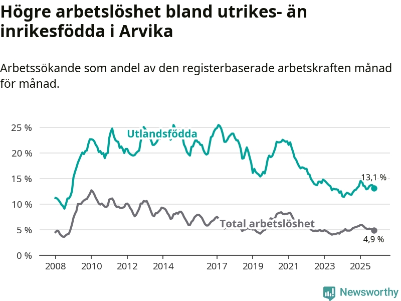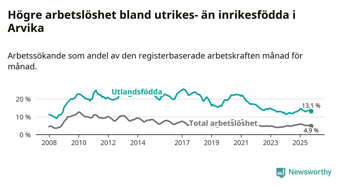 | Bland utlandsfödda | 13,1 % | +0,3 % ▲ | 14,8 % | −0,6 % ▼ | 14,5 % | −0,8 % ▼ |