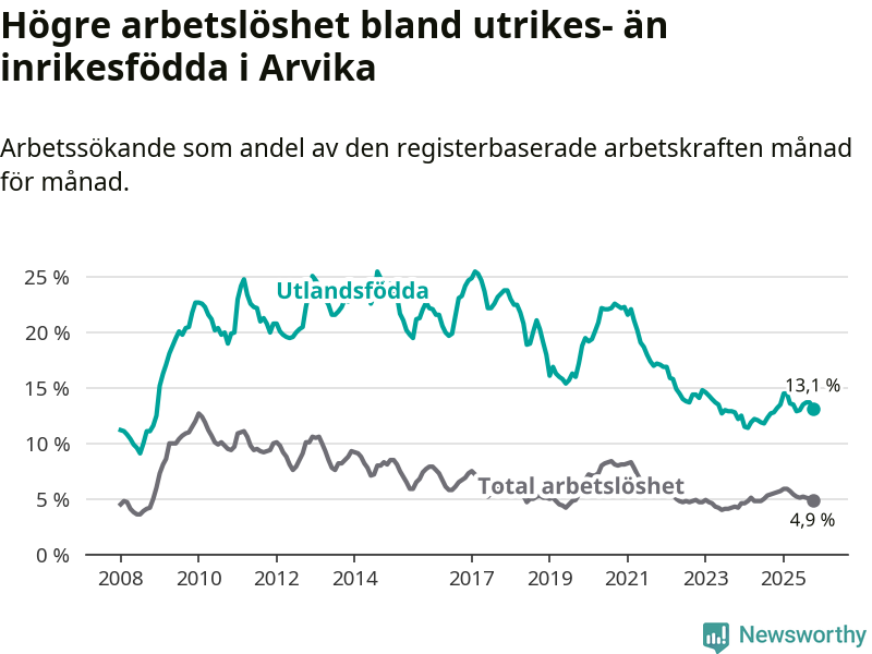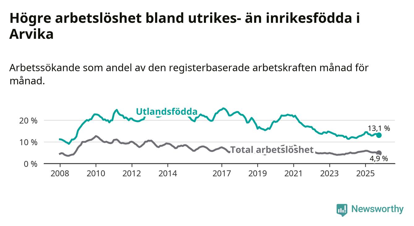 Arbetslösheten bland utlandsfödda var 13,1 procent i Arvika under oktober månad, motsvarande 235 av 1 794 personer. Det är 0,3 procentenheter fler än vid samma tidpunkt i fjol (+2 om man räknar personer). Därmed är de utlandsföddas arbetslöshet högre än vid samma tidpunkt i fjol för tolfte månaden i följd.