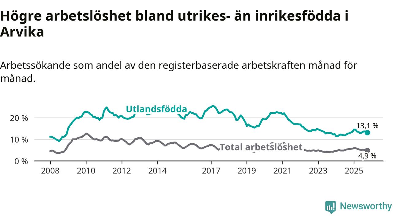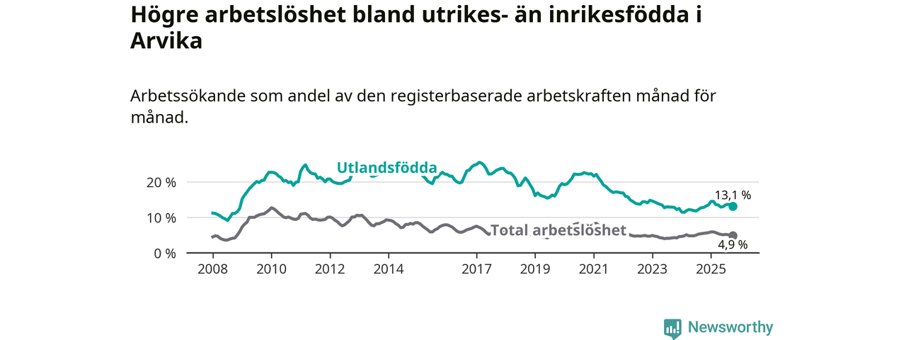 Skillnaden i arbetslöshet mellan utrikesfödda och hela befolkningen är 8,2 procentenheter i Arvika. Det är en större skillnad än för ett år sedan (+0,9 procentenheter).