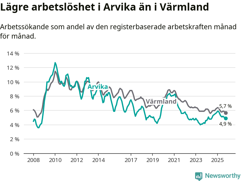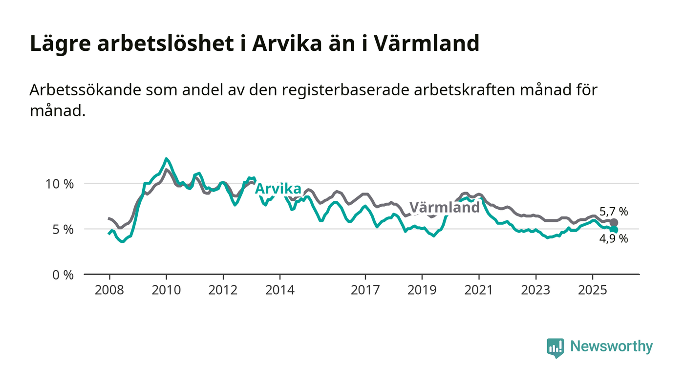 Arvika hade redan tidigare lägre arbetslöshet än snittet i hela Värmlands län och nu växer klyftan (4,9 procent i kommunen, jämfört med 5,7 procent i hela länet). Torsby har den lägsta arbetslösheten i länet (3,4 procent), medan Filipstad har den högsta (8,2 procent). För att Arvika skulle komma ner i samma arbetslöshetsnivå som Torsby skulle 175 personer behöva sysselsättas.