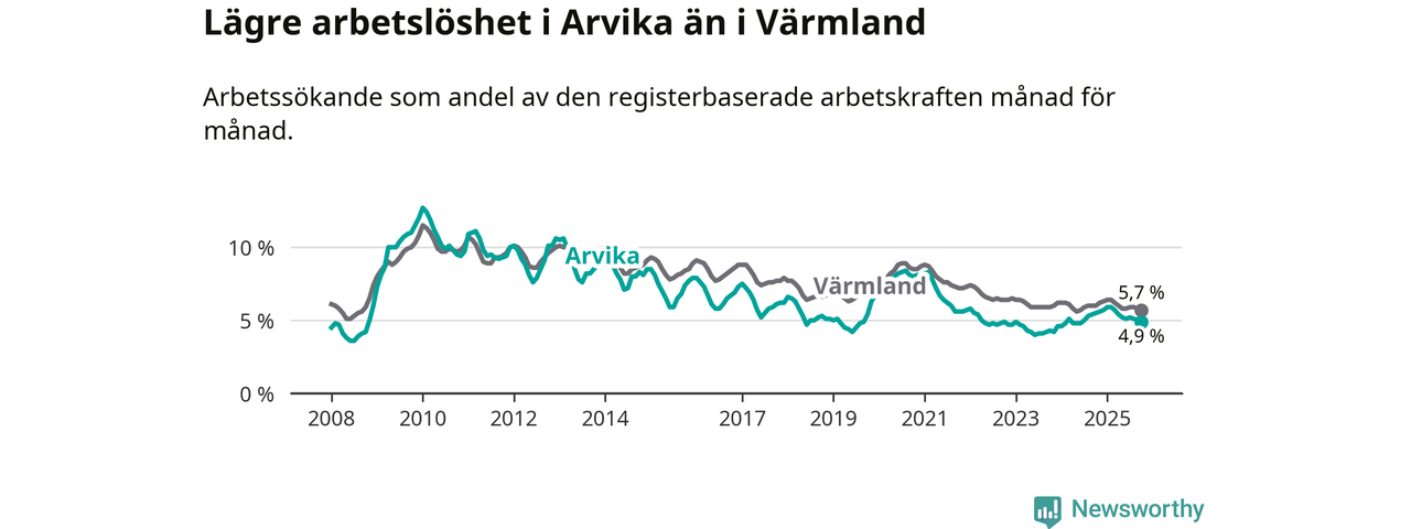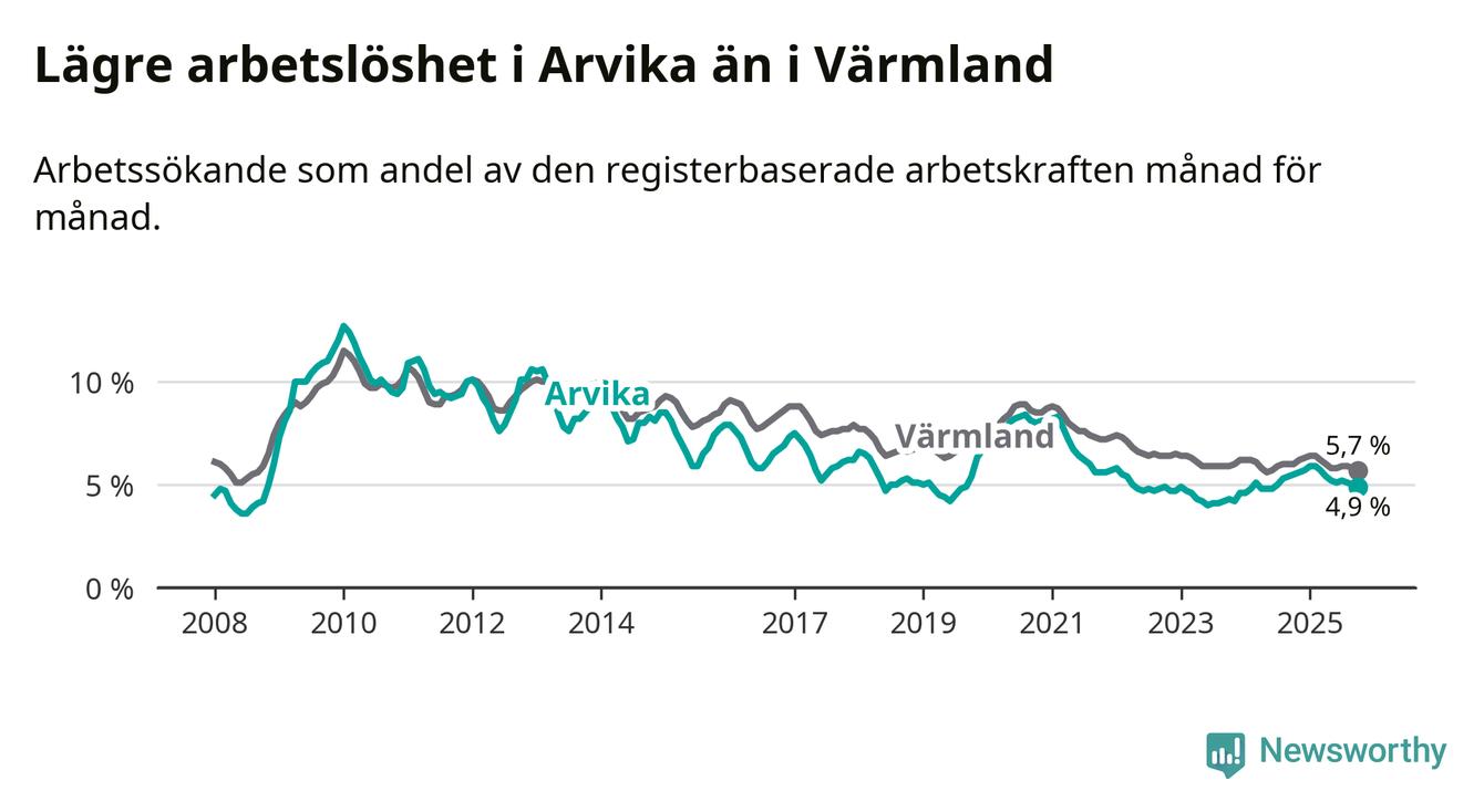 Under oktober månad rapporterade Arvika kommun en total arbetslöshet på 4,9 procent. Det är en minskning jämfört med samma tidpunkt i fjol (−0,6 procentenheter). Även i Värmlands län sjunker arbetslösheten .