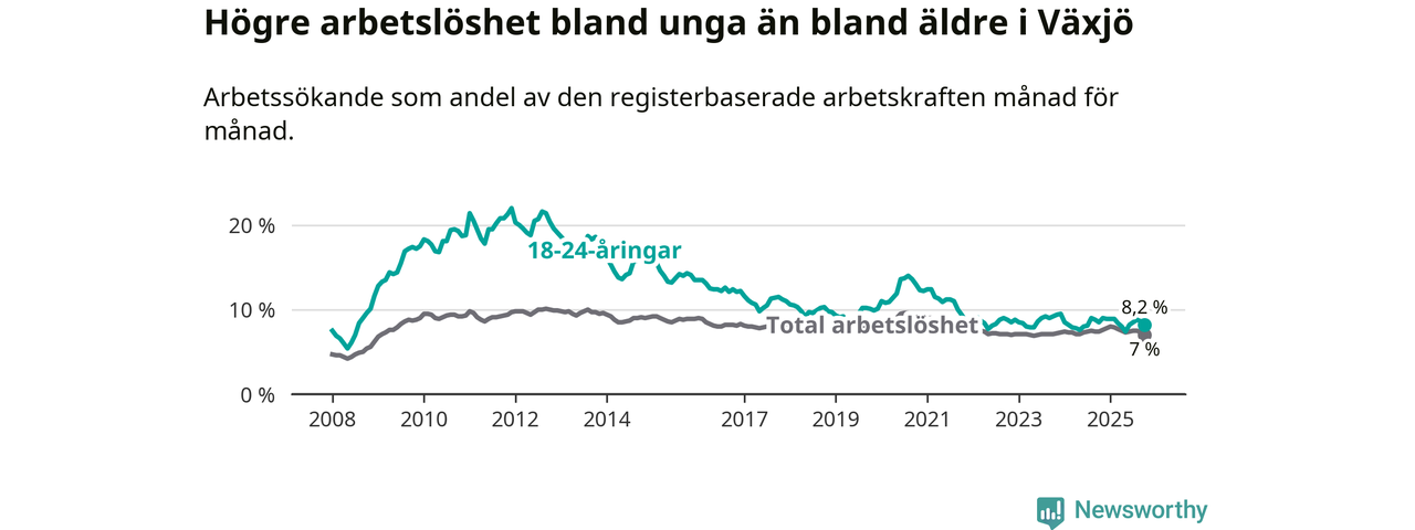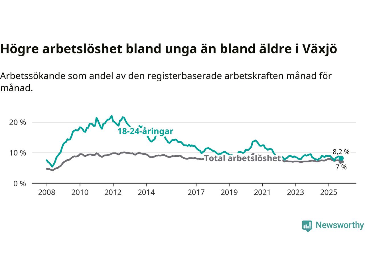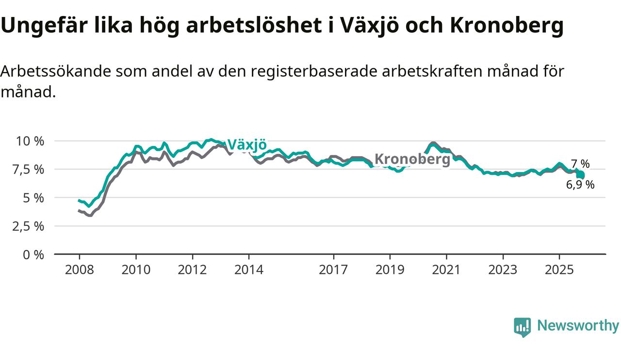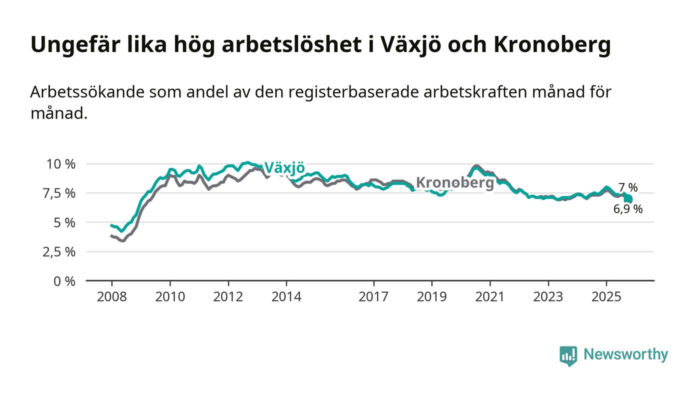 Under oktober månad rapporterade Växjö kommun en total arbetslöshet på 7,0 procent. Det är en minskning jämfört med samma tidpunkt i fjol (−0,4 procentenheter). Även i Kronobergs län sjunker arbetslösheten .
