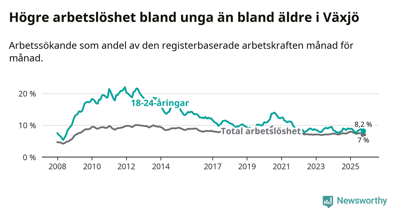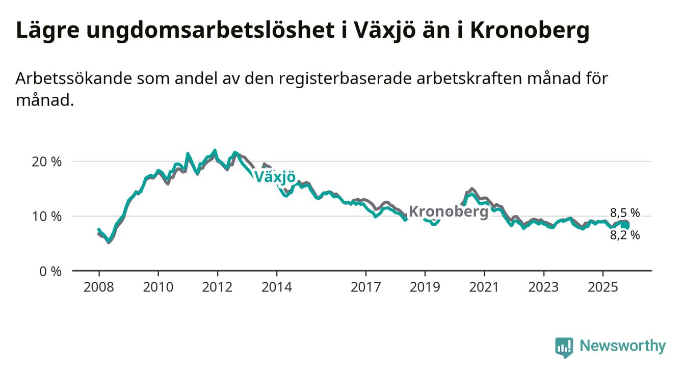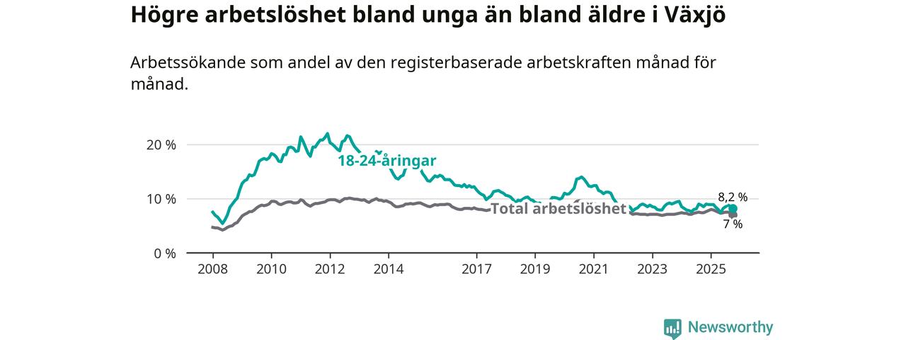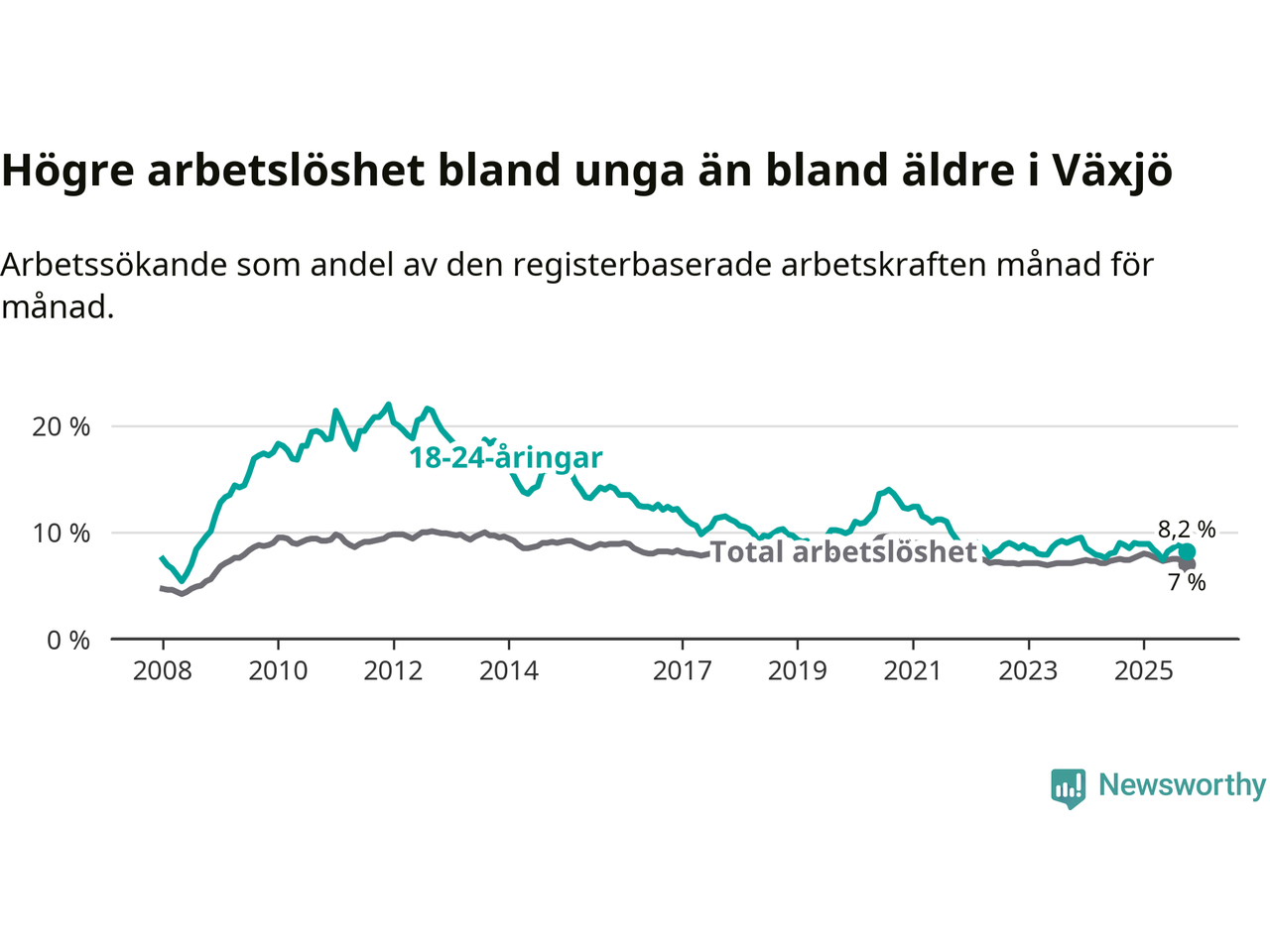 Under oktober månad rapporterade Växjö kommun en total arbetslöshet på 7,0 procent. Det är en minskning jämfört med samma tidpunkt i fjol (−0,4 procentenheter). Även i Kronobergs län sjunker arbetslösheten .