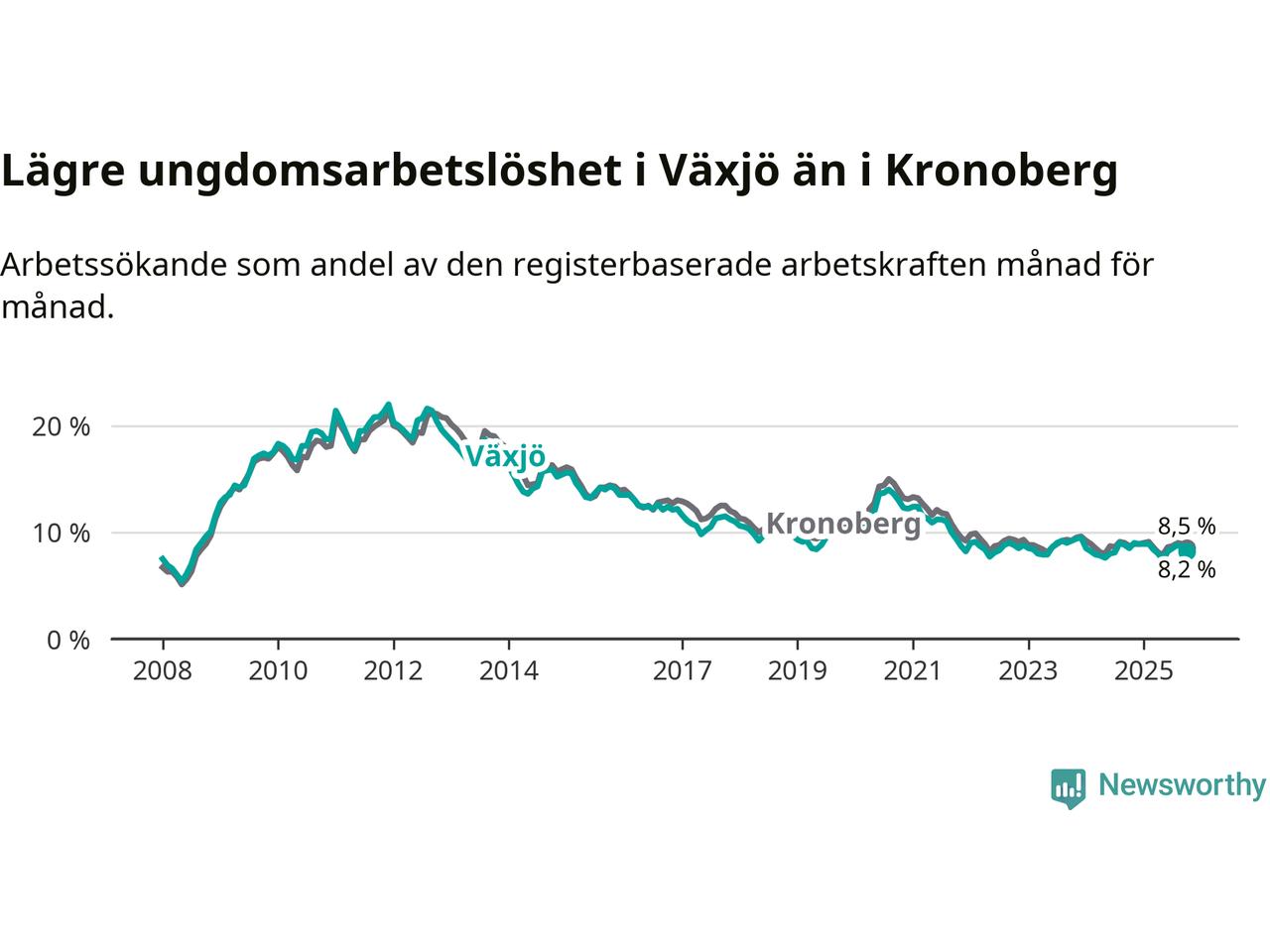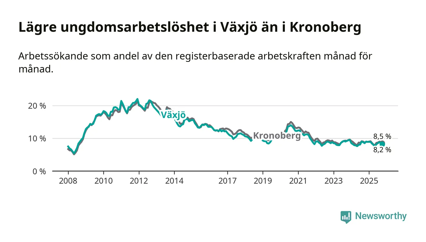 Den minskande arbetslösheten gör att Växjö nu har i stort sett samma arbetslöshetsnivå som hela Kronobergs län. Ljungby har den lägsta arbetslösheten i länet (5,0 procent), medan Lessebo har den högsta (10,0 procent). För att Växjö skulle komma ner i samma arbetslöshetsnivå som Ljungby skulle 1 003 personer behöva sysselsättas.