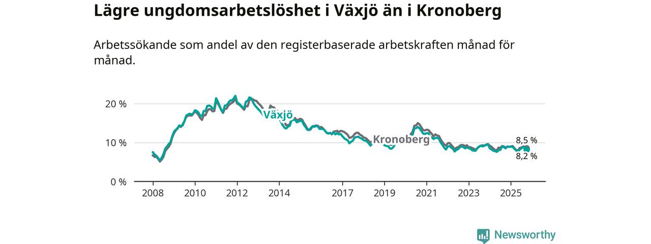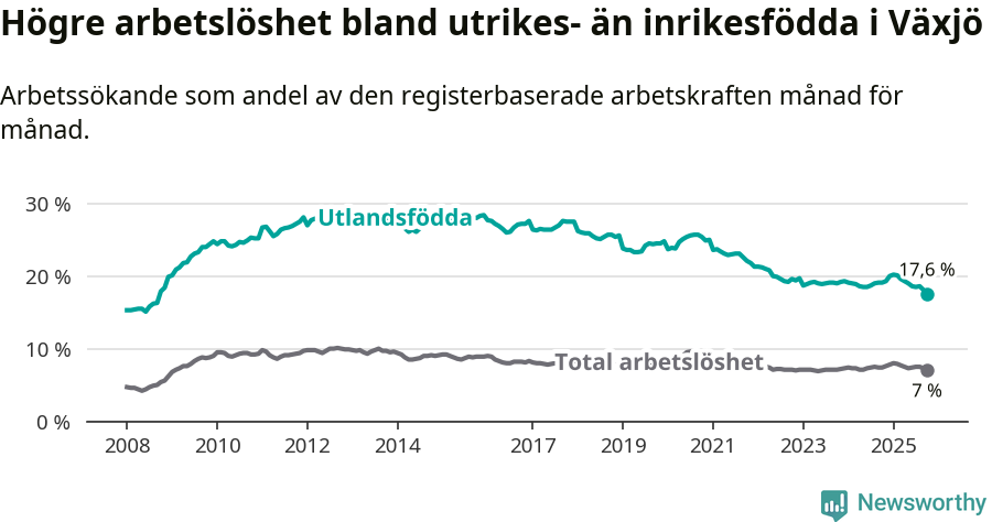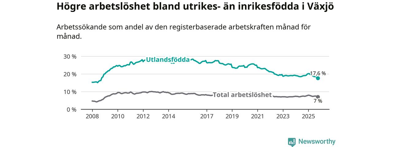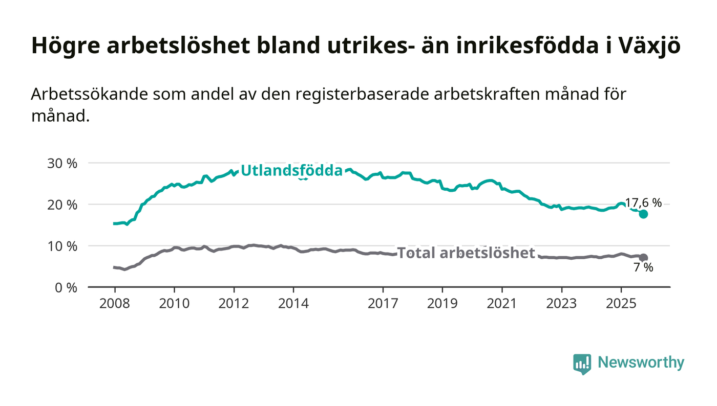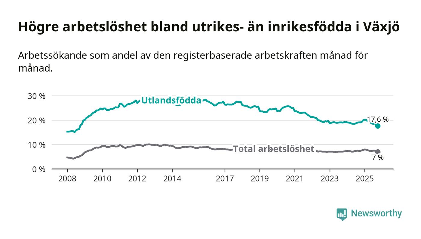 Skillnaden i arbetslöshet mellan utrikesfödda och hela befolkningen är 10,6 procentenheter i Växjö. Det är en mindre skillnad än för ett år sedan (−1,1 procentenheter).