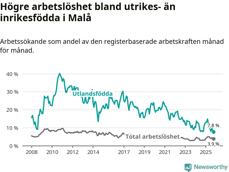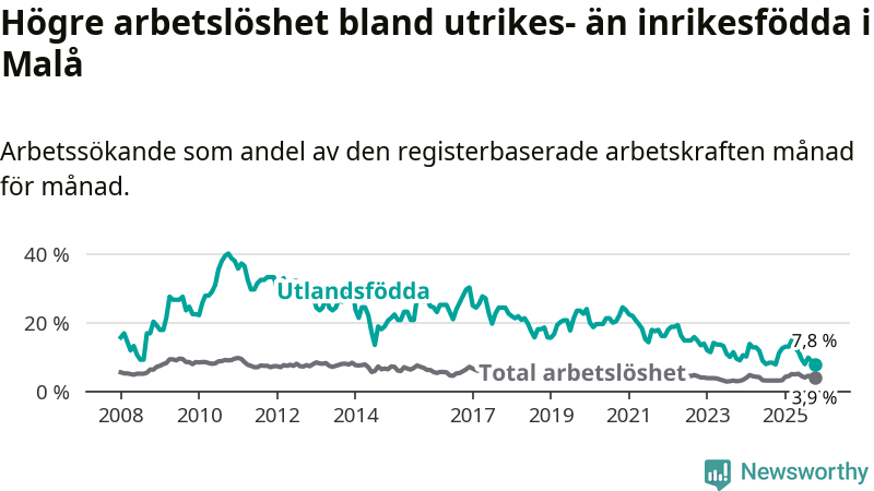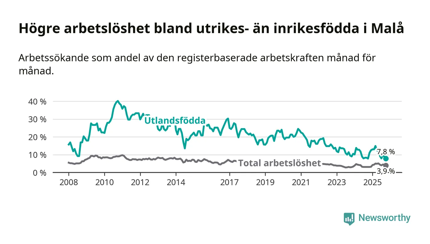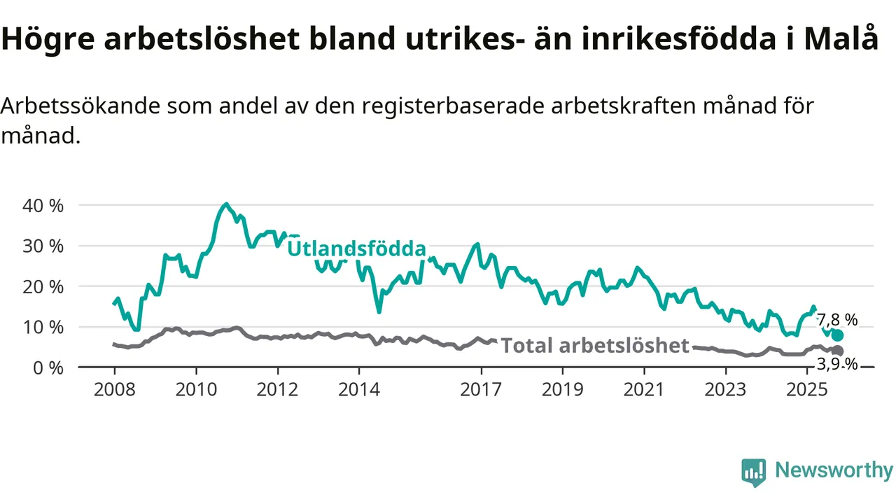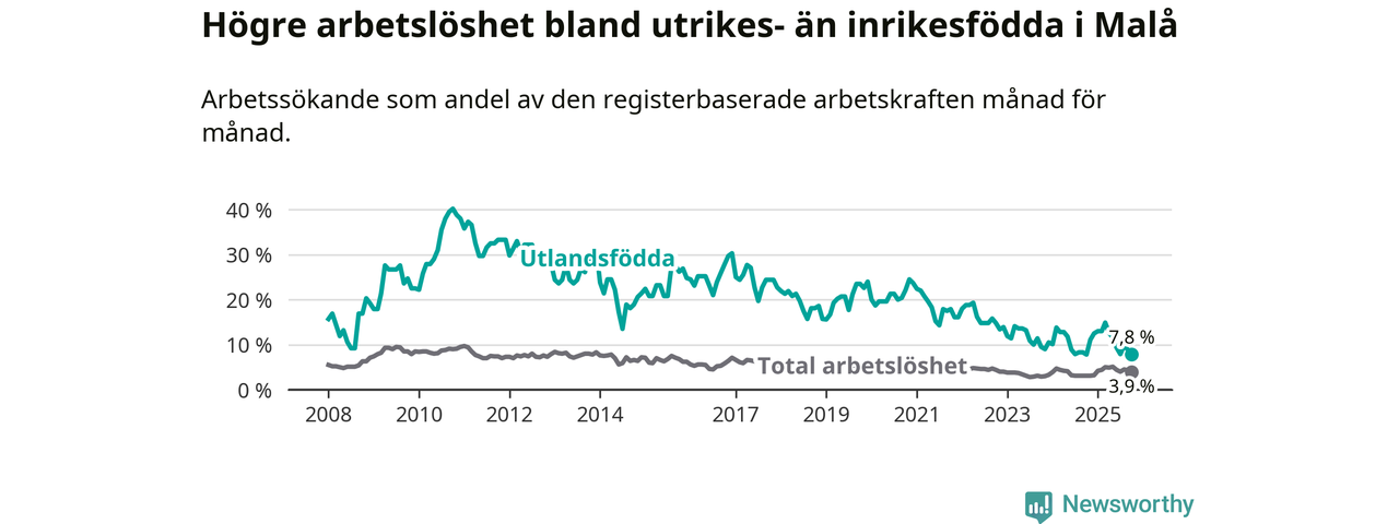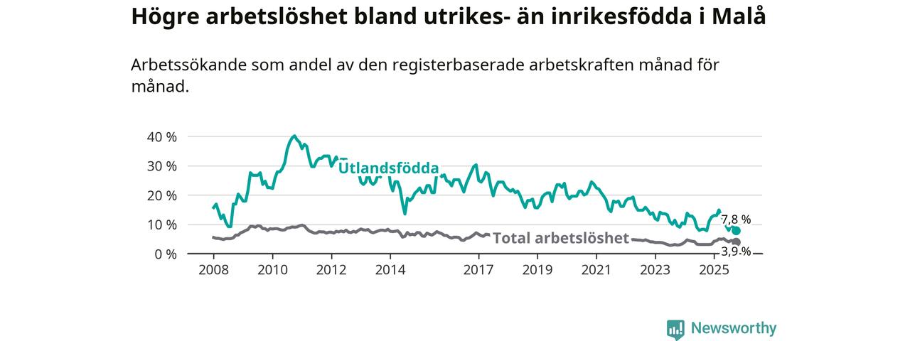 Skillnaden i arbetslöshet mellan utrikesfödda och hela befolkningen är 3,9 procentenheter i Malå. Det är en mindre skillnad än för ett år sedan (−0,8 procentenheter).