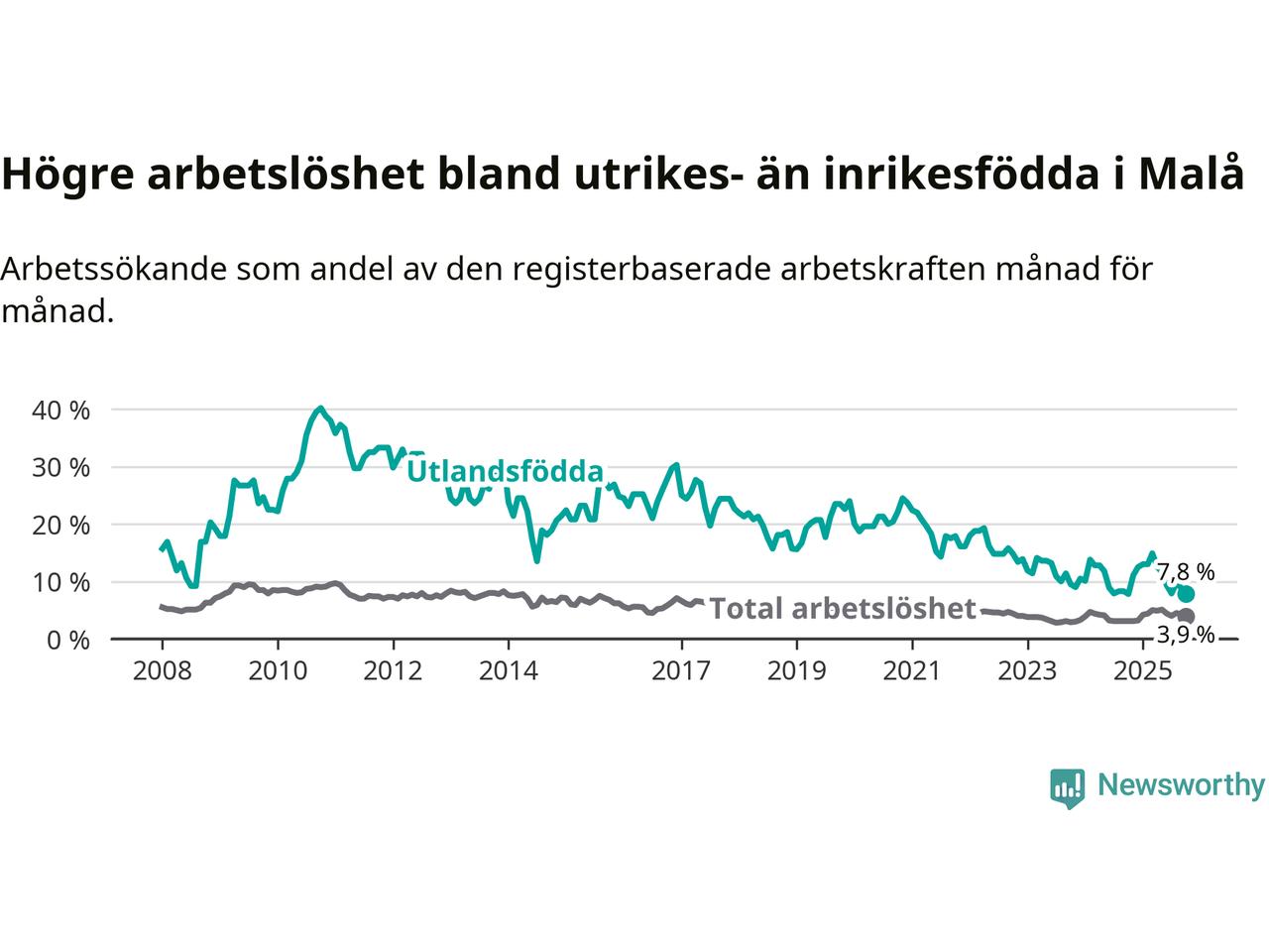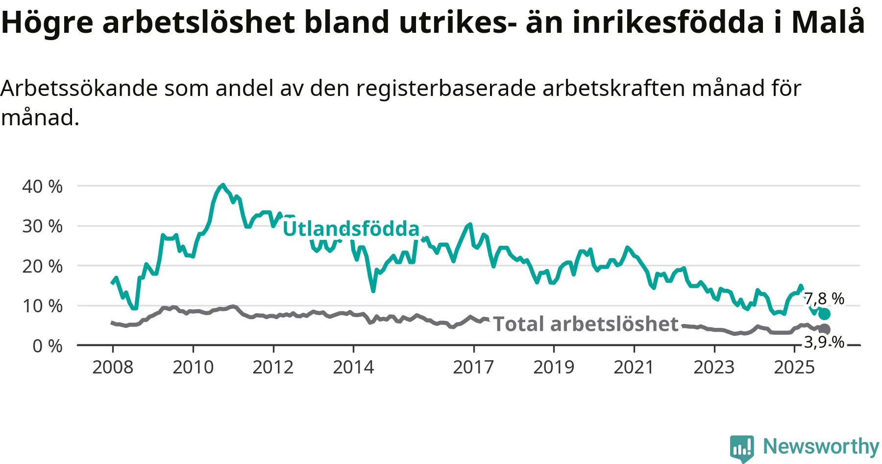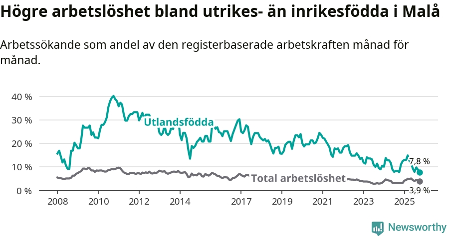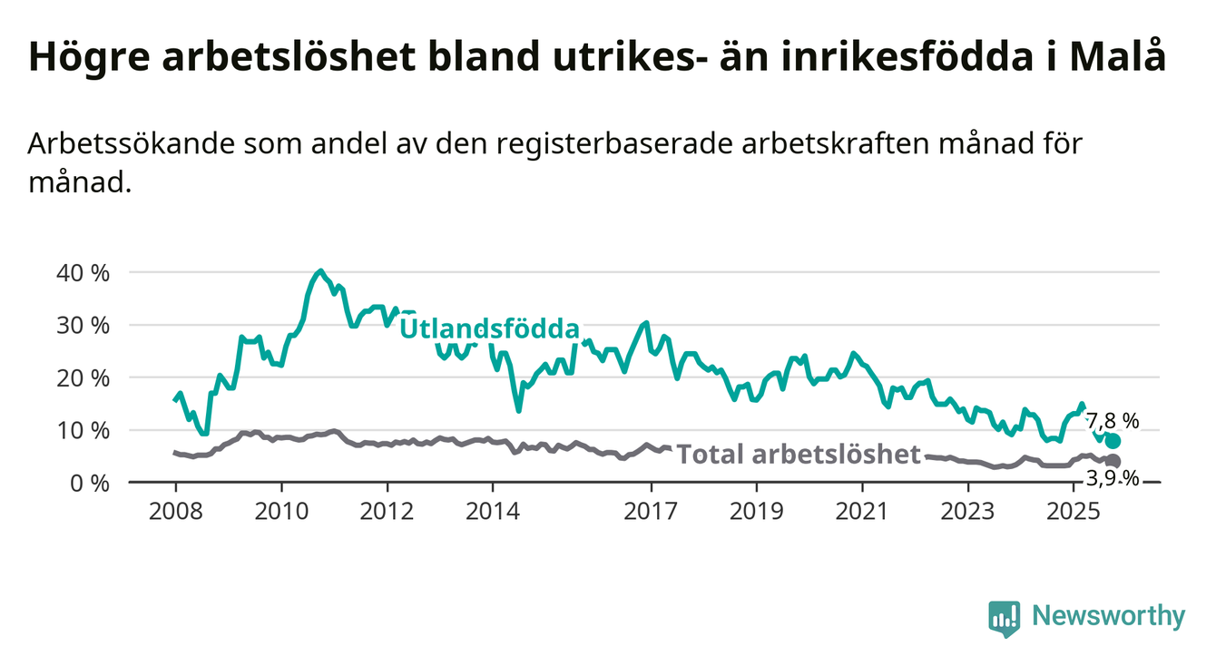 Skillnaden i arbetslöshet mellan utrikesfödda och hela befolkningen är 3,9 procentenheter i Malå. Det är en mindre skillnad än för ett år sedan (−0,8 procentenheter).