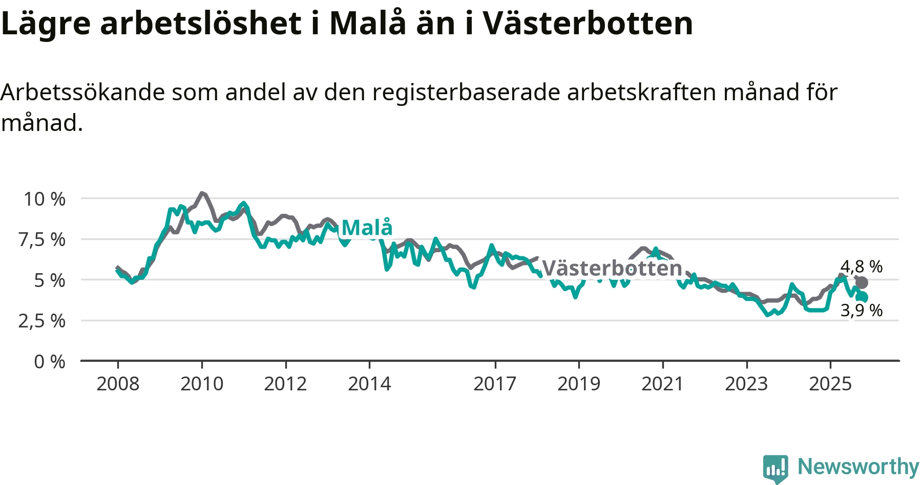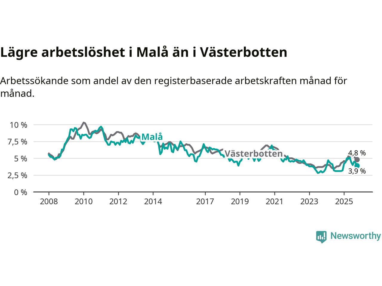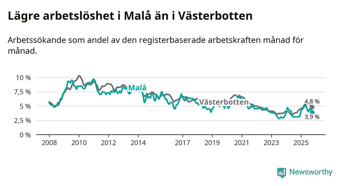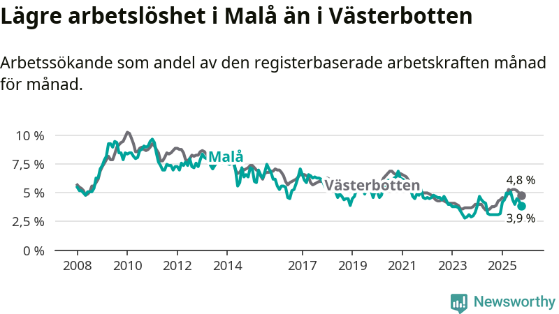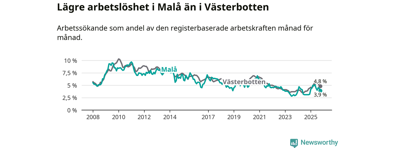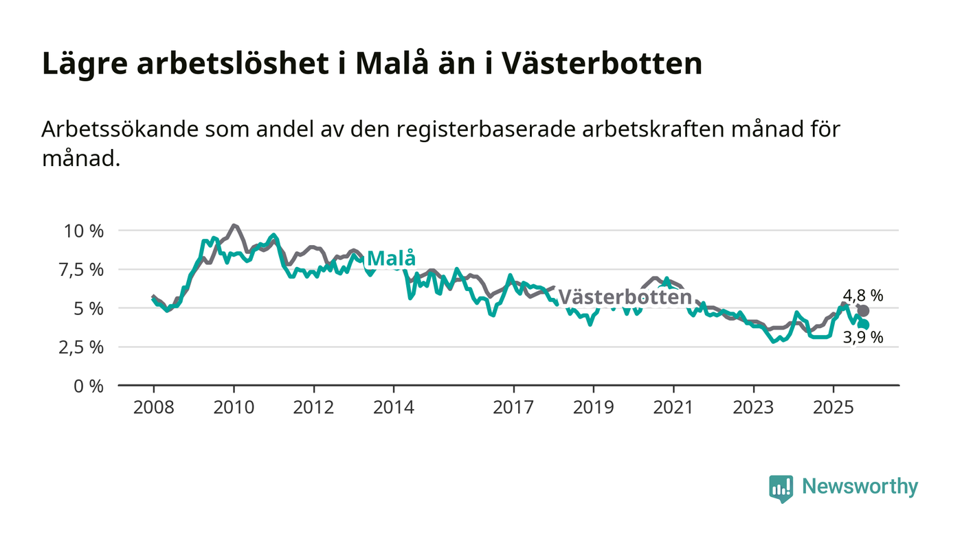 Även om arbetslösheten i Malå alltså ökar, så ligger den fortfarande under snittet i hela Västerbottens län (3,9 procent i kommunen, jämfört med 4,8 procent i hela länet). Vindeln har den lägsta arbetslösheten i länet (3,1 procent), medan Skellefteå har den högsta (6,5 procent). För att Malå skulle komma ner i samma arbetslöshetsnivå som Vindeln skulle elva personer behöva sysselsättas.