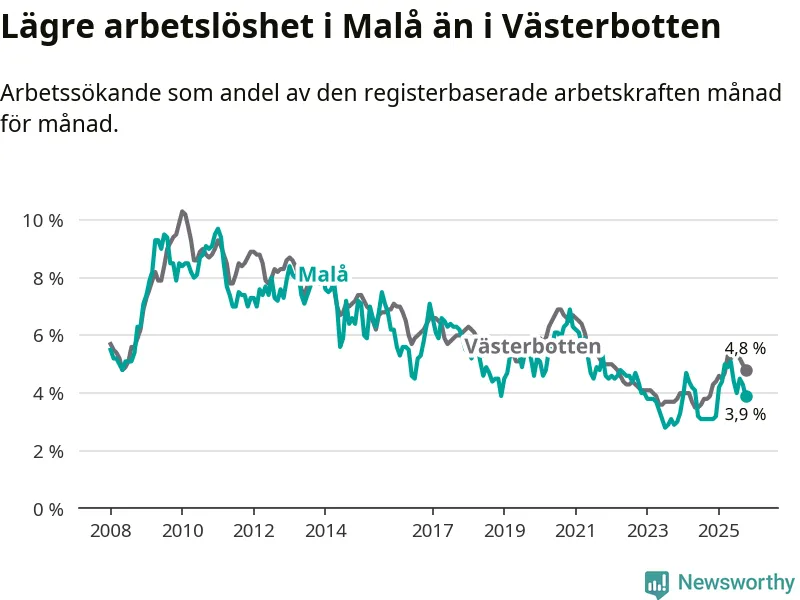 Under oktober månad rapporterade Malå kommun en total arbetslöshet på 3,9 procent. Det är en ökning jämfört med samma tidpunkt i fjol (+0,8 procentenheter). Även i Västerbottens län stiger arbetslösheten .